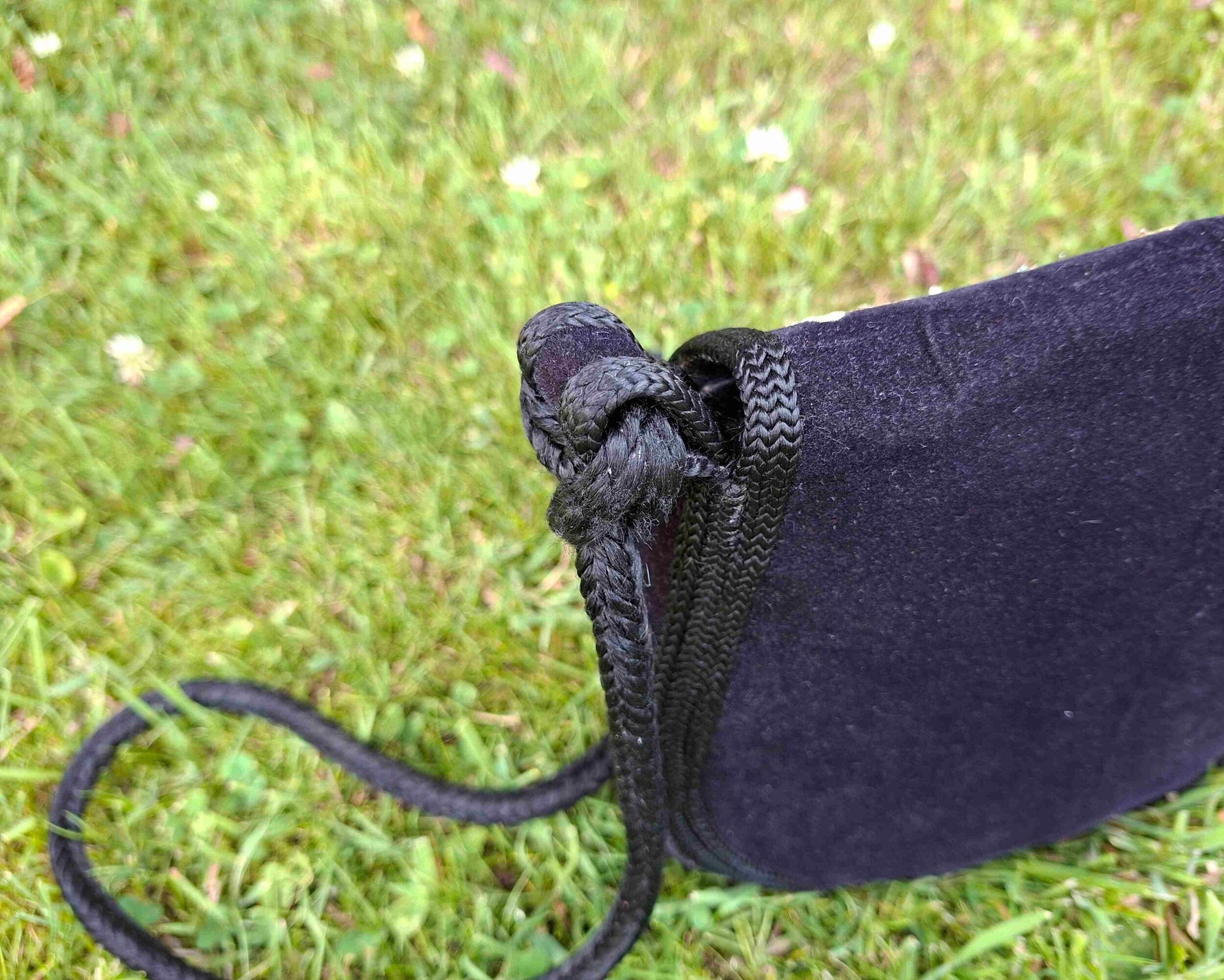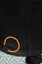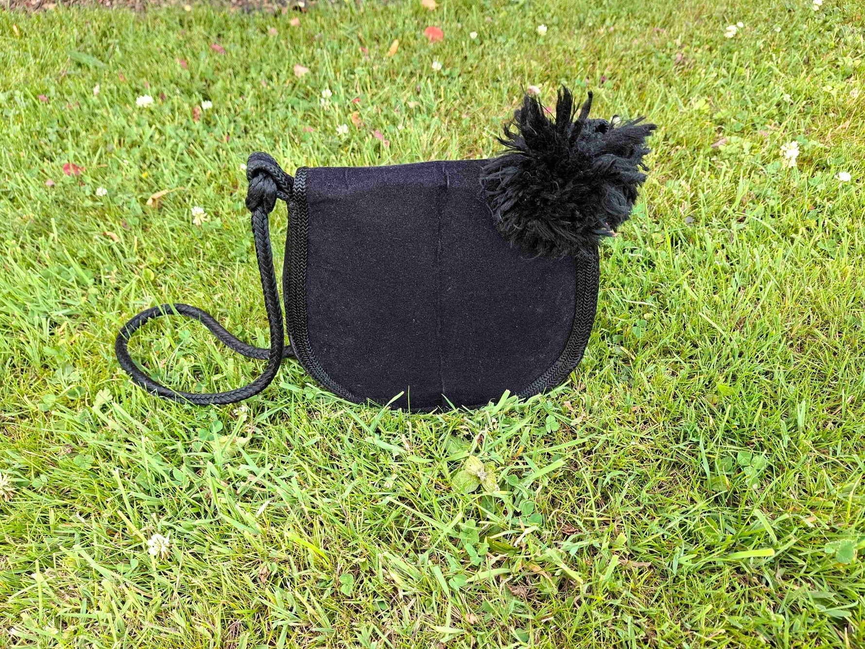 Broderie sur le rabat, pompon et bouton avec bride pour fermer