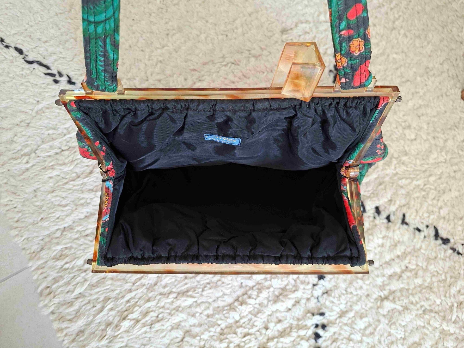 La structure du haut du sac est en bakélite ambré typique de la période seventies avec son clip pour la fermeture