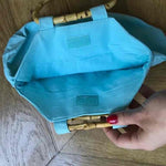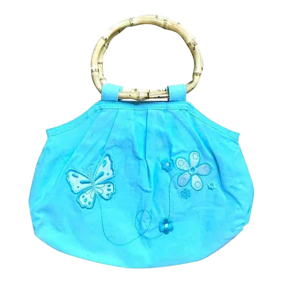 Prix unitaire parPetit sac à main en tissu de coton bleu turquoise avec des broderies papillon. Poignée ronde en bambou et fermeture par un scratch années 2000. Excellent état, aucun défaut.