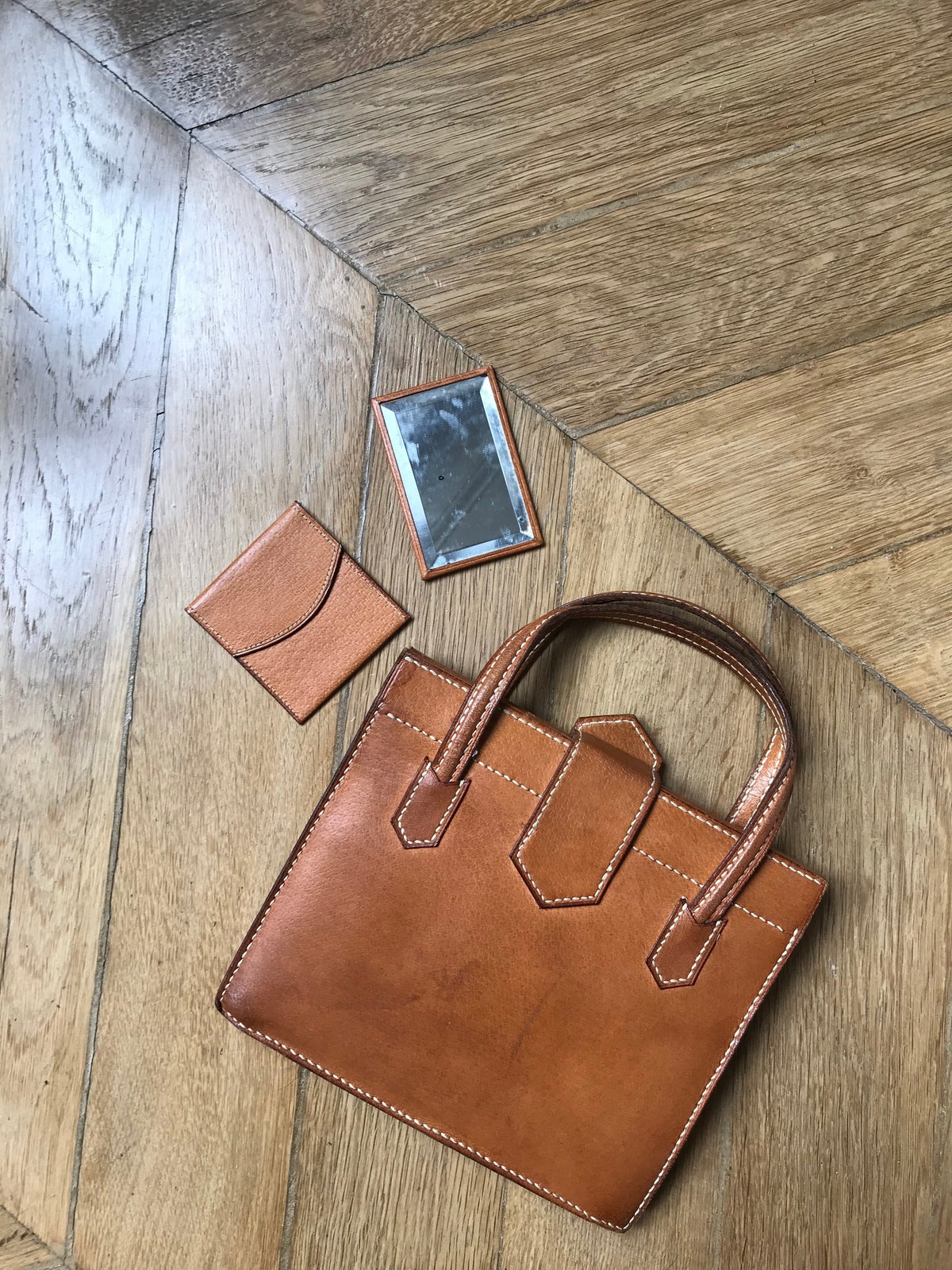 Fermeture en cuir rigide, vient avec ses deux accessoires ; un miroir doublé de cuir et une petite pochette avec fermeture pression. Pochettes intérieures et parfait état ! Pièce intemporelle.