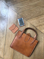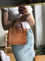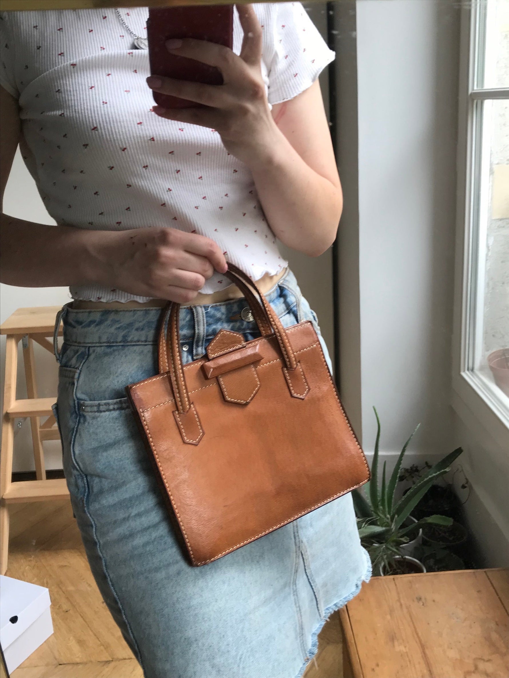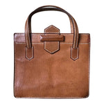 Petit sac à main rigide format carré - en cuir couleur beige camel naturel "gold". De la marque mythique "Old England" Paris (Boulevard des Capucines, 75009 Paris), magasin emblématique de Paris (1867-2012). Ici il date des années 60.