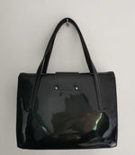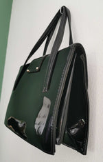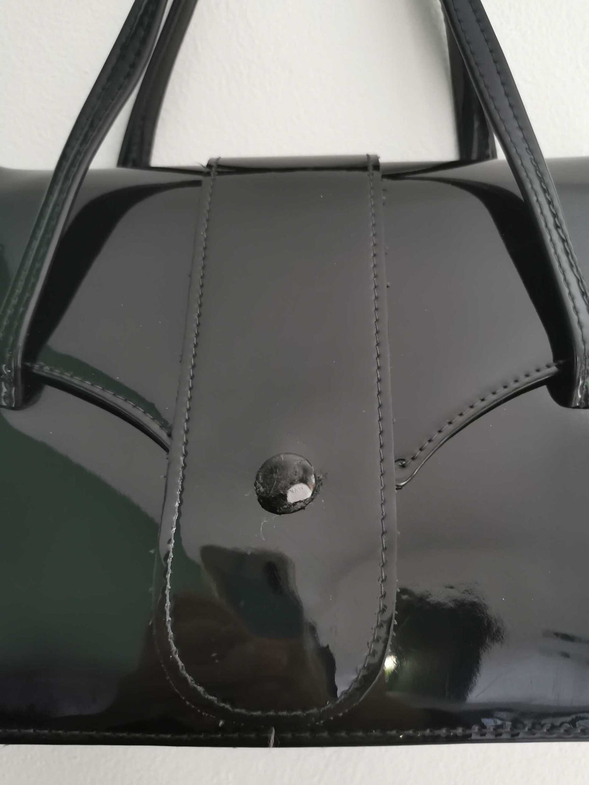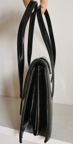 Prix unitaire parSac à main en vinyle noir brillant 60's. Porté main avec 2 anses. 2 compartiments et 1 pochette à l'intérieur. Fermeture à rabat et pression.
