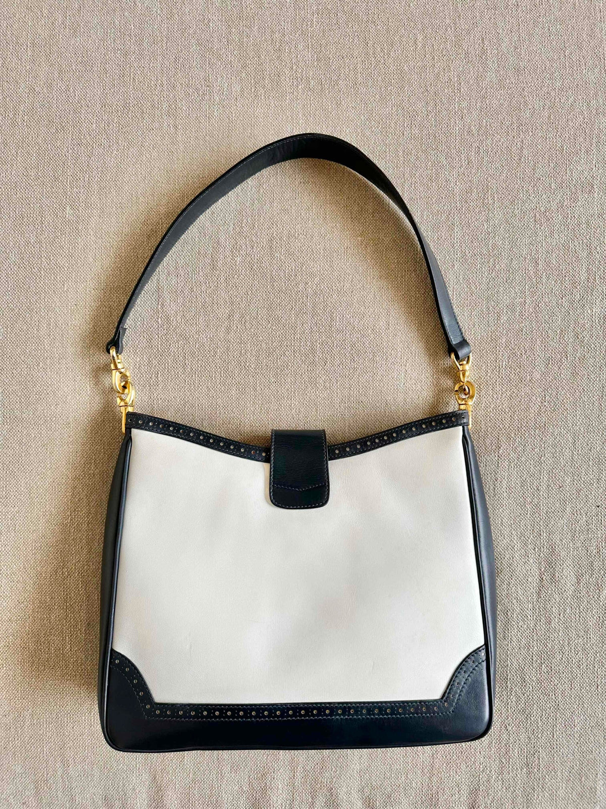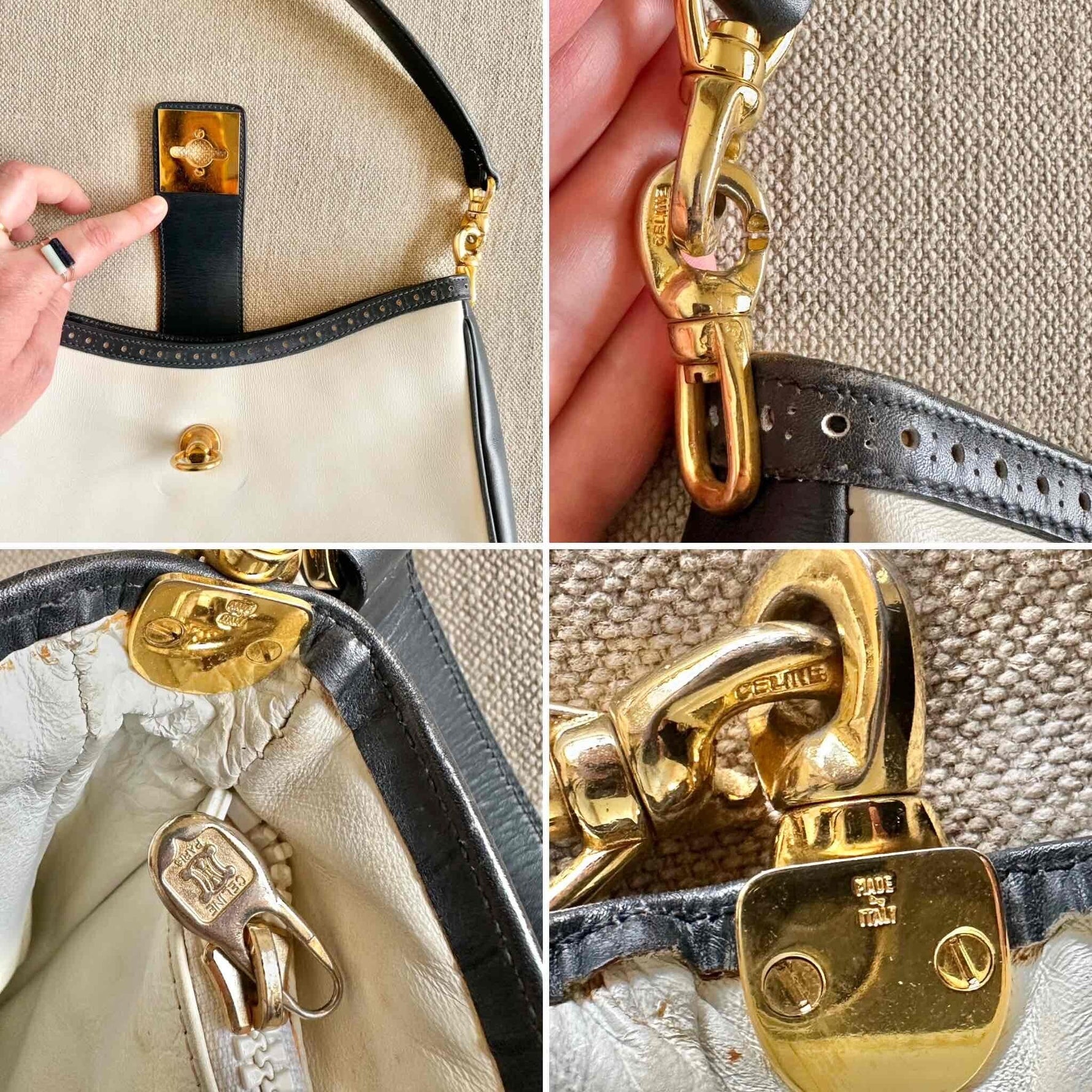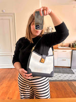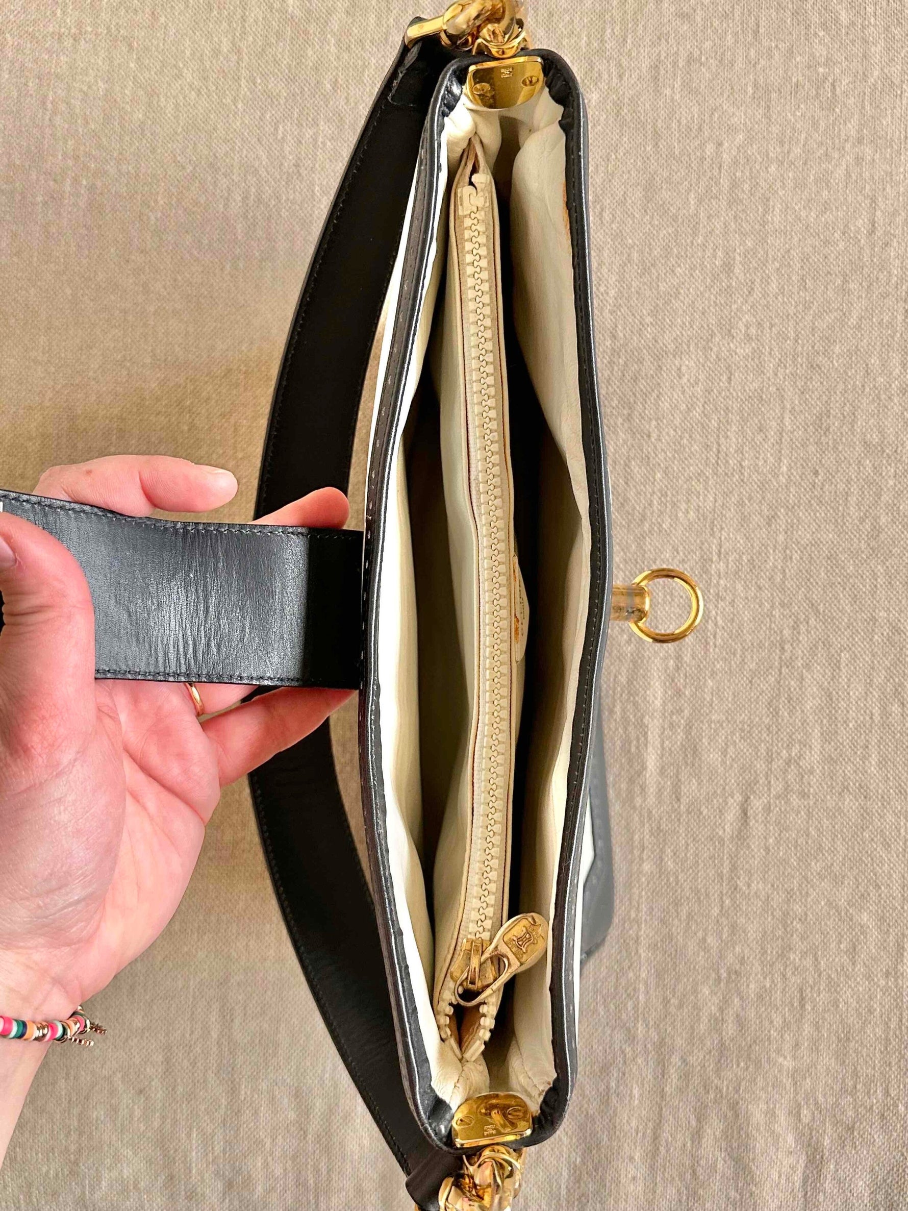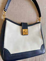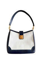 Prix unitaire parSac en cuir Celine, porté épaules, en cuir blanc creme et bleu marine, fermoir à gousset doré, 3 compartiments interieurs dont un zippé.