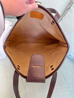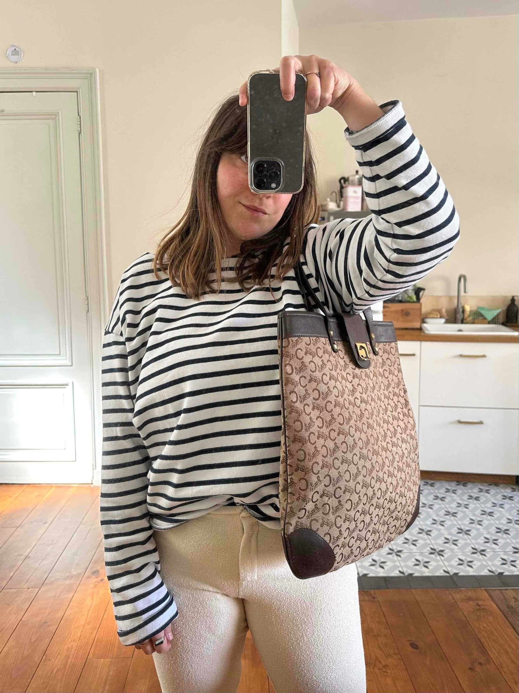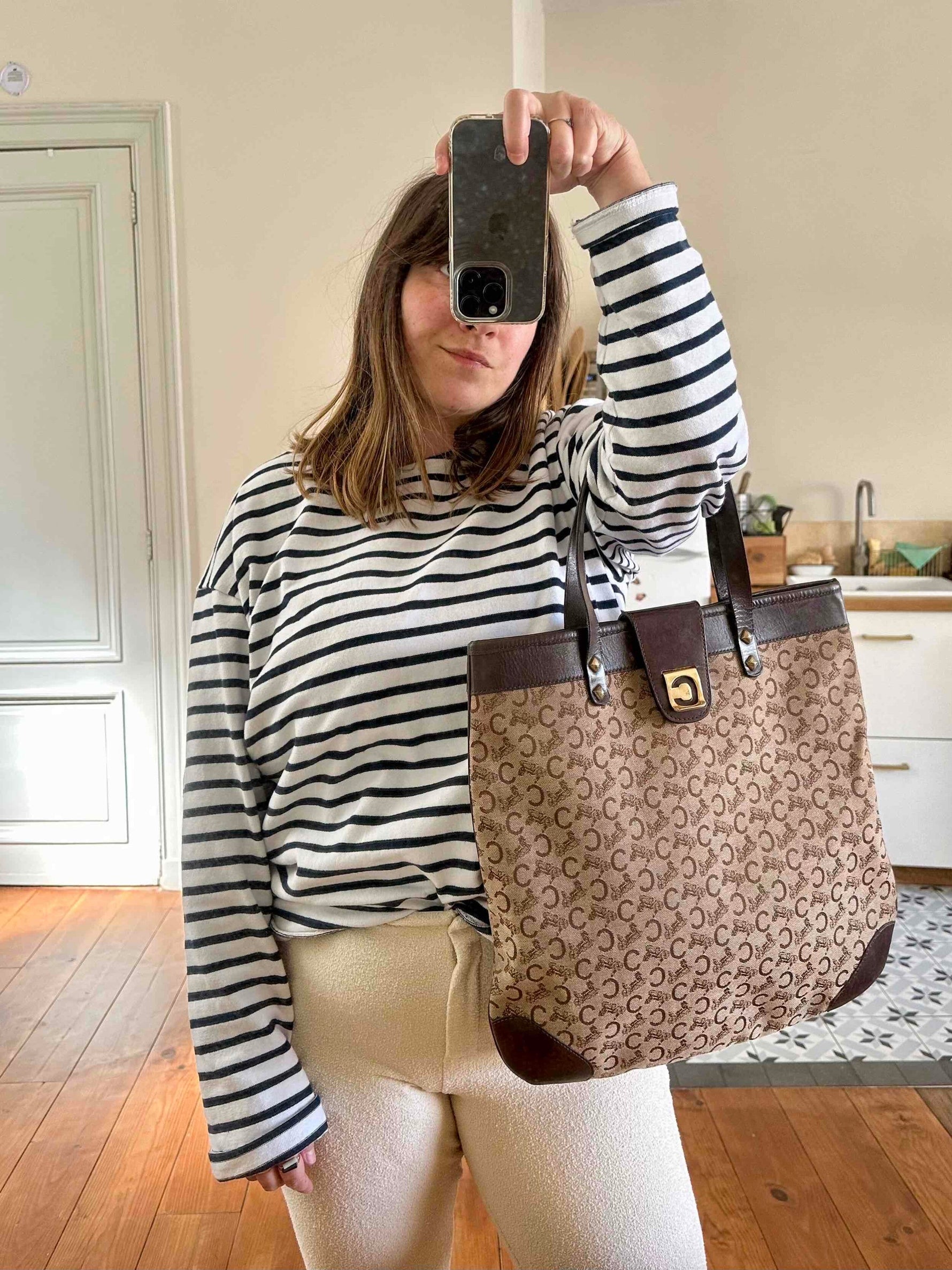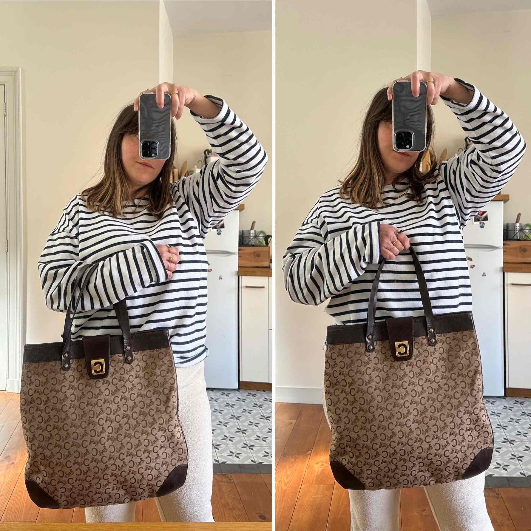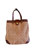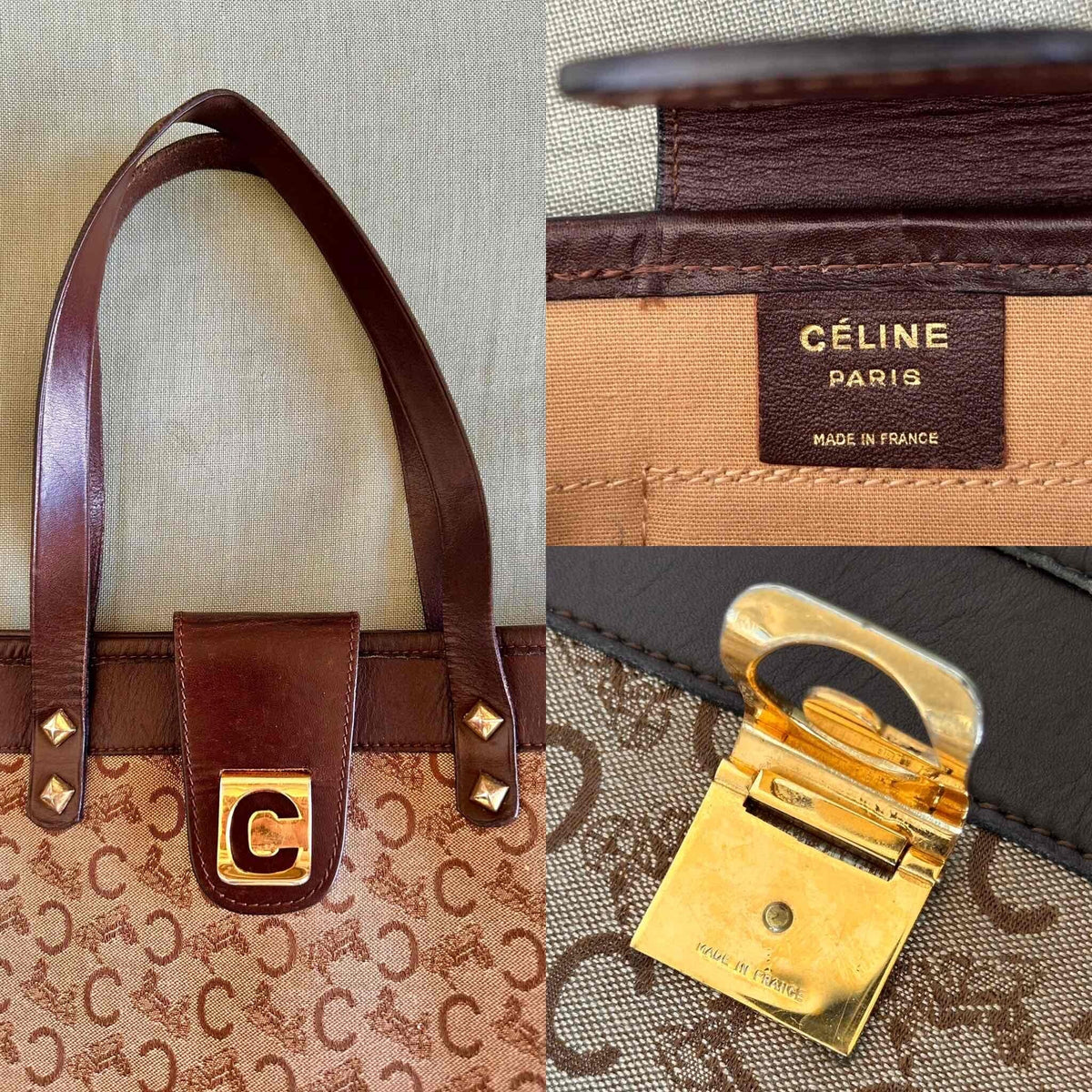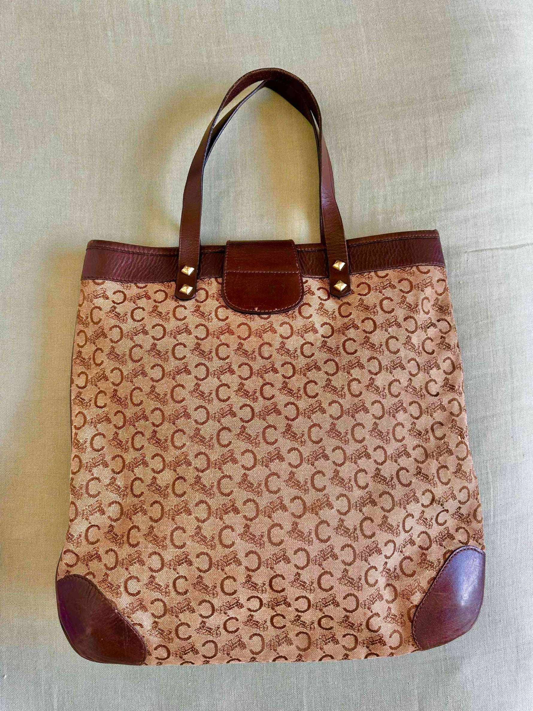 Prix unitaire parCabas Macadam Céline, en cuir brun et toile jacquard monogrammée Macadam, fermoir en metal doré C incrusté, fabriqué en France, format maxi, 40cm x 40cm, hauteur anses 19cm.