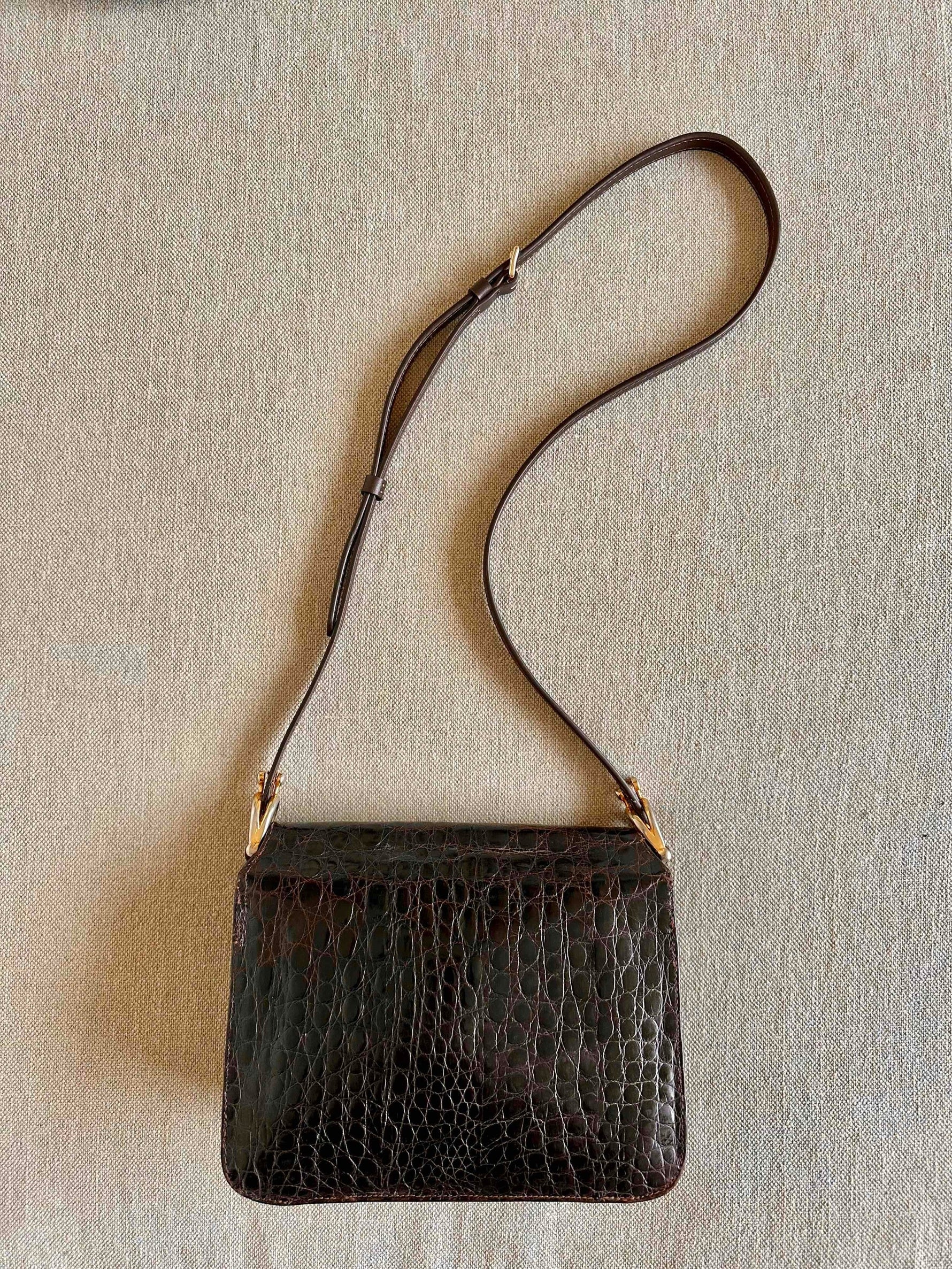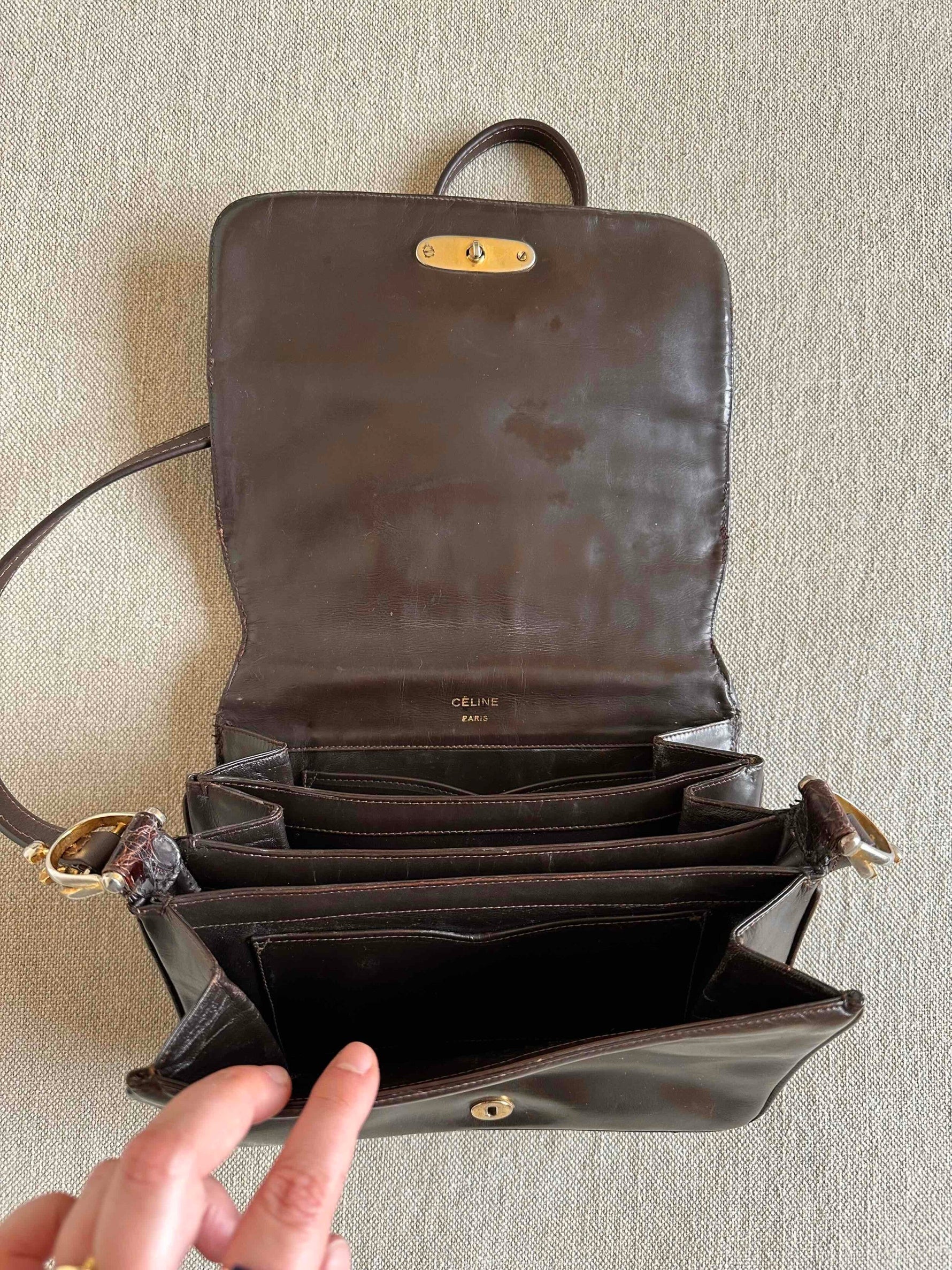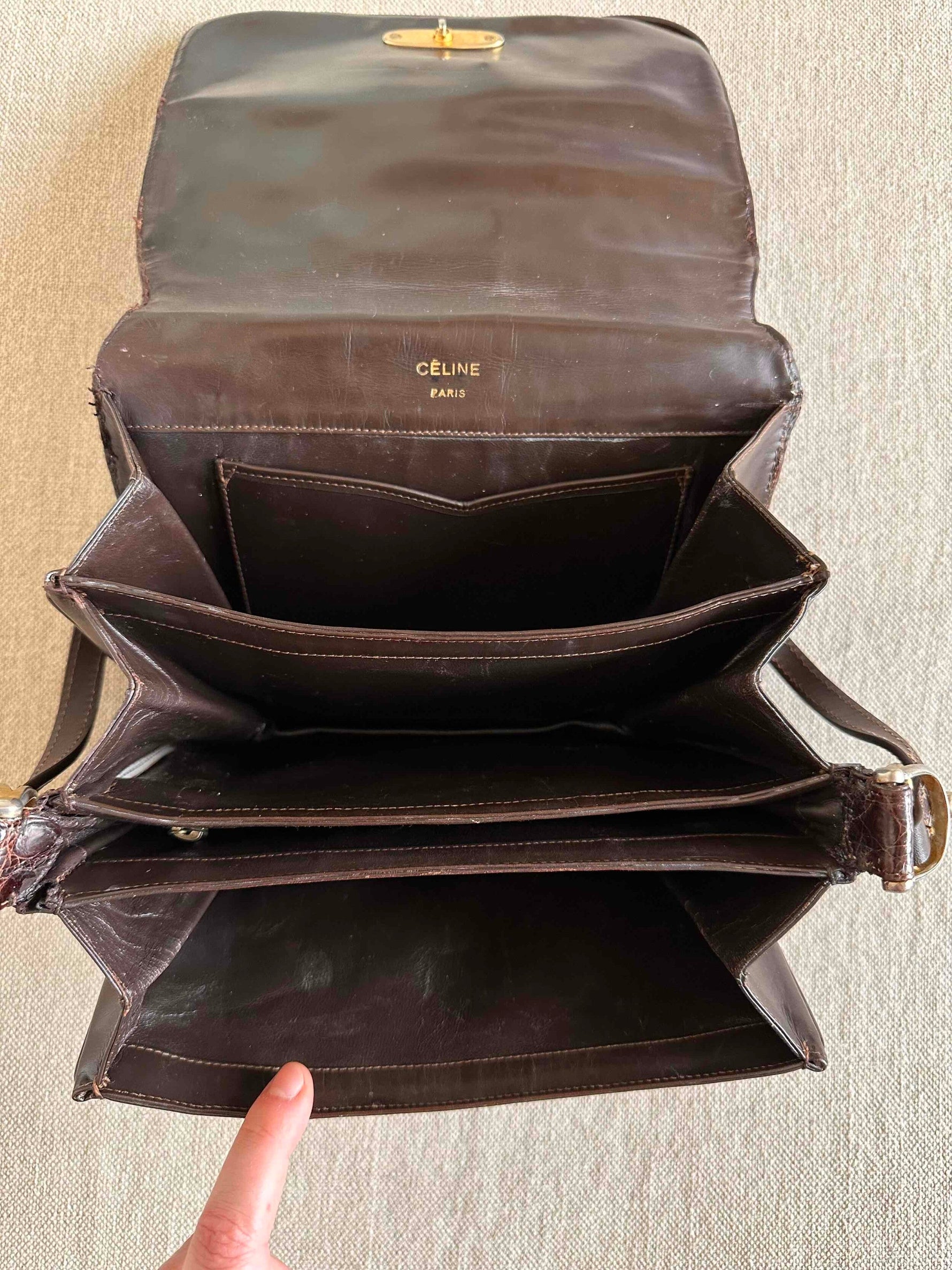 Prix unitaire parSac en cuir Céline, cuir de crocodile marron chocolat, fermoir à tourner motif étrier, 4 compartiments interieurs, bandouliere reglable.