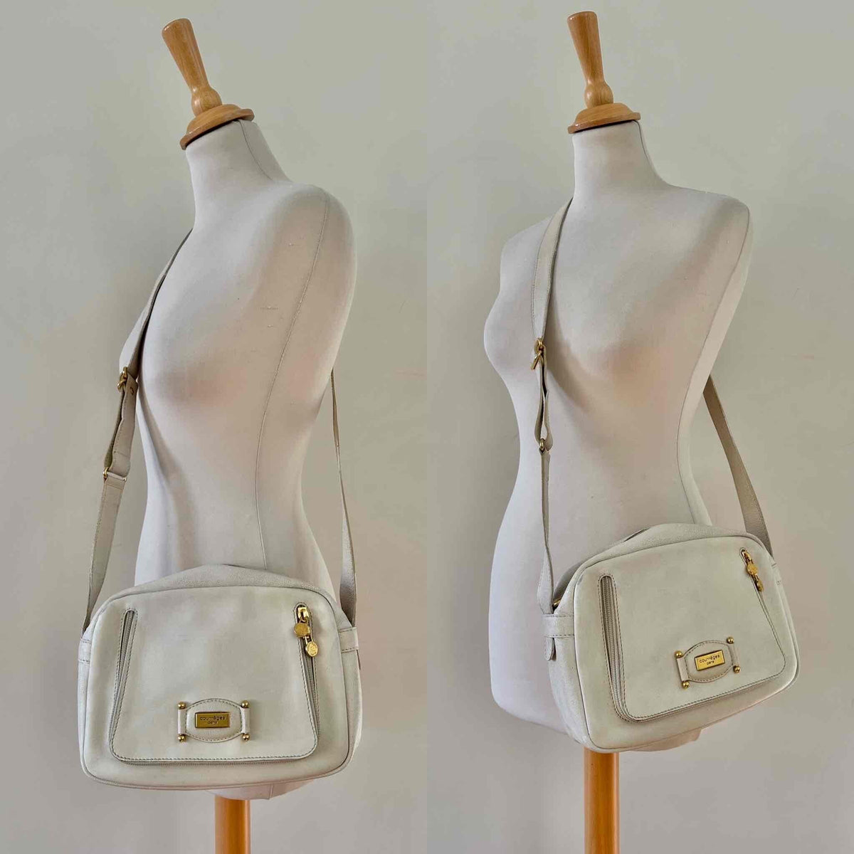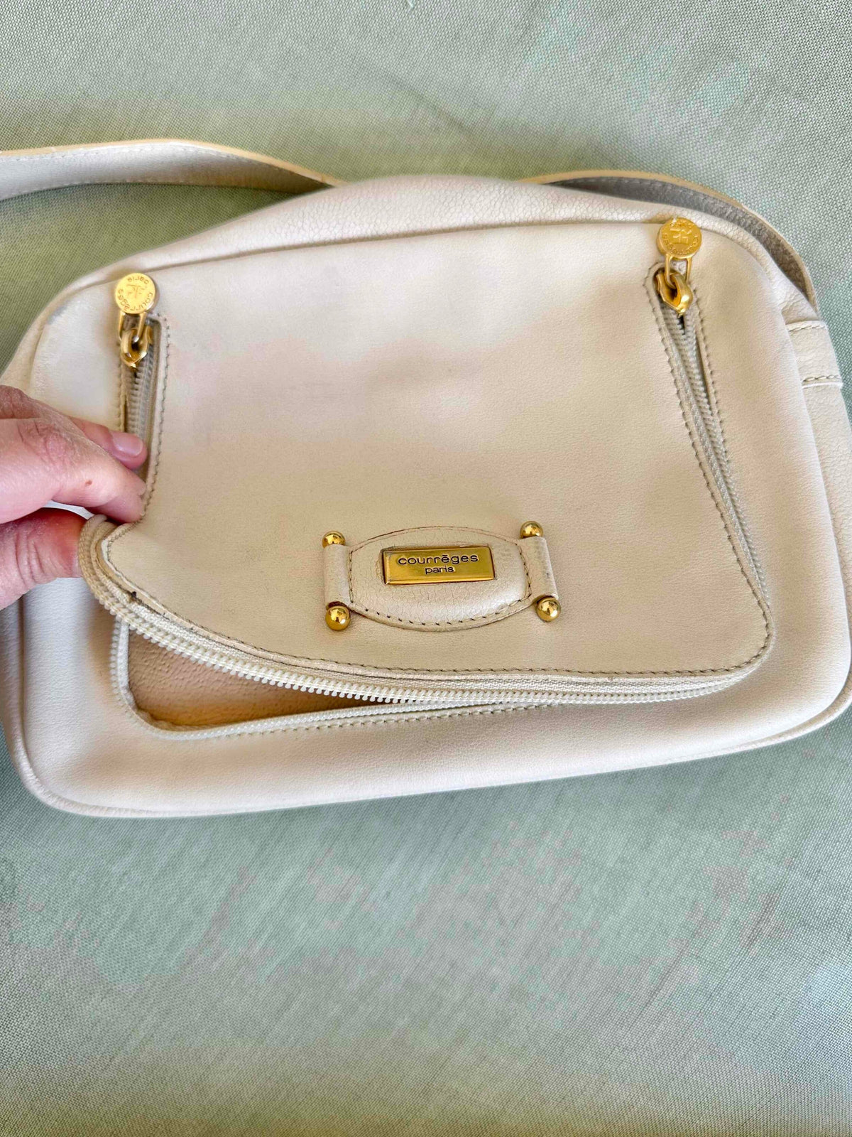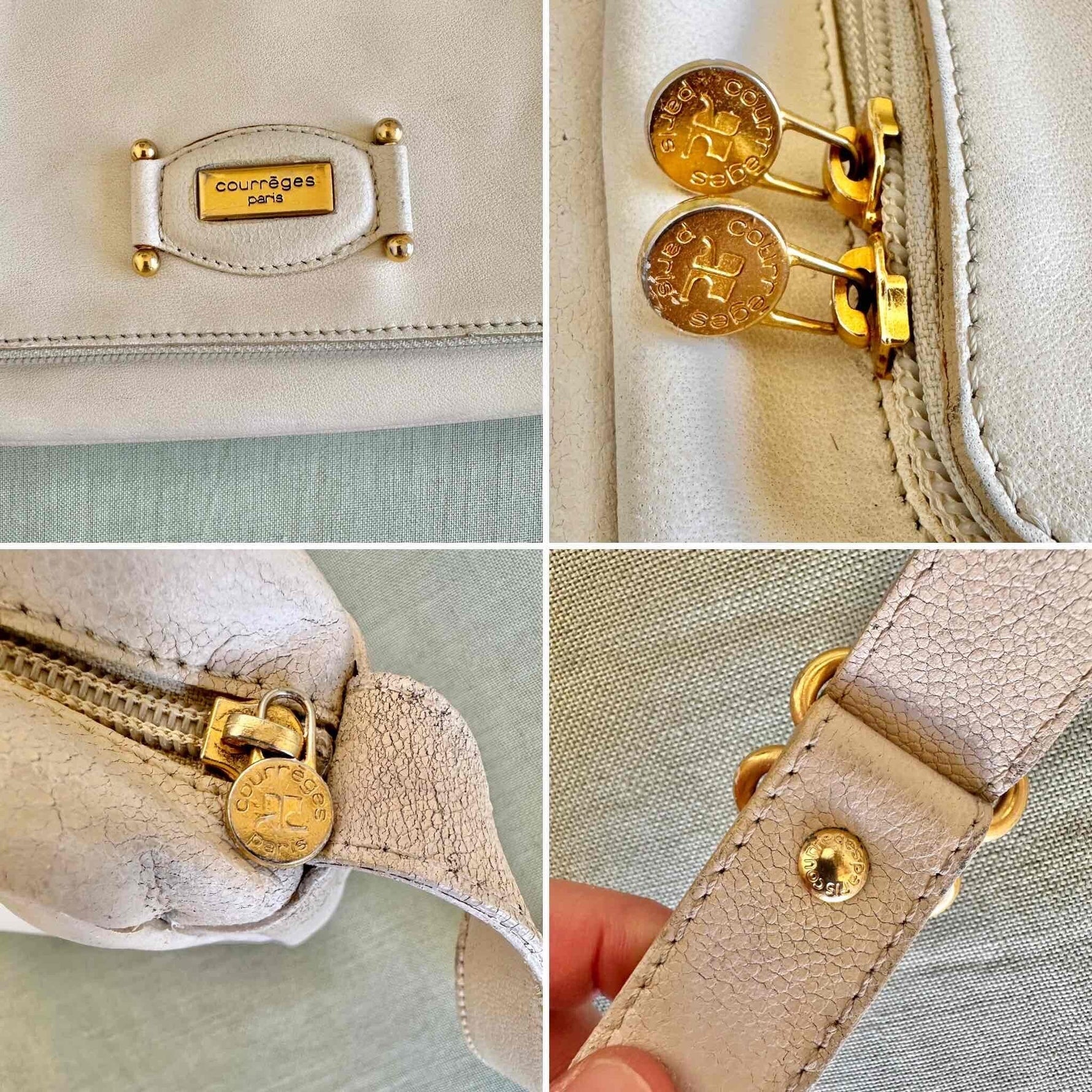 Prix unitaire parSac en cuir Courrèges, cuir lisse et craquelé blanc crème, format camera-bag, boucleries dorées gravées Courreges, une pochette à rabat zippé et porte-carte devant, un compartiment intérieur avec pochette zippée, bandoulière réglable par une boucle à glissière, fabriqué en France, années 80s. H 18cm x L 24cm x P 7cm, longueur bandoulière totale 120cm.