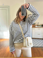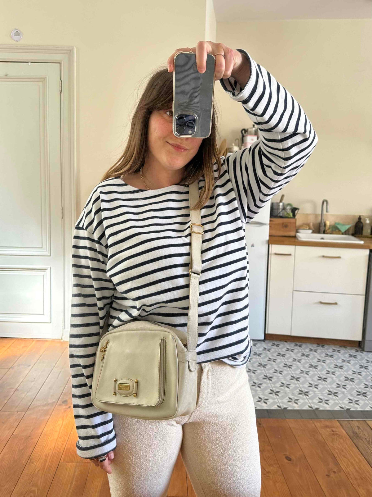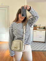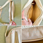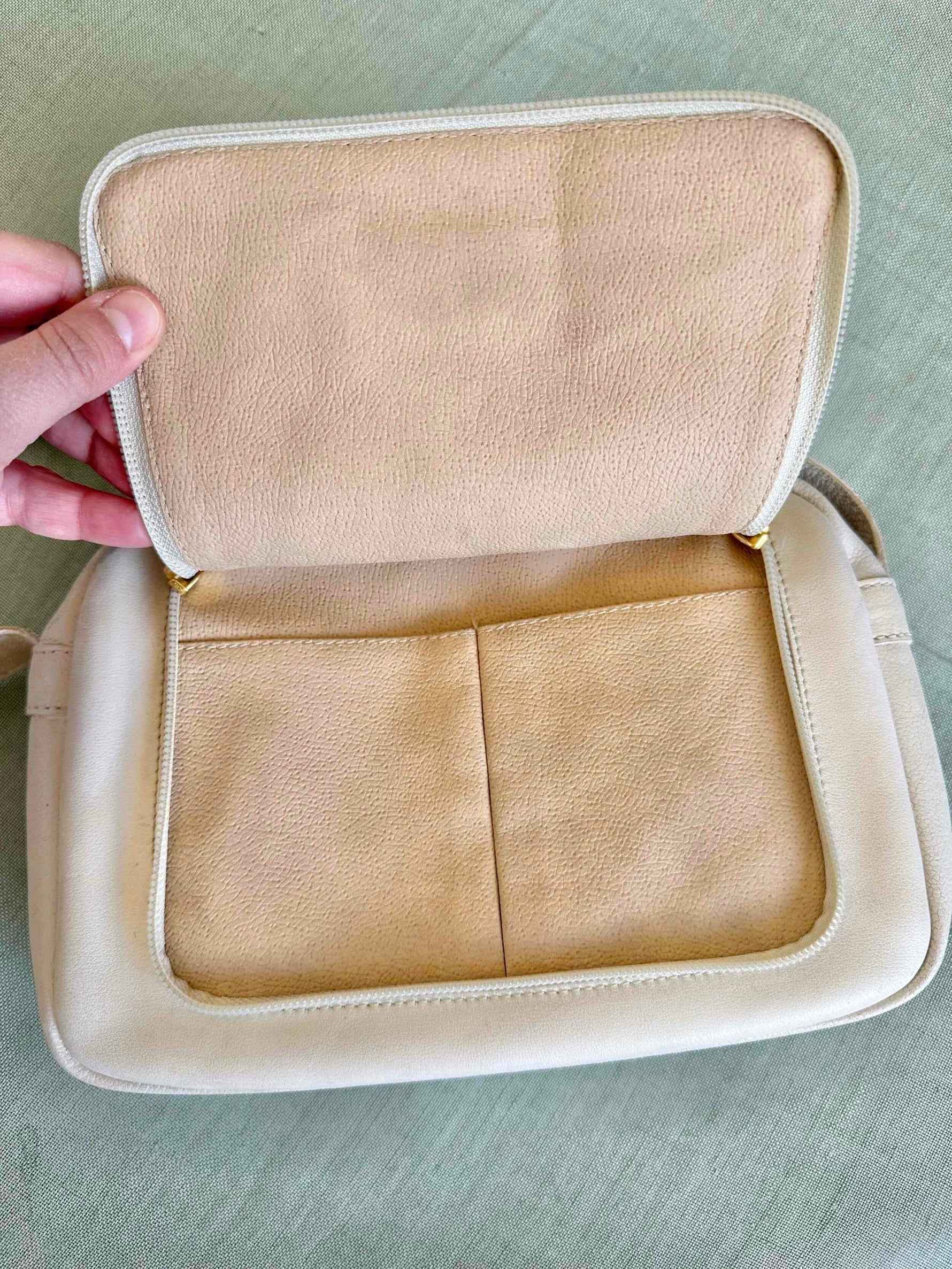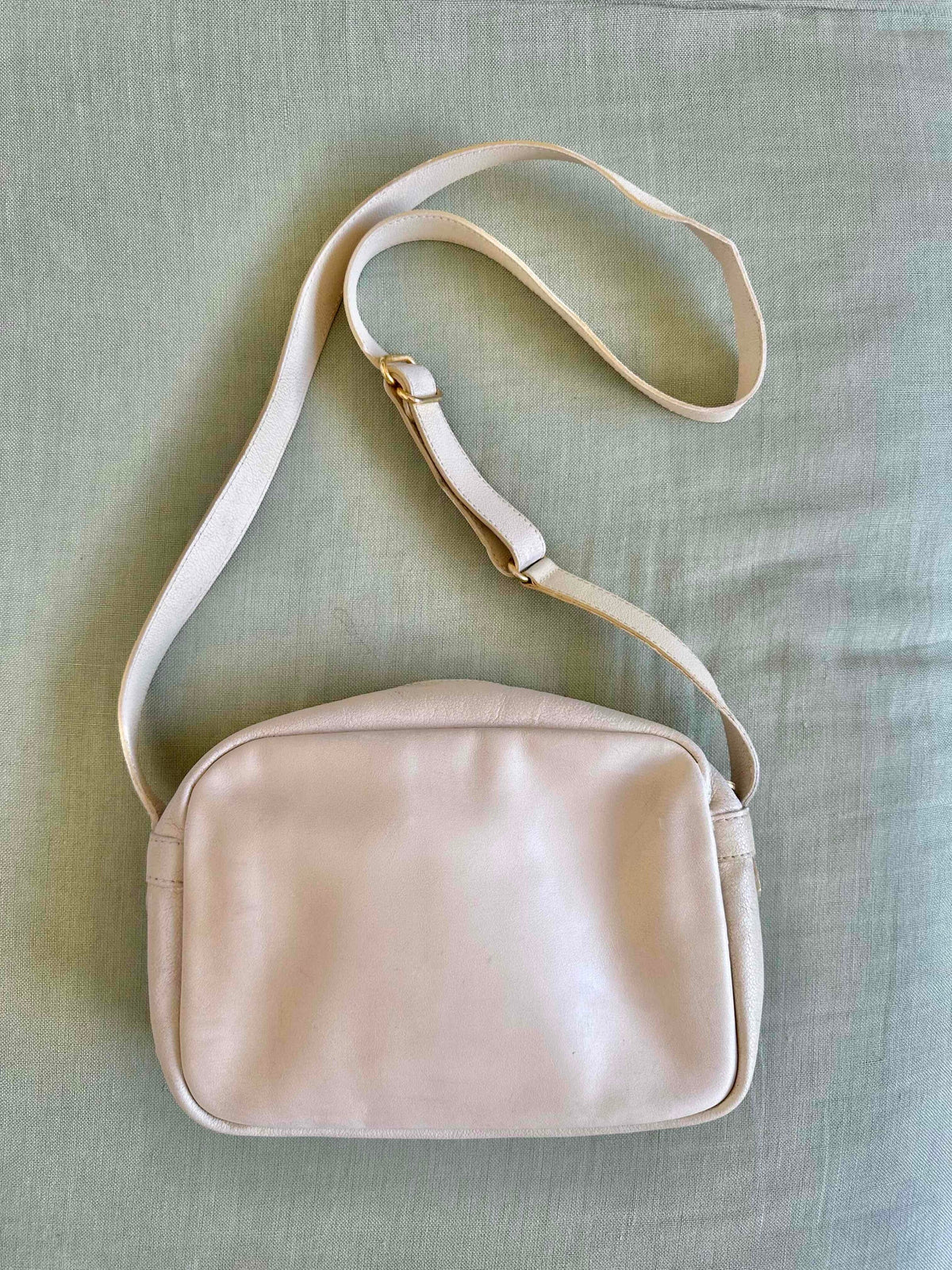 Prix unitaire parSac en cuir Courrèges, cuir lisse et craquelé blanc crème, format camera-bag, boucleries dorées gravées Courreges, une pochette à rabat zippé et porte-carte devant, un compartiment intérieur avec pochette zippée, bandoulière réglable par une boucle à glissière, fabriqué en France, années 80s. H 18cm x L 24cm x P 7cm, longueur bandoulière totale 120cm.