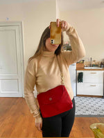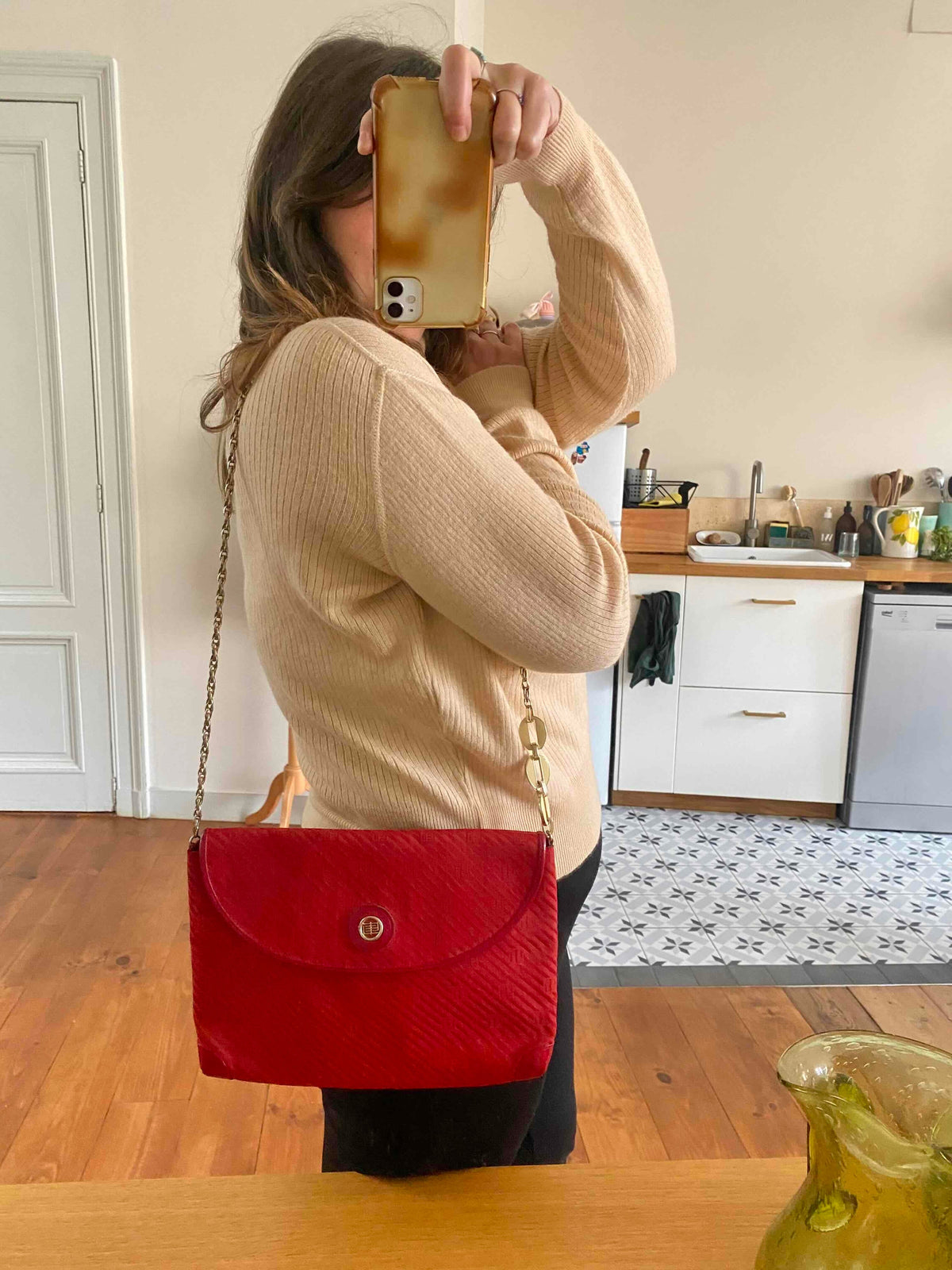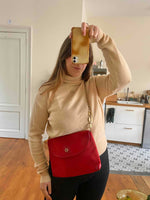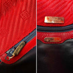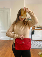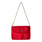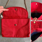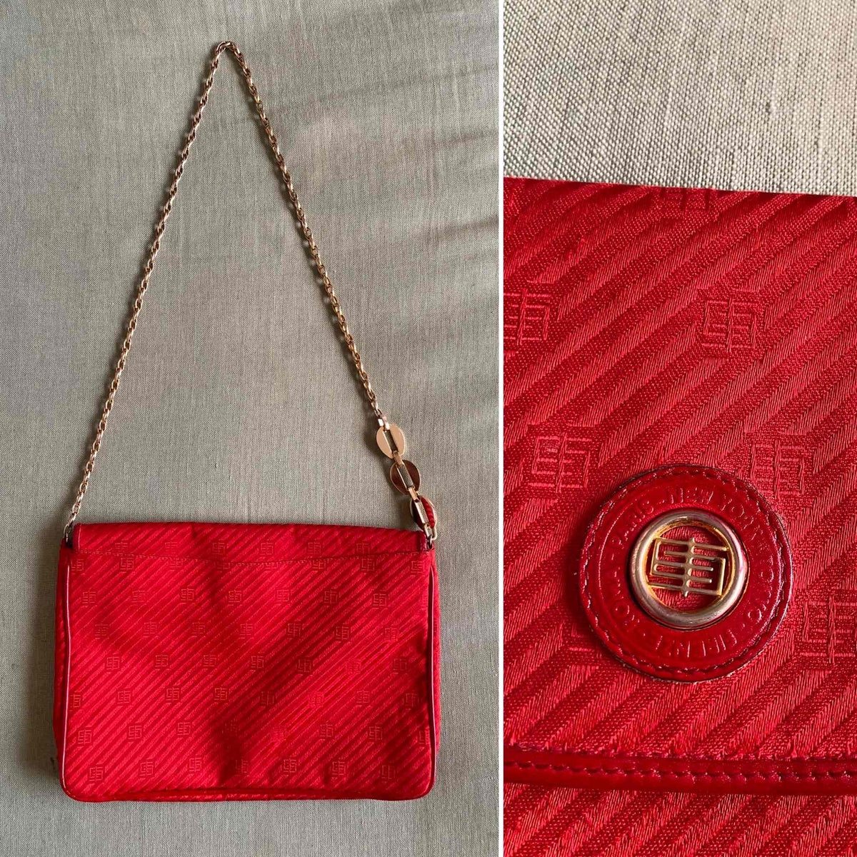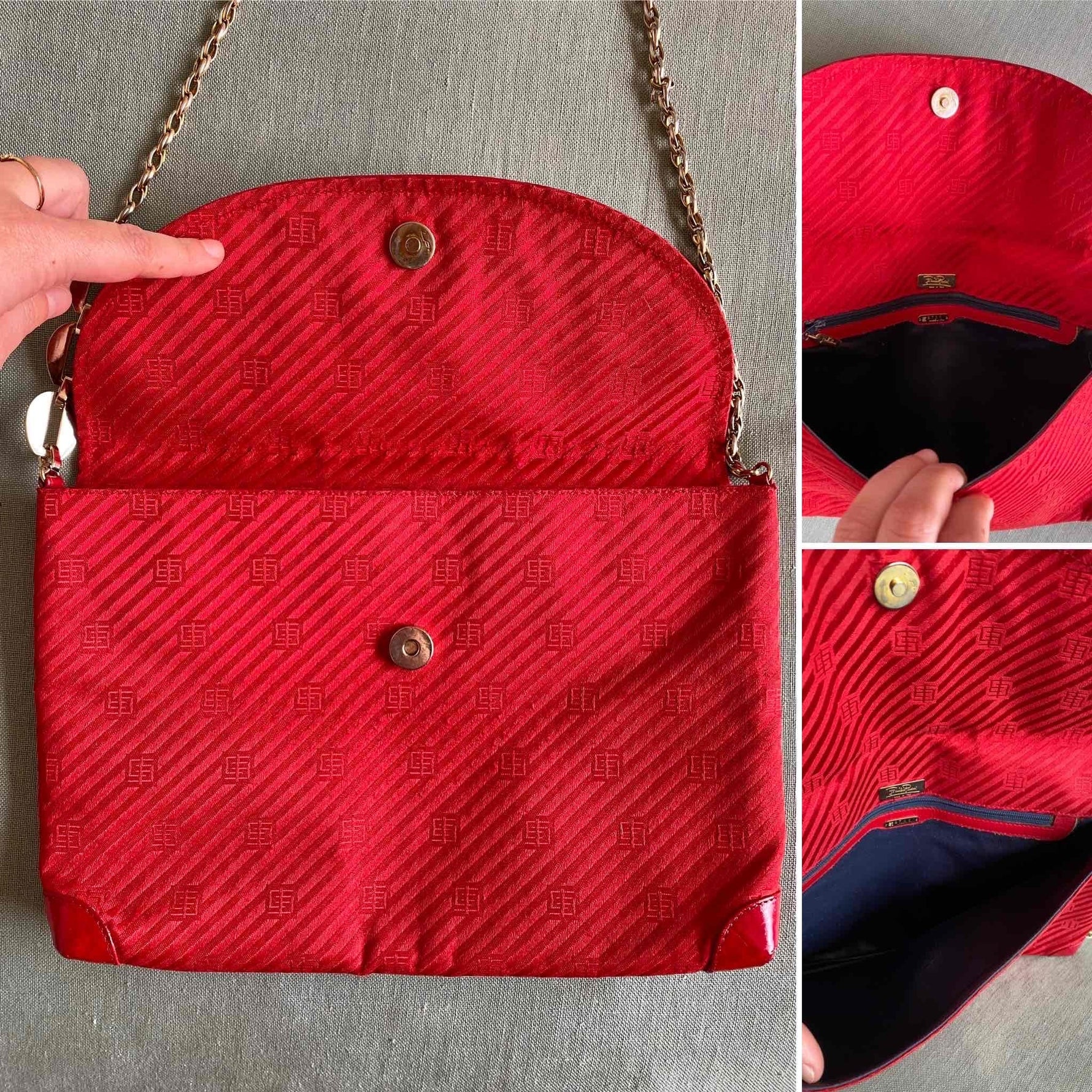 Prix unitaire parSac Emilio Pucci, en toile satin rouge, monogramme et cuir vernis rouge, bandoulière en chaîne dorée et bijoux laquée beige, fabriqué en Italie, numéro de série, H 22 cm x L 31 cm x P 3 cm, hauteur bandoulière 42 cm.