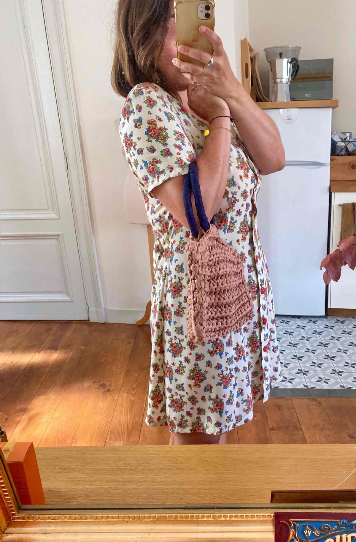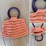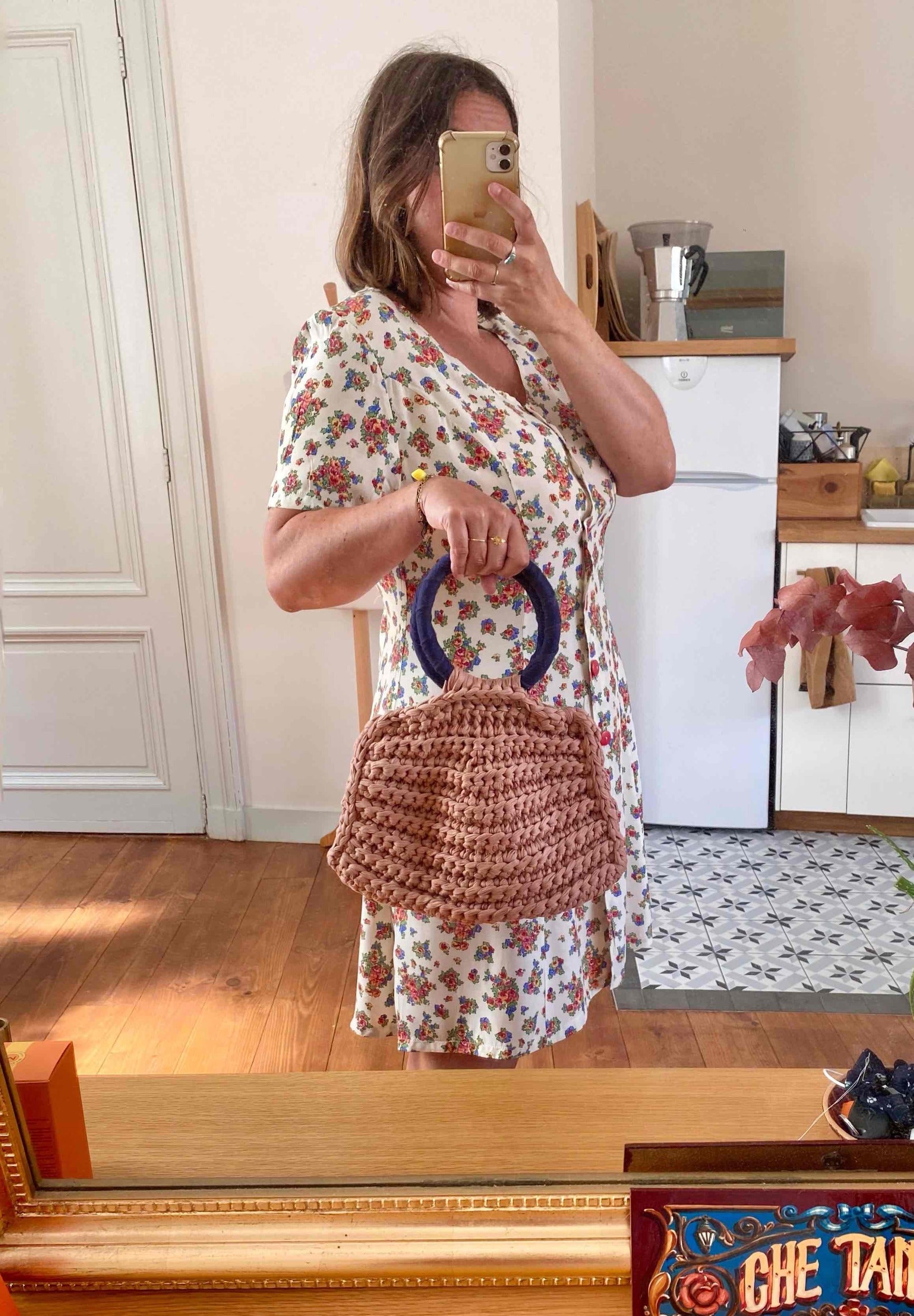 Prix unitaire parSac en crochet rose pastel, en maille ruban de jersey coton, anses poignets rondes tressées de jersey bleu nuit, fait main en Italie.