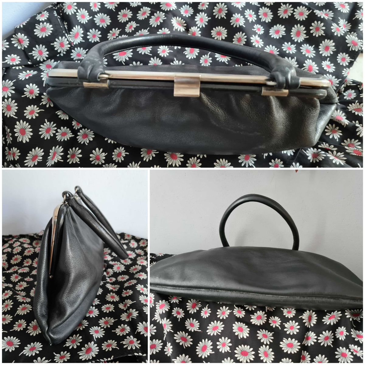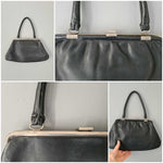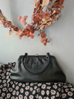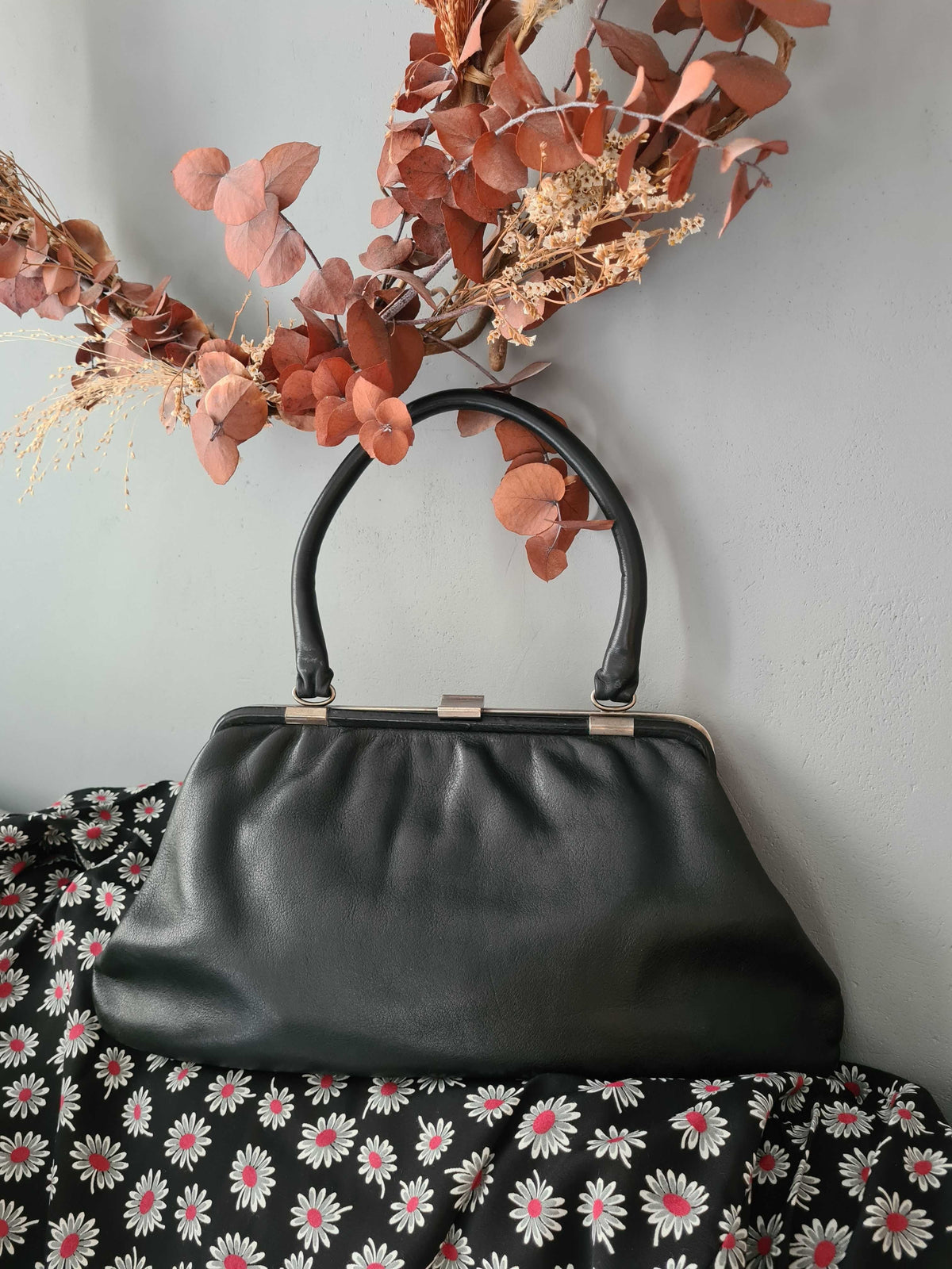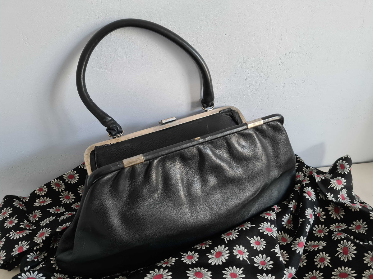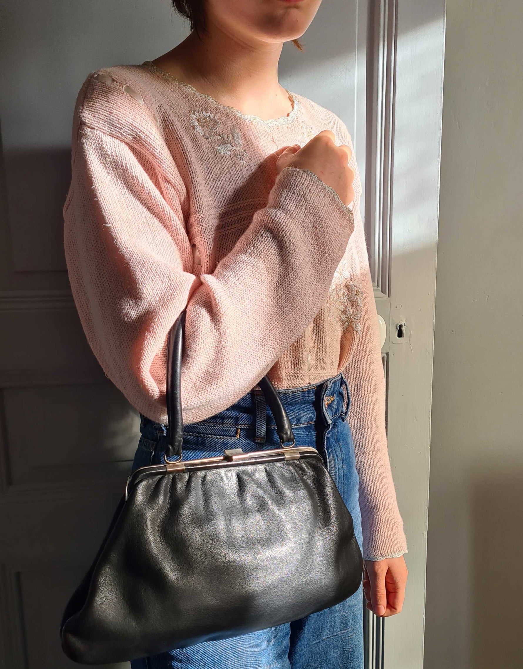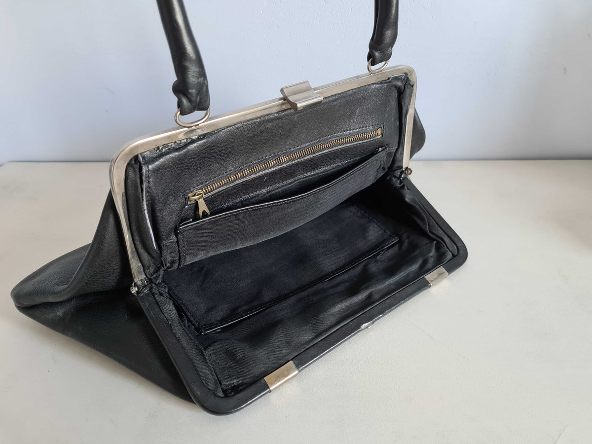 Sac en cuir noir souple à une anse, forme porte-monnaie, fermoir clip en métal argenté, Intérieur doublé tissu et cuir, deux poches plaquées latérales et une poche zippée. Une pièce unique des années 50, à porter main ou épaule.