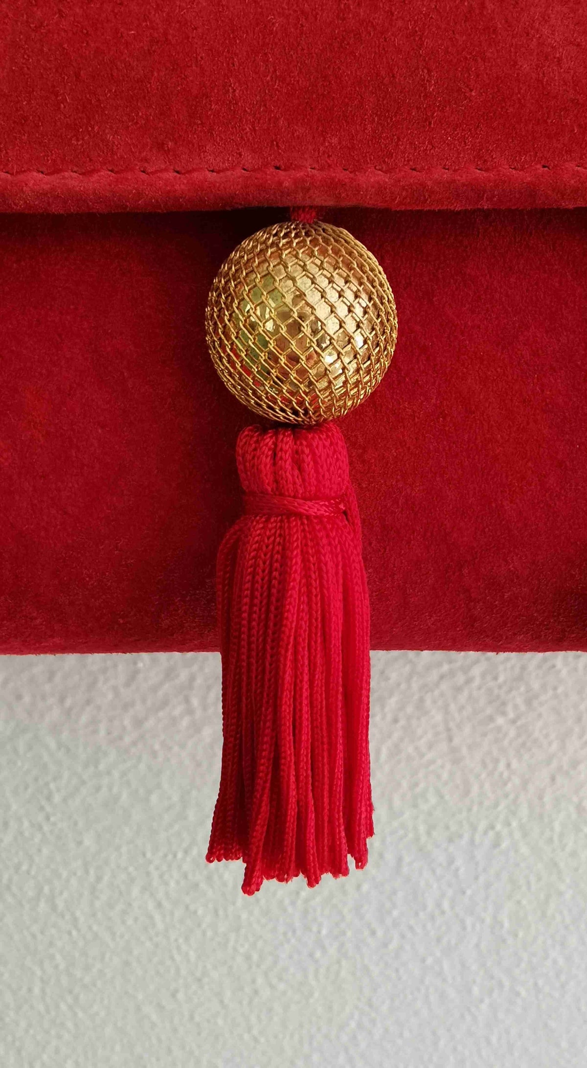 Fermeture par pression sous le rabat. Celui ci est à pompons avec grosses perles dorées