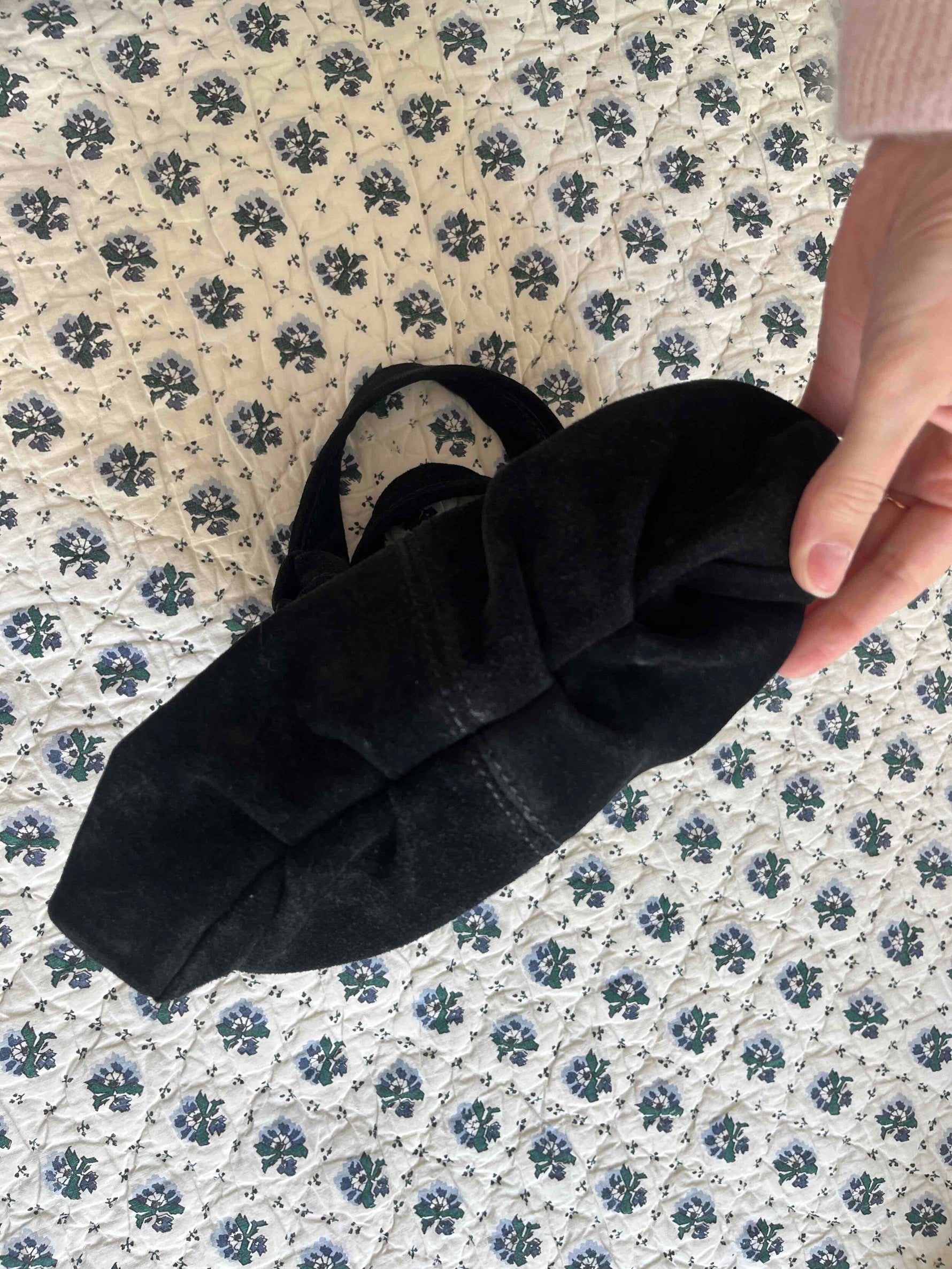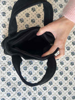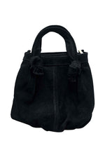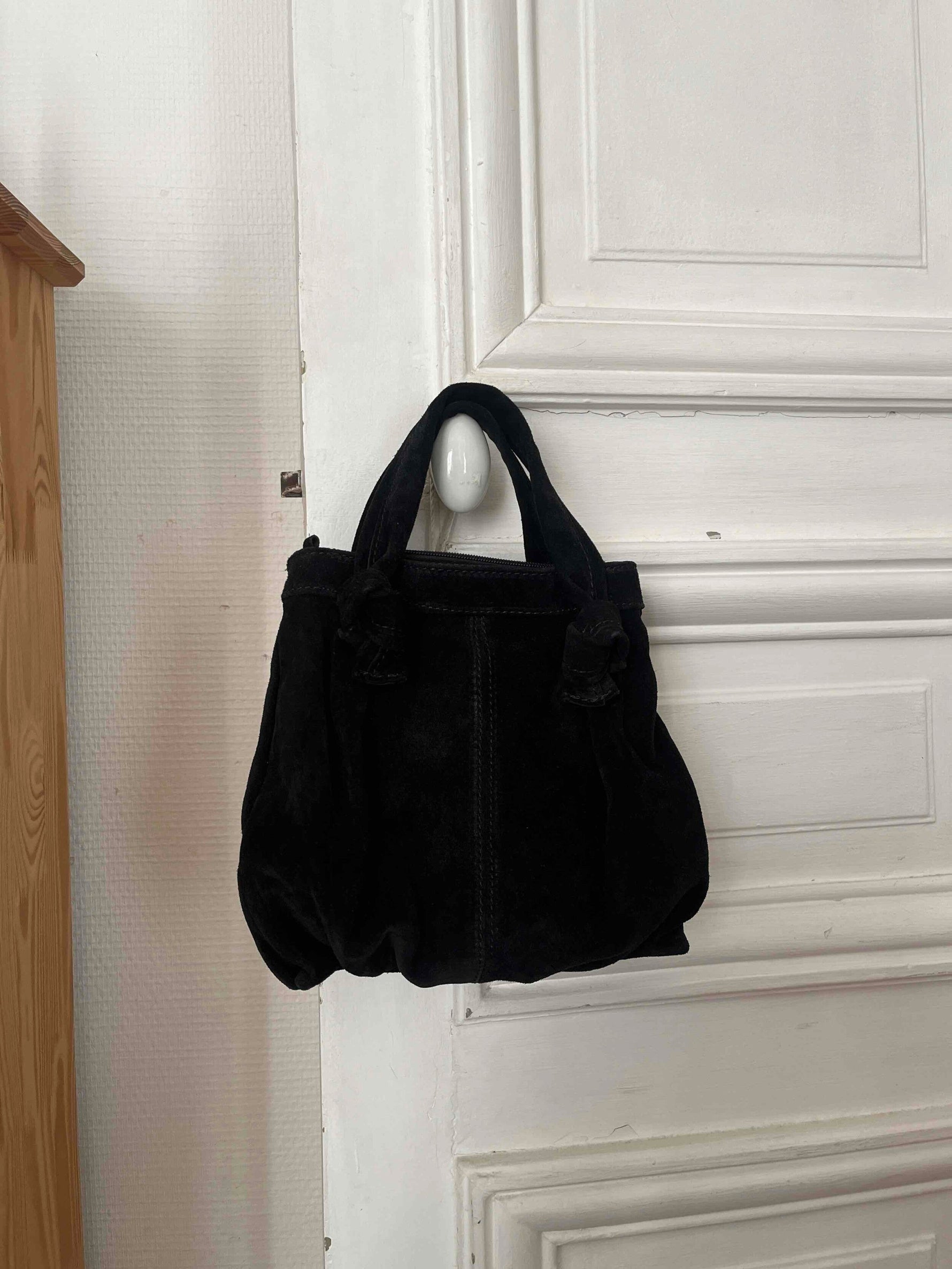 Sac à main en daim, fabriqué en Italie, anses nouées, fermeture éclair, intérieur doublé en tissu avec petites poches.