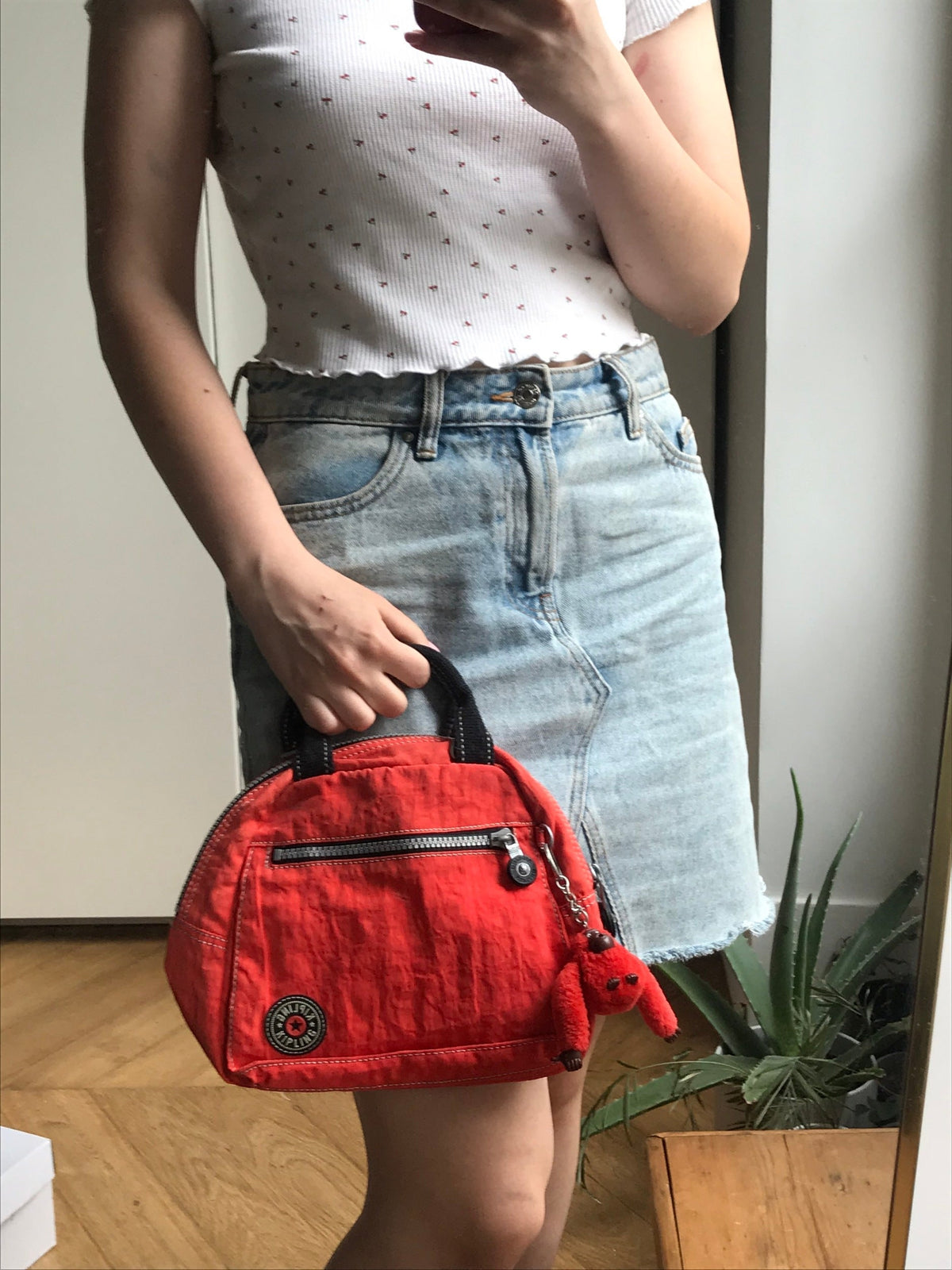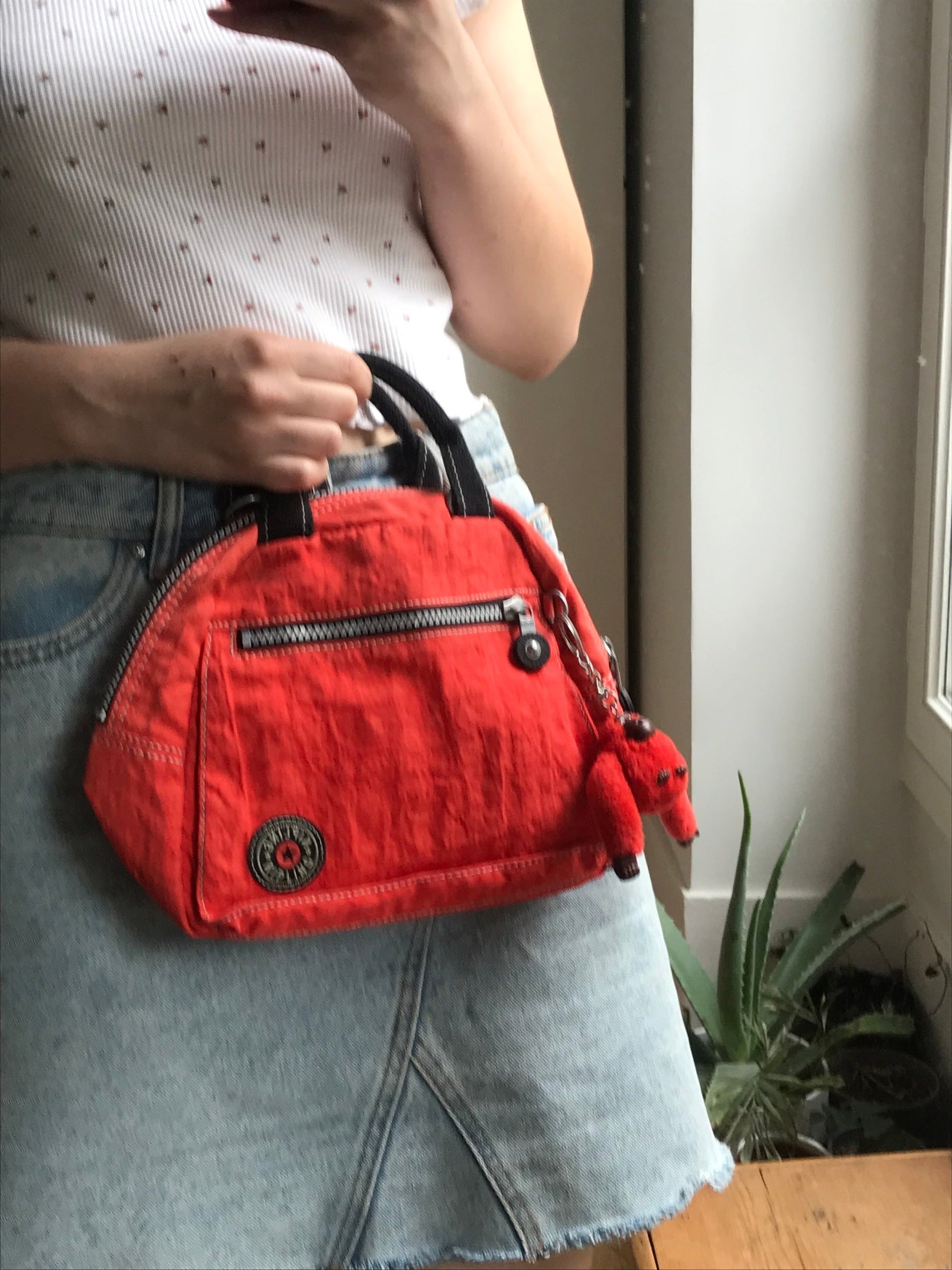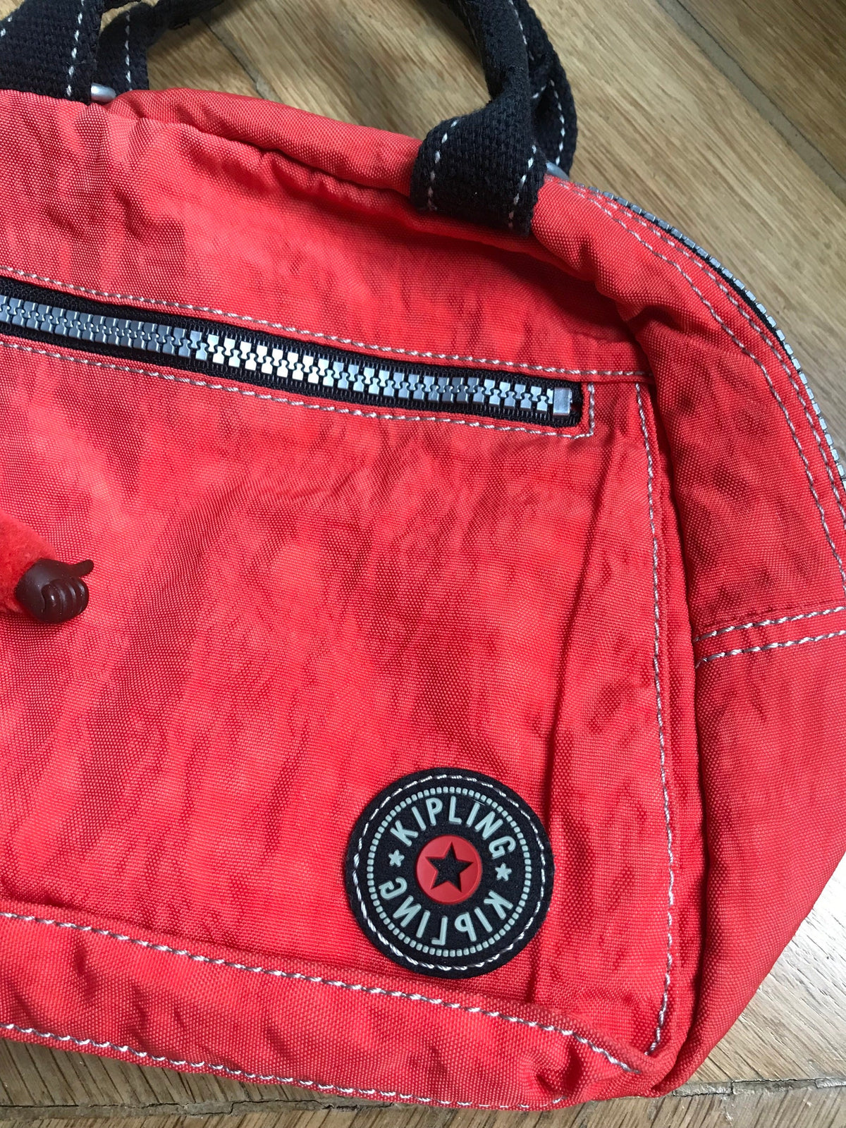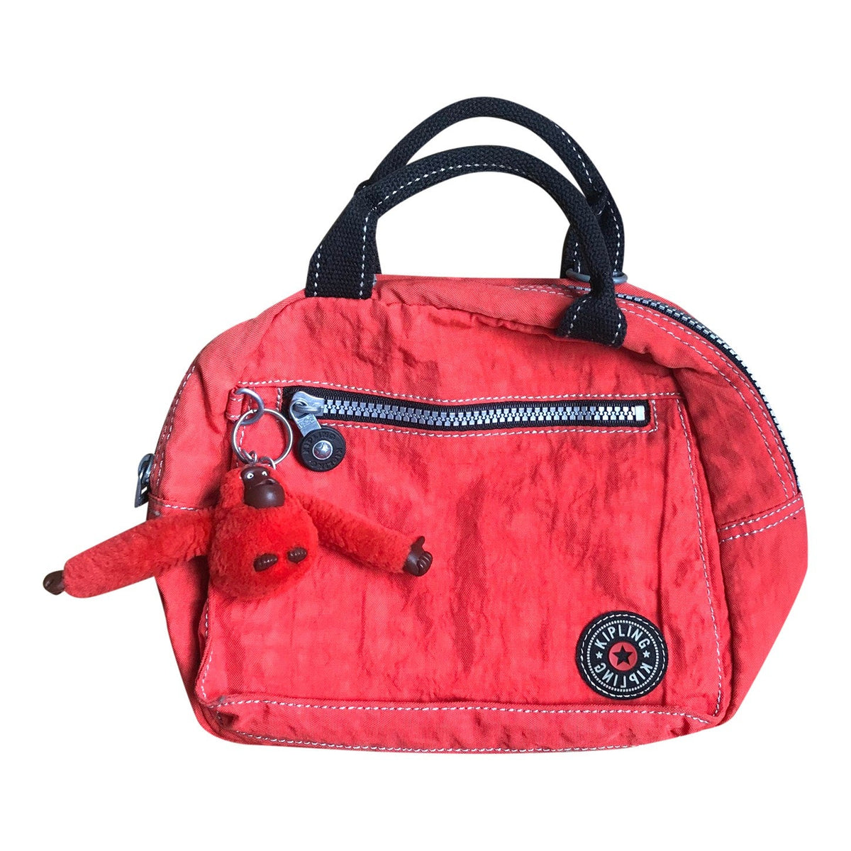 Prix unitaire parSac à main en toile imperméable (tissu nylon froissé), de couleur rouge orangé avec zips. De la marque "Kipling" (casual-styled). Détails noir et pochettes intérieurs. Vient avec son porte-clef en forme de singe poilu, accessoire mythique de la marque phare des années 90s/2000s.