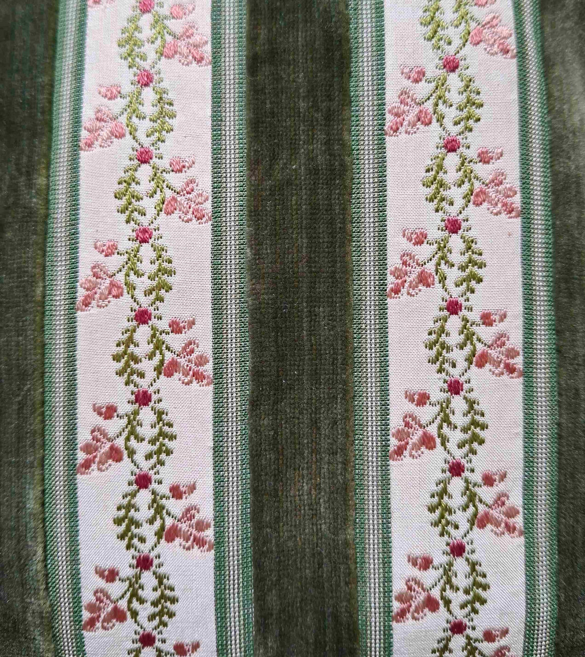 Velours brodé de petites rose et rayures vert kaki