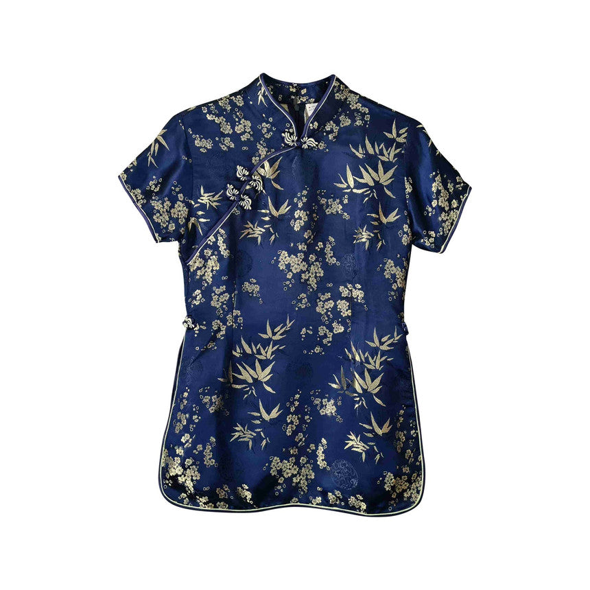 Top asiatique en soie bleue et or, motifs bambou et fleurs de cerisier, col Mao, manches courtes, boutons noeuds fixes, fermeture éclair à l arrière, fentes côtés. Porté sur les photos par une taille 36.