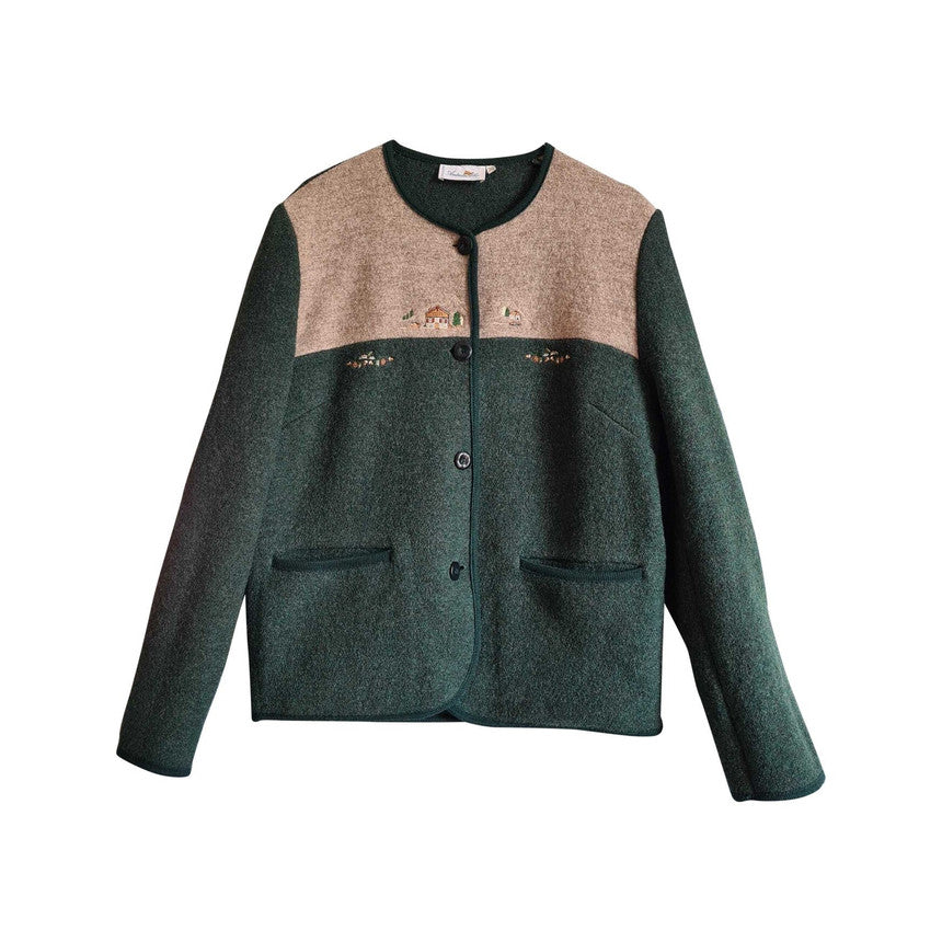 Veste courte style autrichien en pure laine bouillie vert sapin et beige, détails brodés. Coupe droite, deux poches passepoilées. Fabriqué en France.
