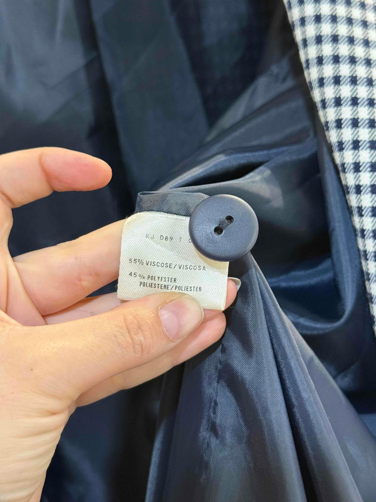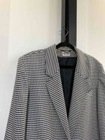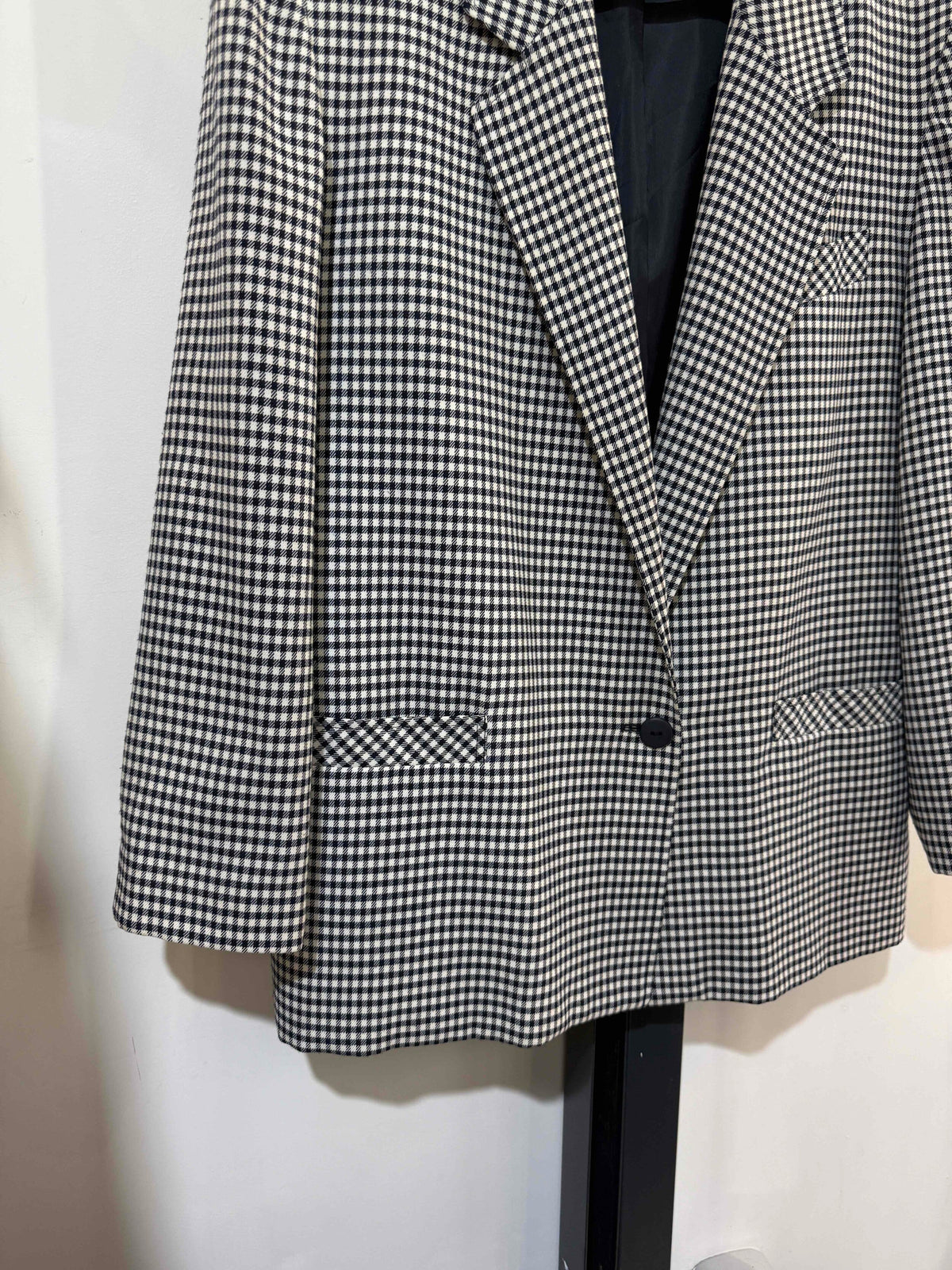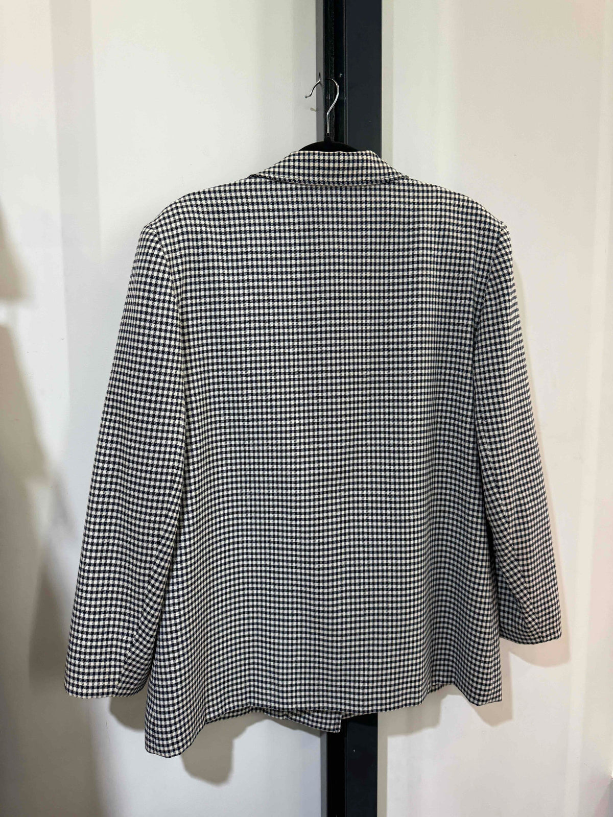 Prix unitaire parBlazer mi long fluide en viscose et polyester, taille L ou M oversize. Coupe droite, tissu fluide. Poches. Motif Vichy noir et blanc.