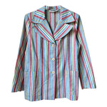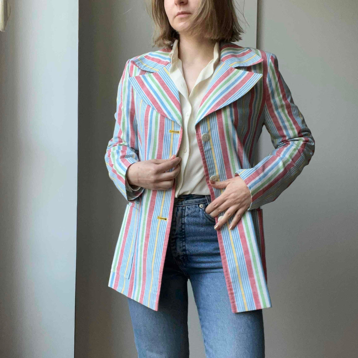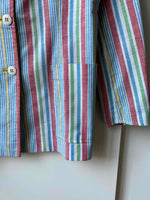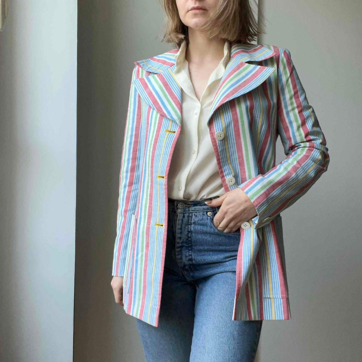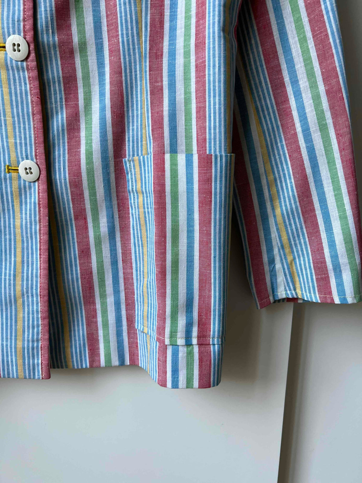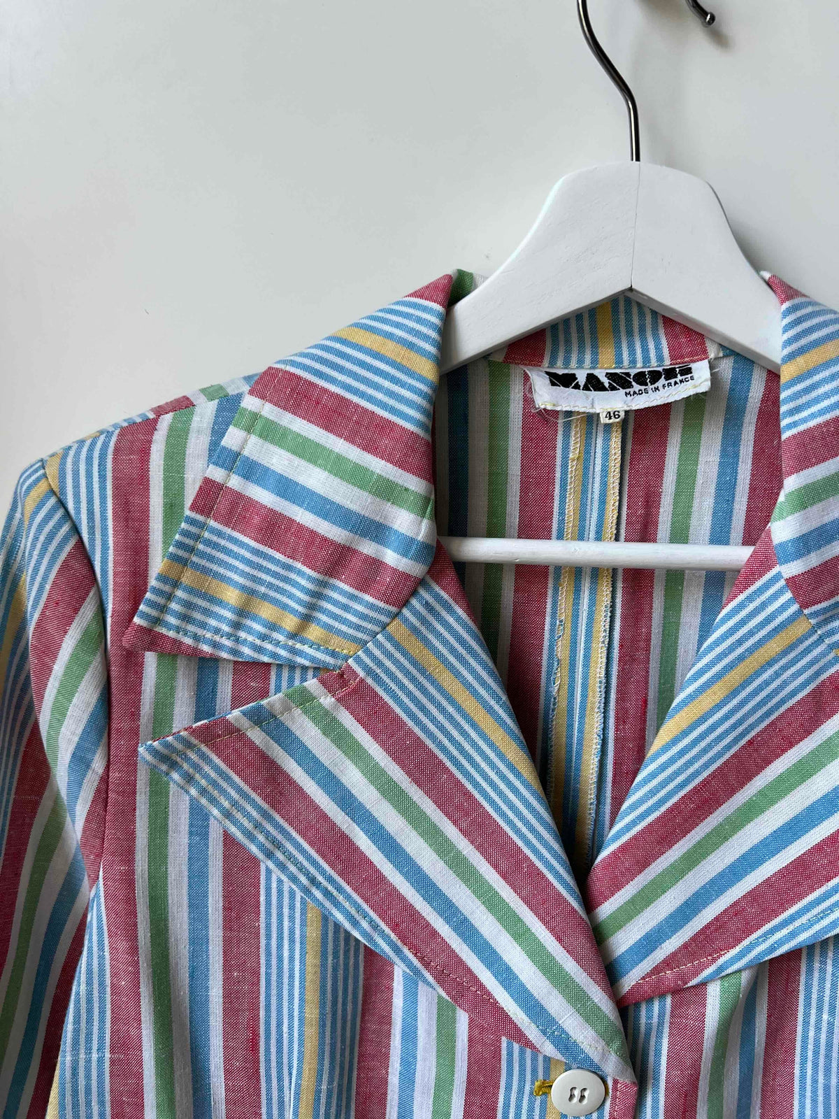 Prix unitaire parBlazer long en lin, blanc avec des rayures verticales dans des tons pastels rouge, bleu et vert. Entièrement boutonné devant avec un détail de poche. Made in France de la marque Manoli. Années 90. Détails au niveau des épaulettes. Porté sur les photos par une taille 36/38.