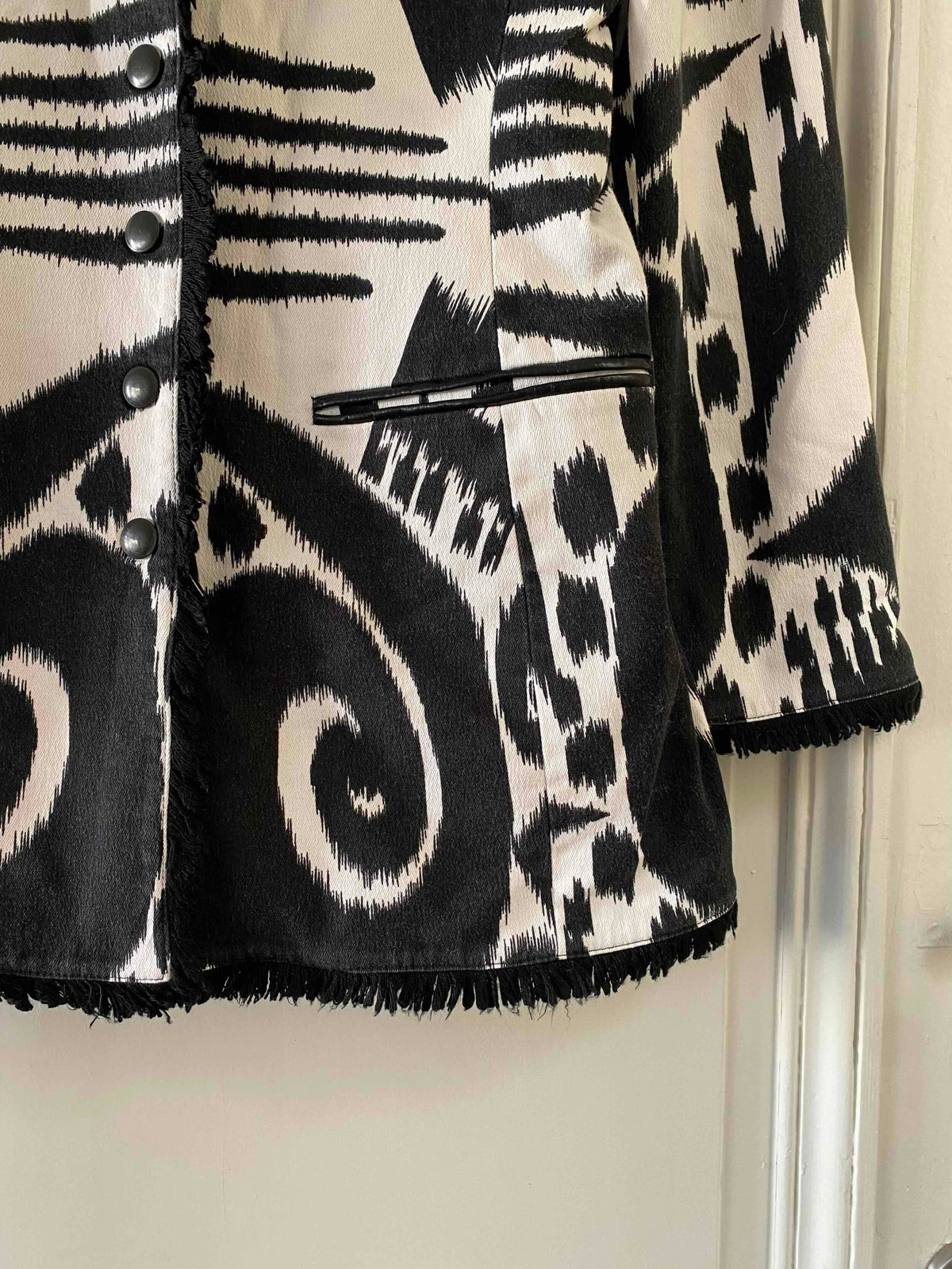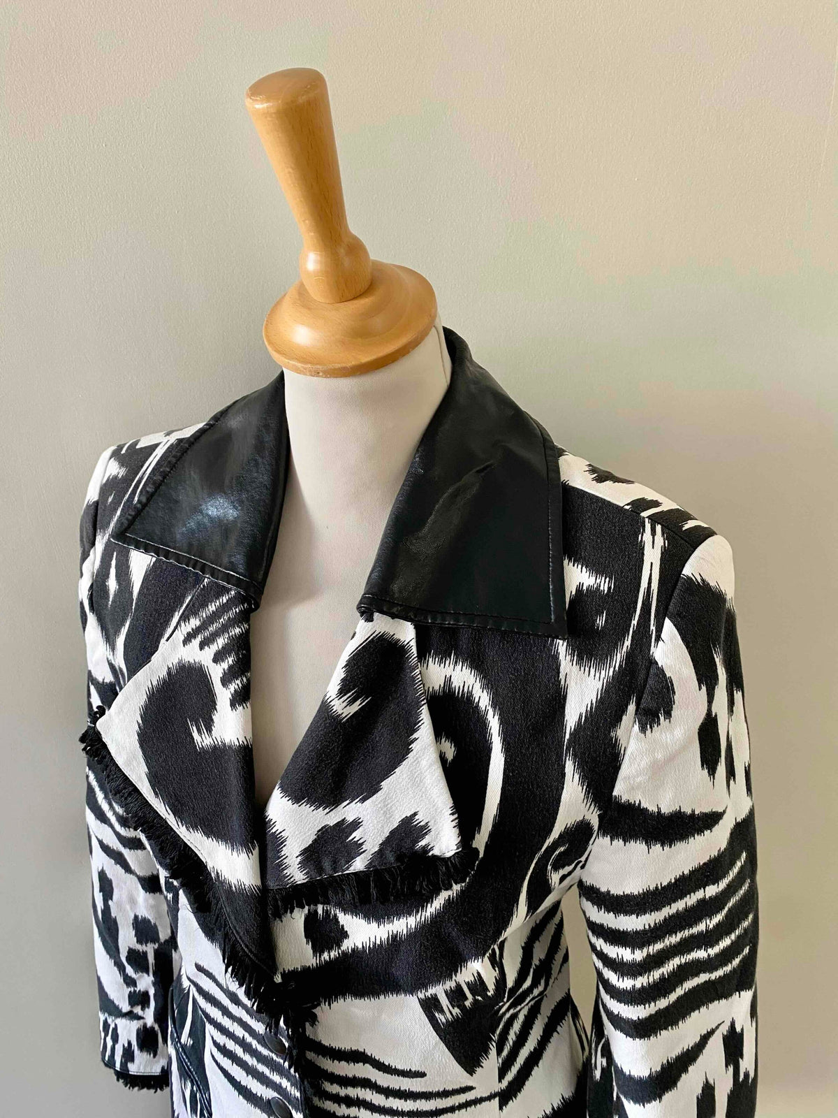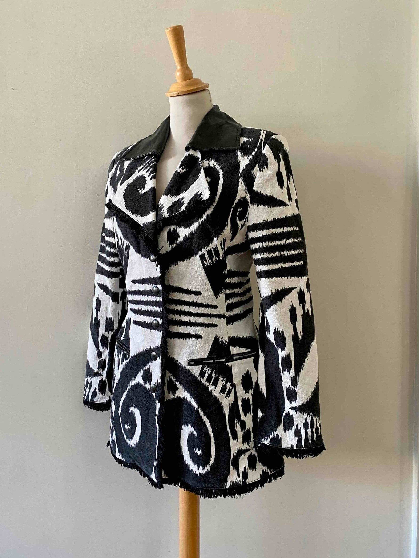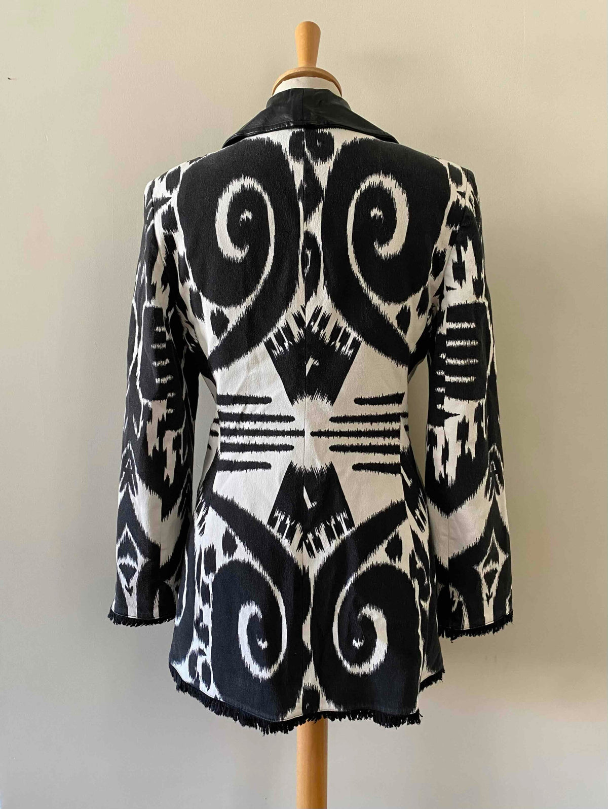 Prix unitaire parBlazer Christian Linares, en coton denim blanc Imprimé motifs ikats noirs, bordures à franges noires, col et détails en cuir noir, boutons pressionnés, fabriquée en France, taille 36 portée ici sur un mannequin T36.