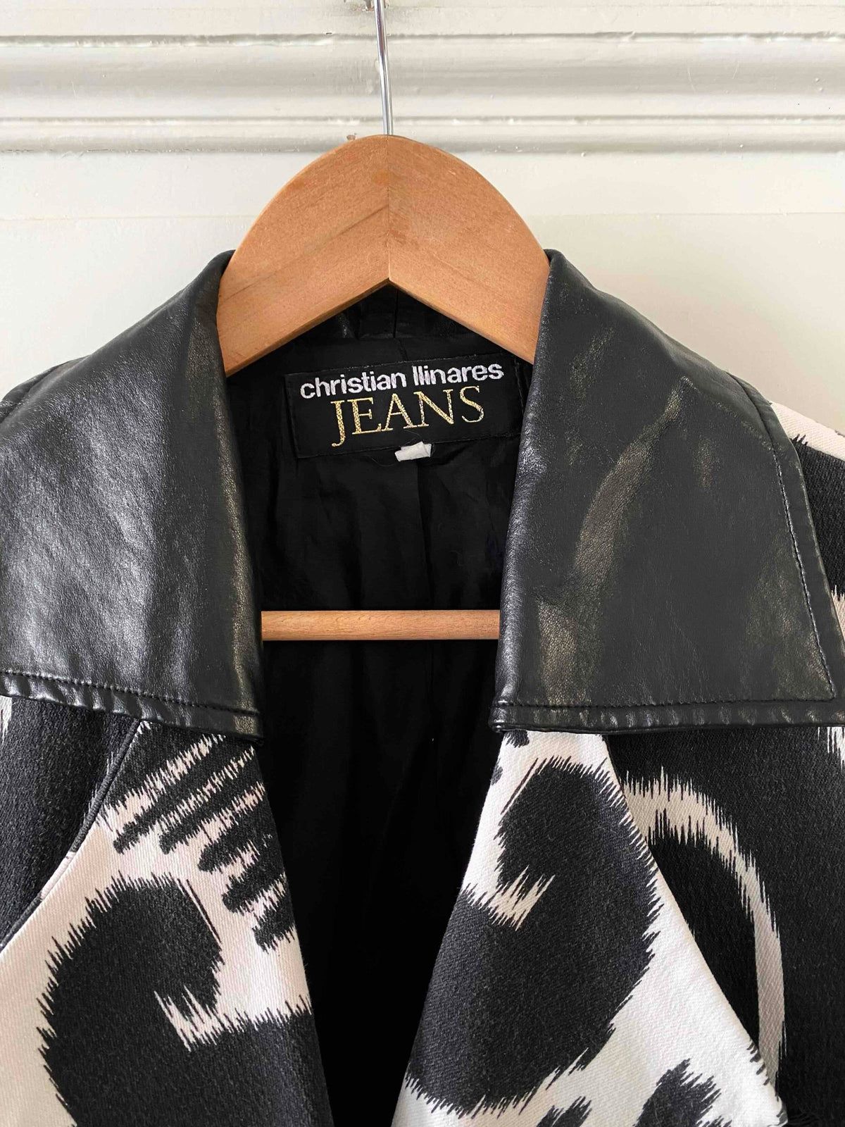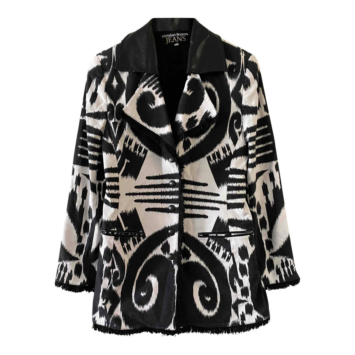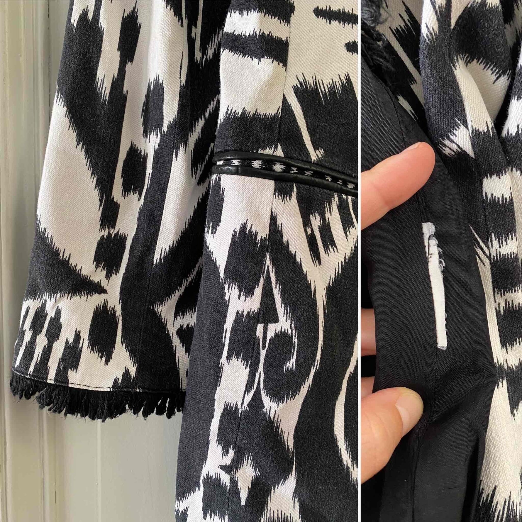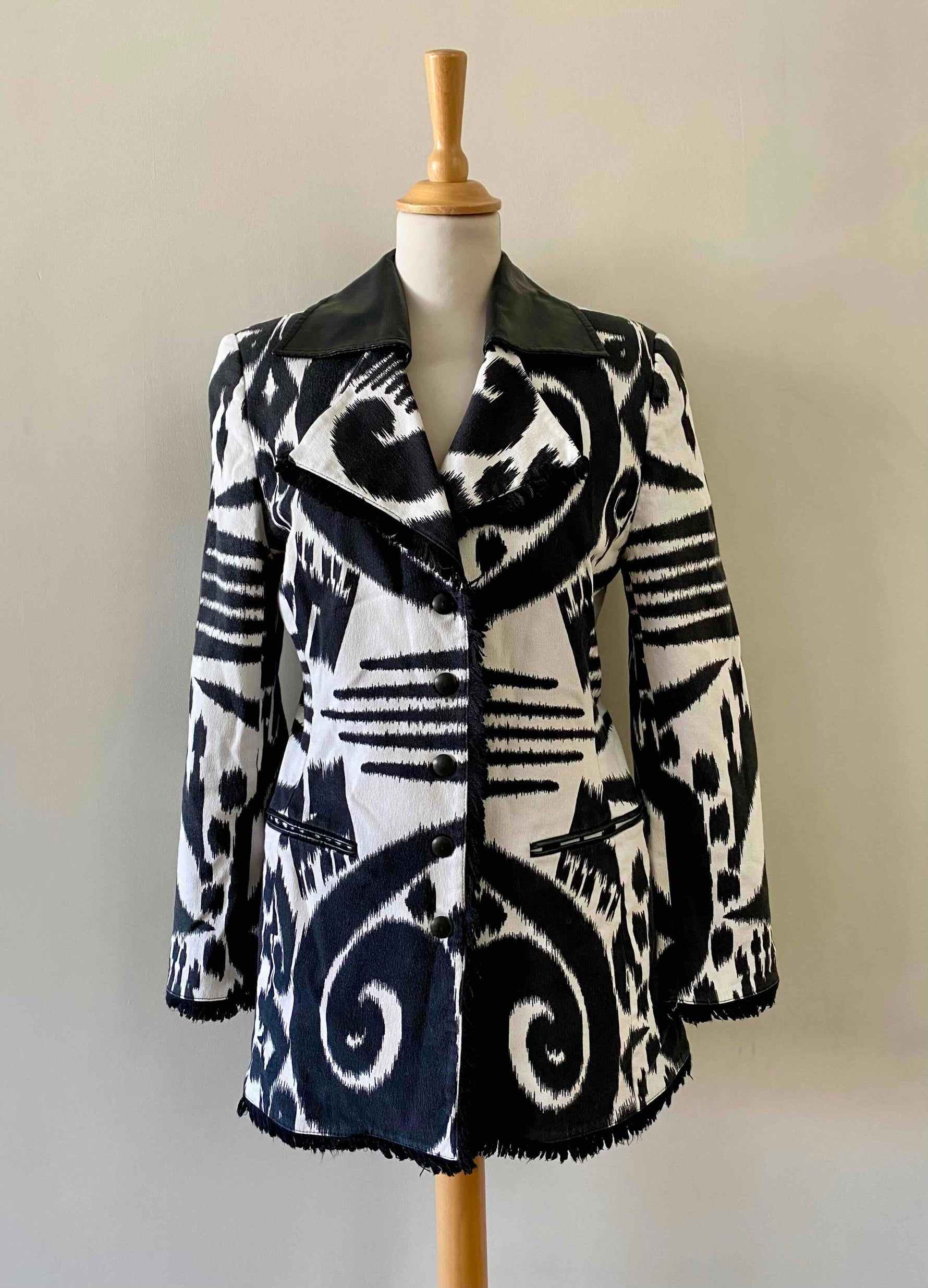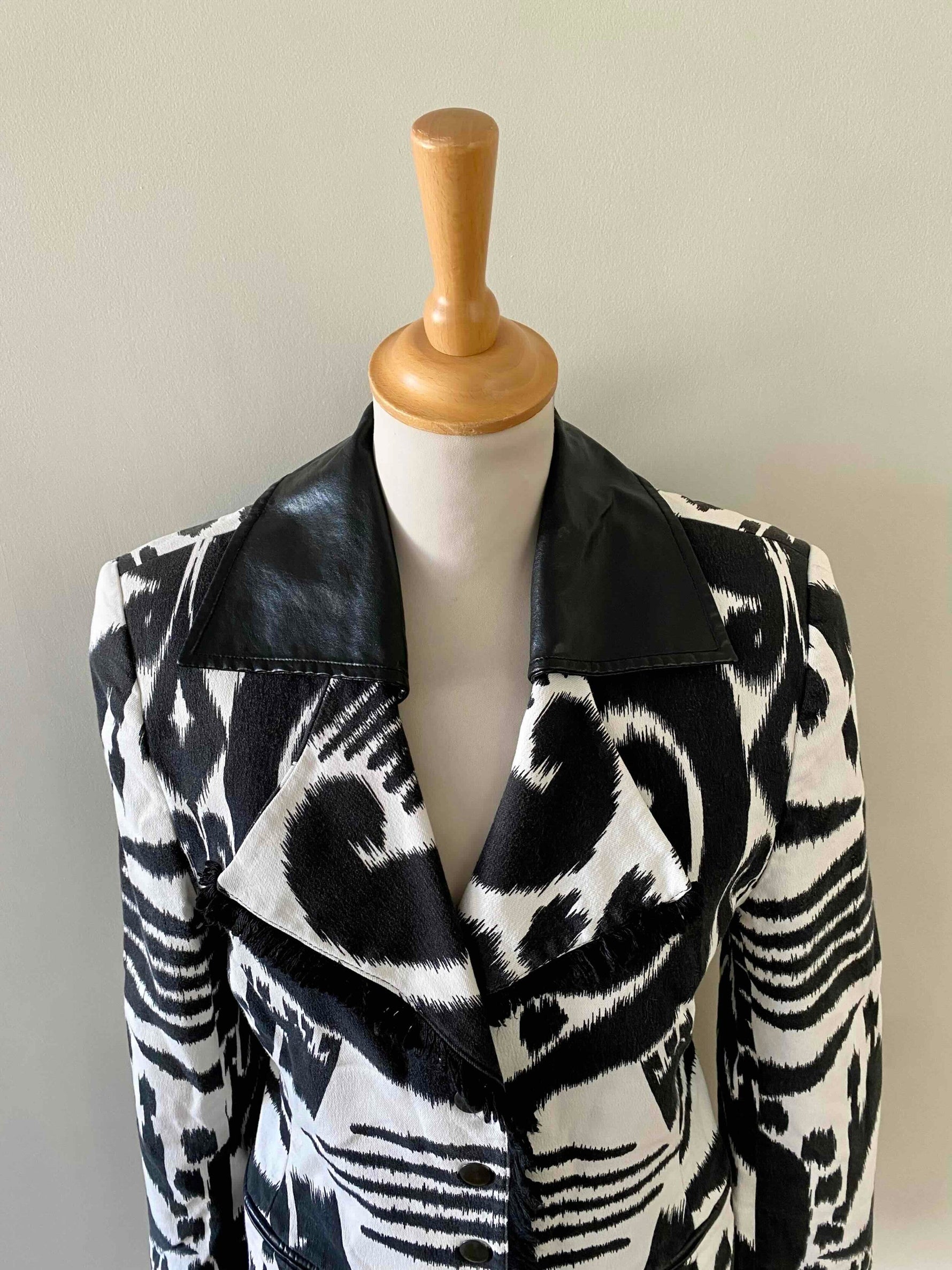 Prix unitaire parBlazer Christian Linares, en coton denim blanc Imprimé motifs ikats noirs, bordures à franges noires, col et détails en cuir noir, boutons pressionnés, fabriquée en France, taille 36 portée ici sur un mannequin T36.