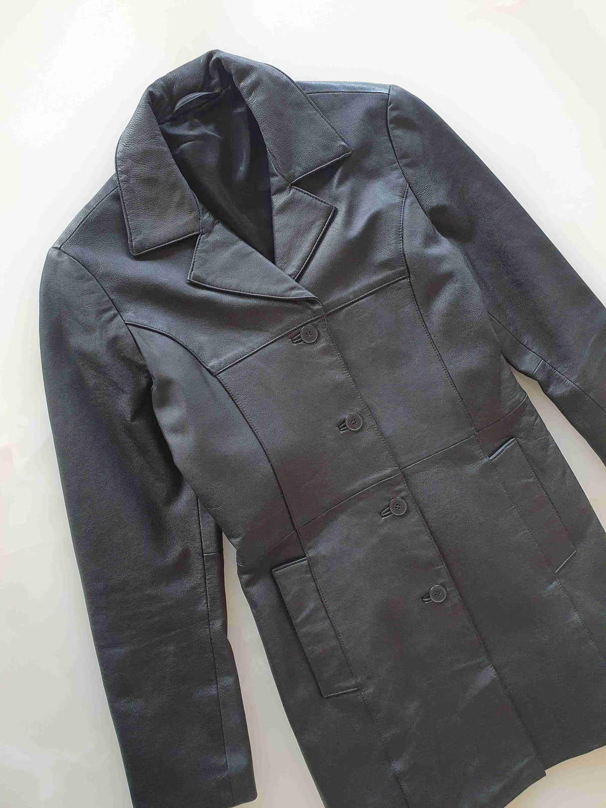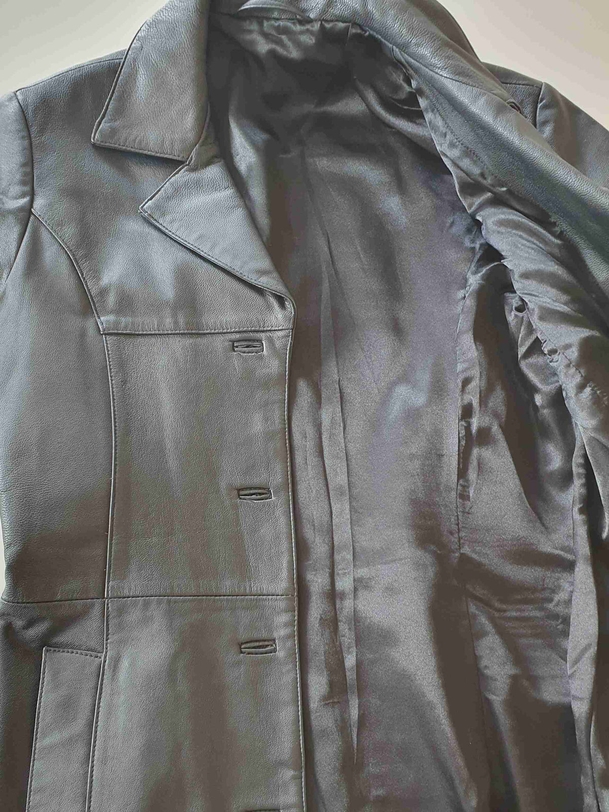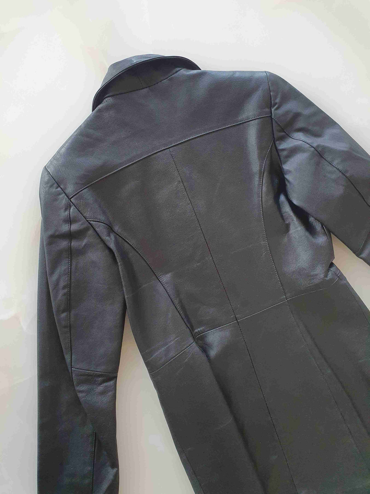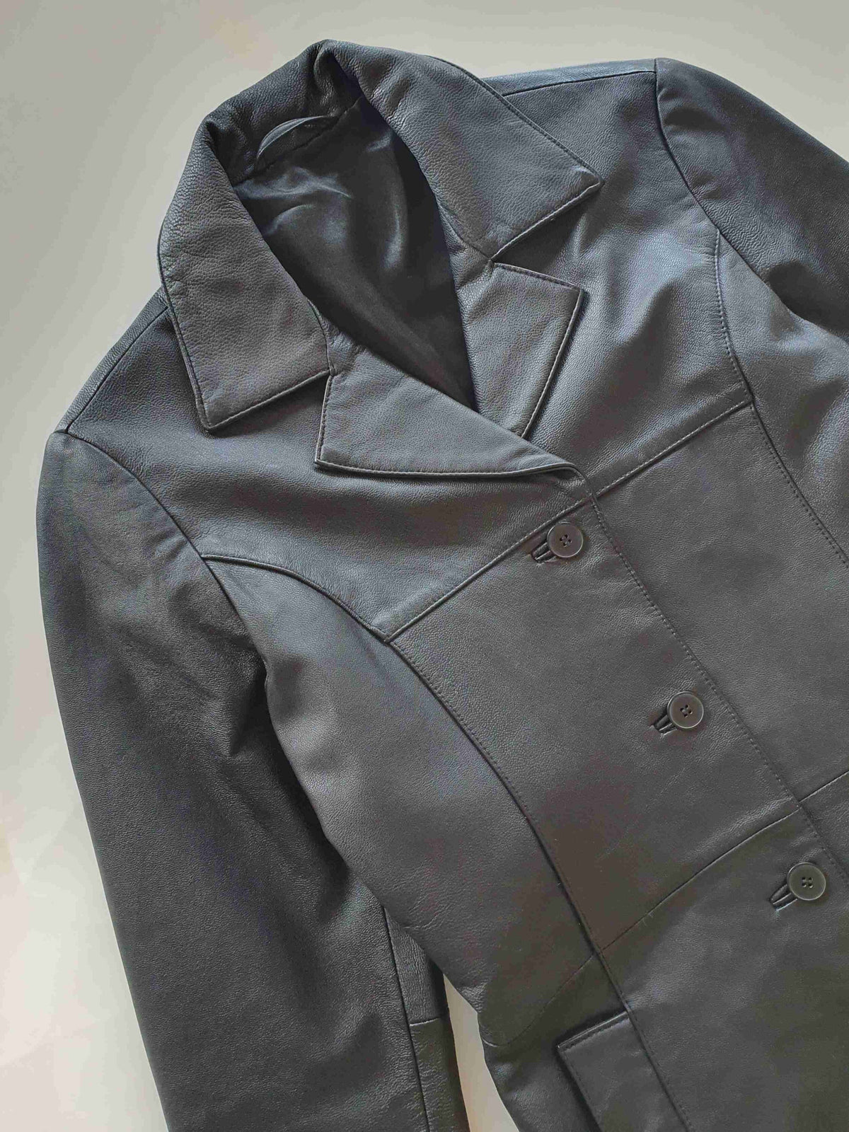 Prix unitaire parBlazer en cuir noir. Cuir de chèvre véritable. Entièrement doublée. Boutons noirs. Deux poches. Taille 34/petit 36.