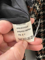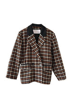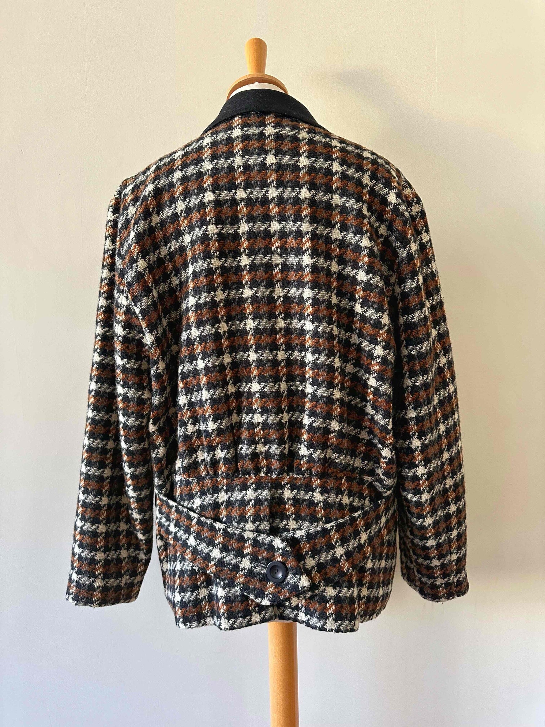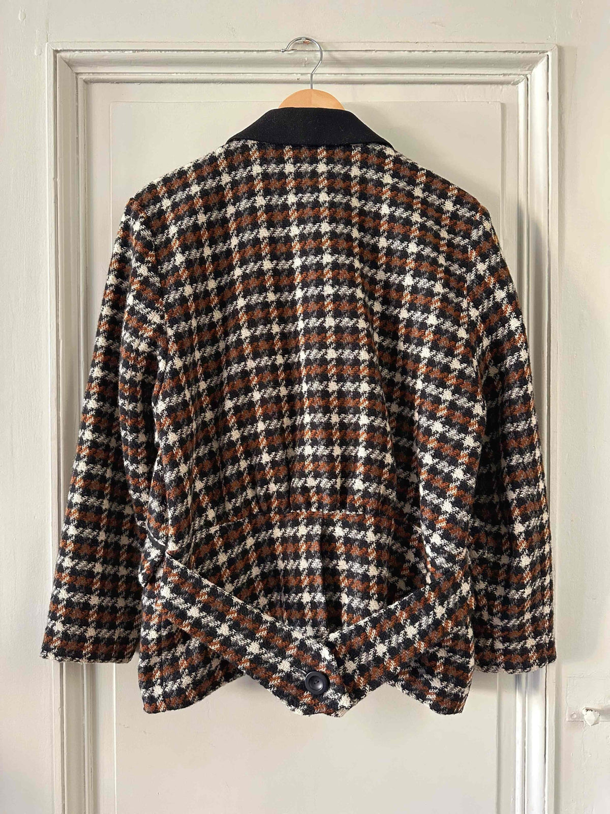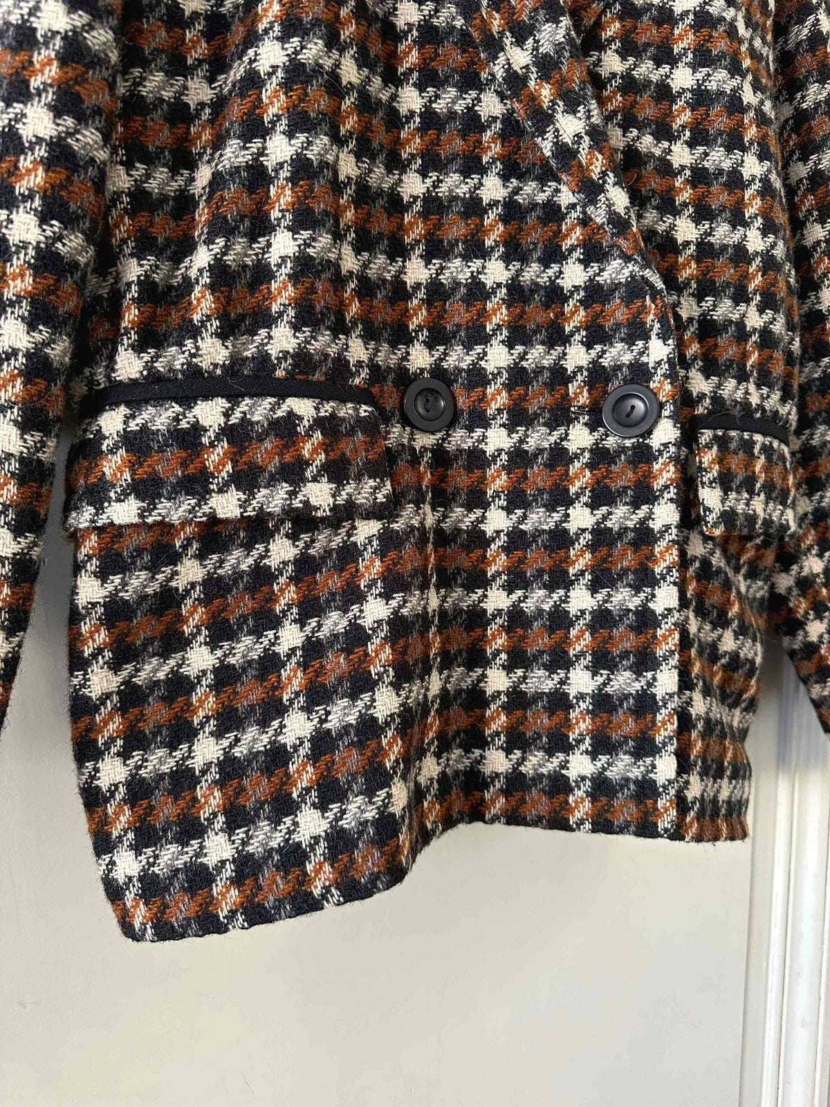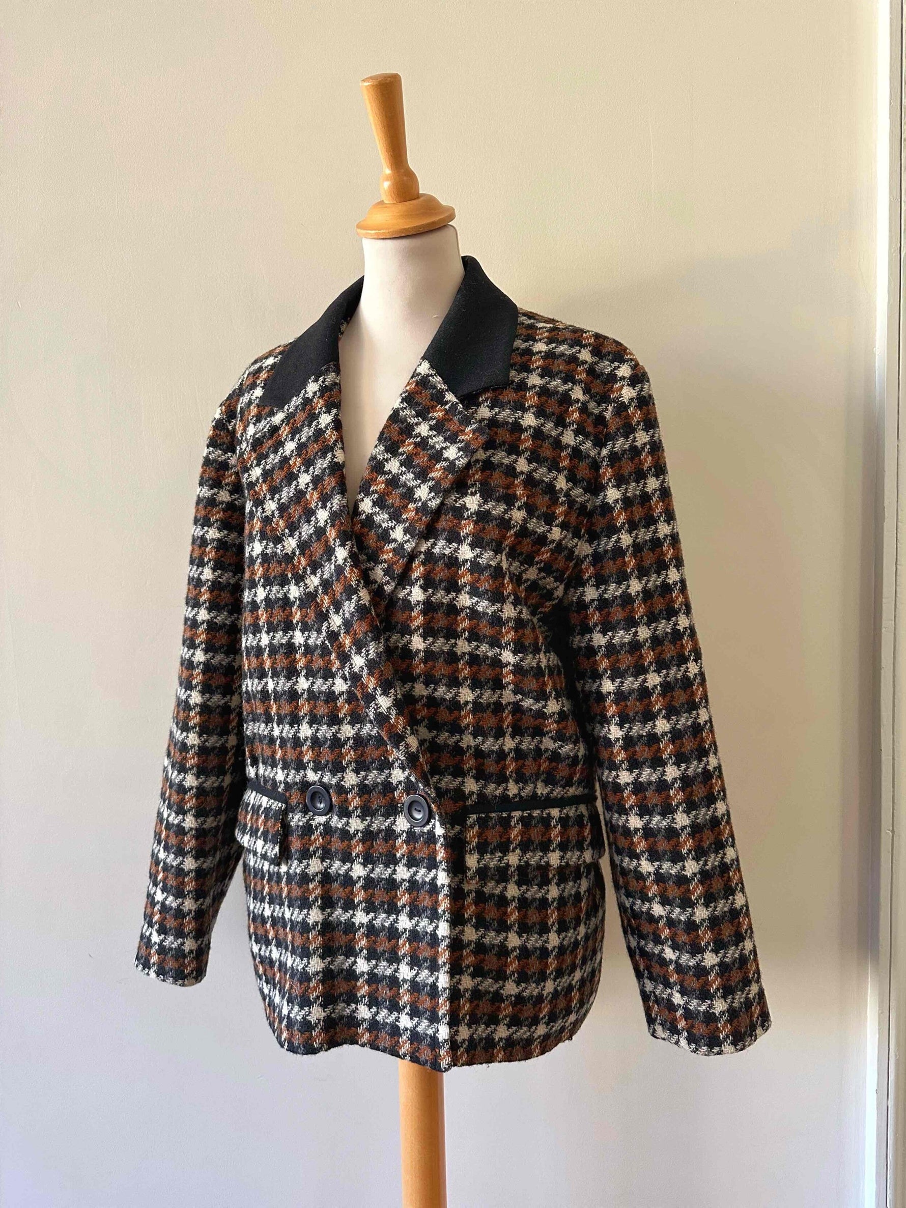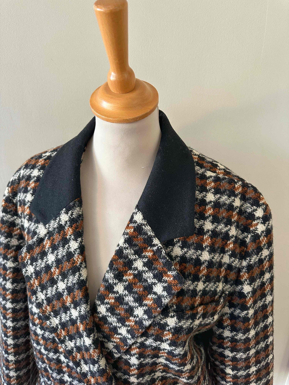 Blazer prince de galles, en laine et mohair, carreaux prince de galle, noirs, blancs et caramel, boutonnage croisé, fabriqué en France, taille 36 porté ici sur un mannequin T36.