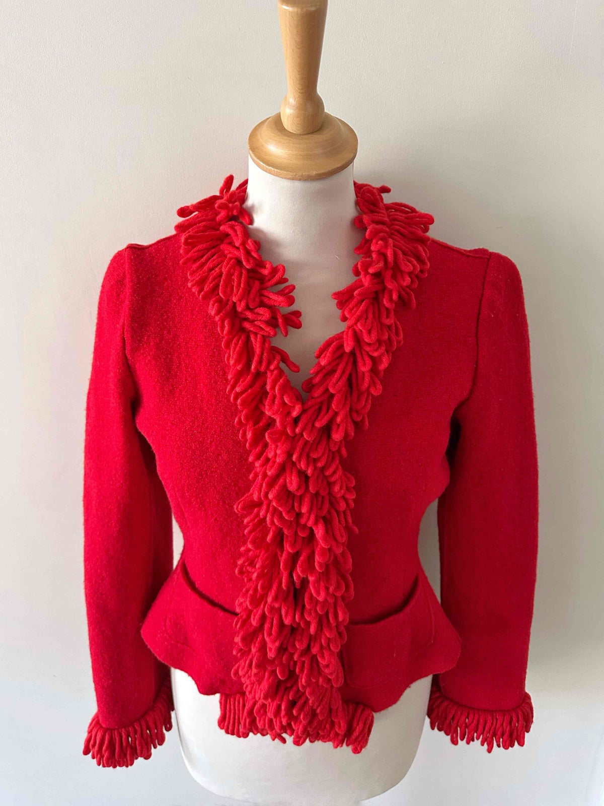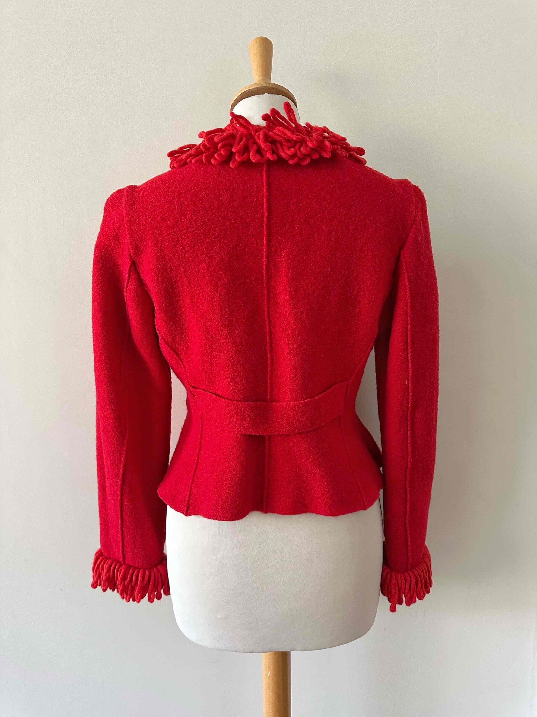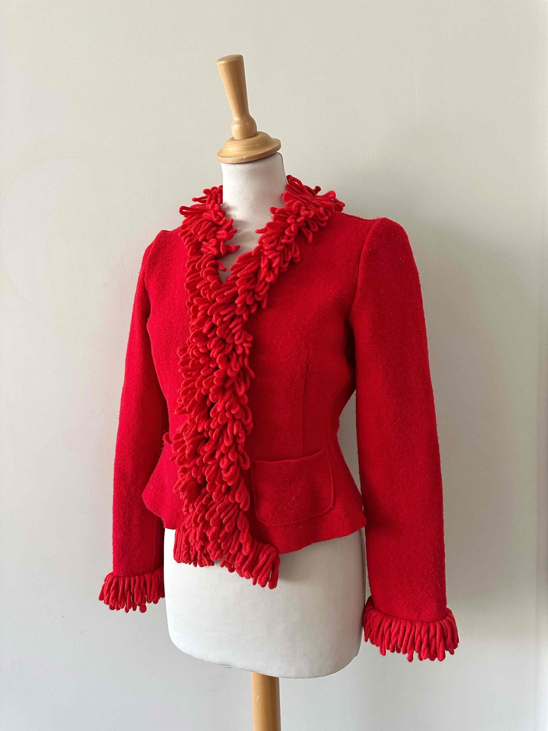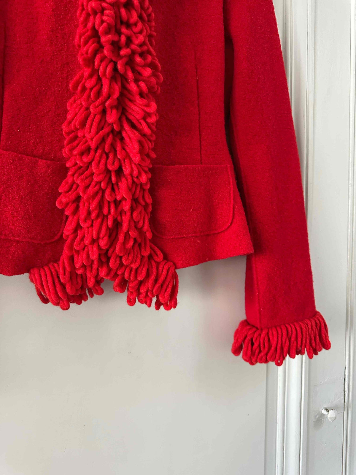 Prix unitaire parBlazer en laine, rouge vif, en laine bouillie, col et poignets en froufrous franges de laine, fermoirs petits crochets, convient aux tailles 34 et 36 portée ici sur un mannequin T36.