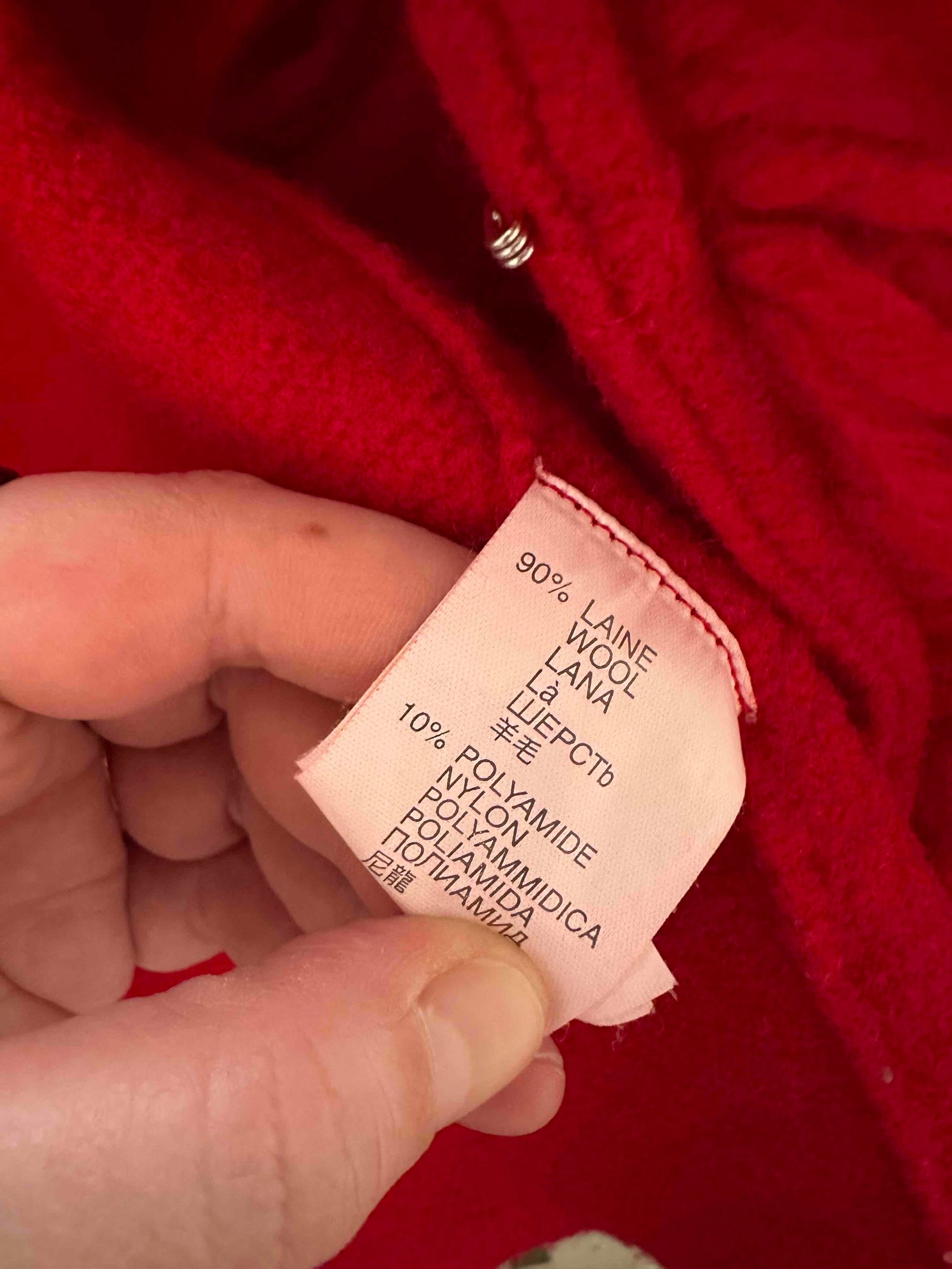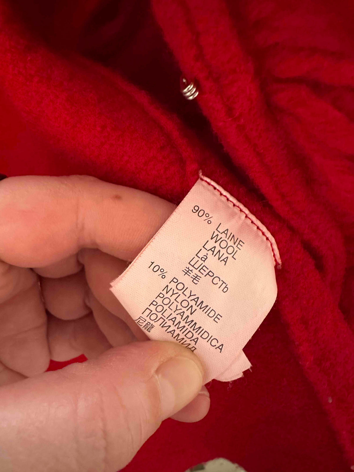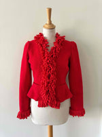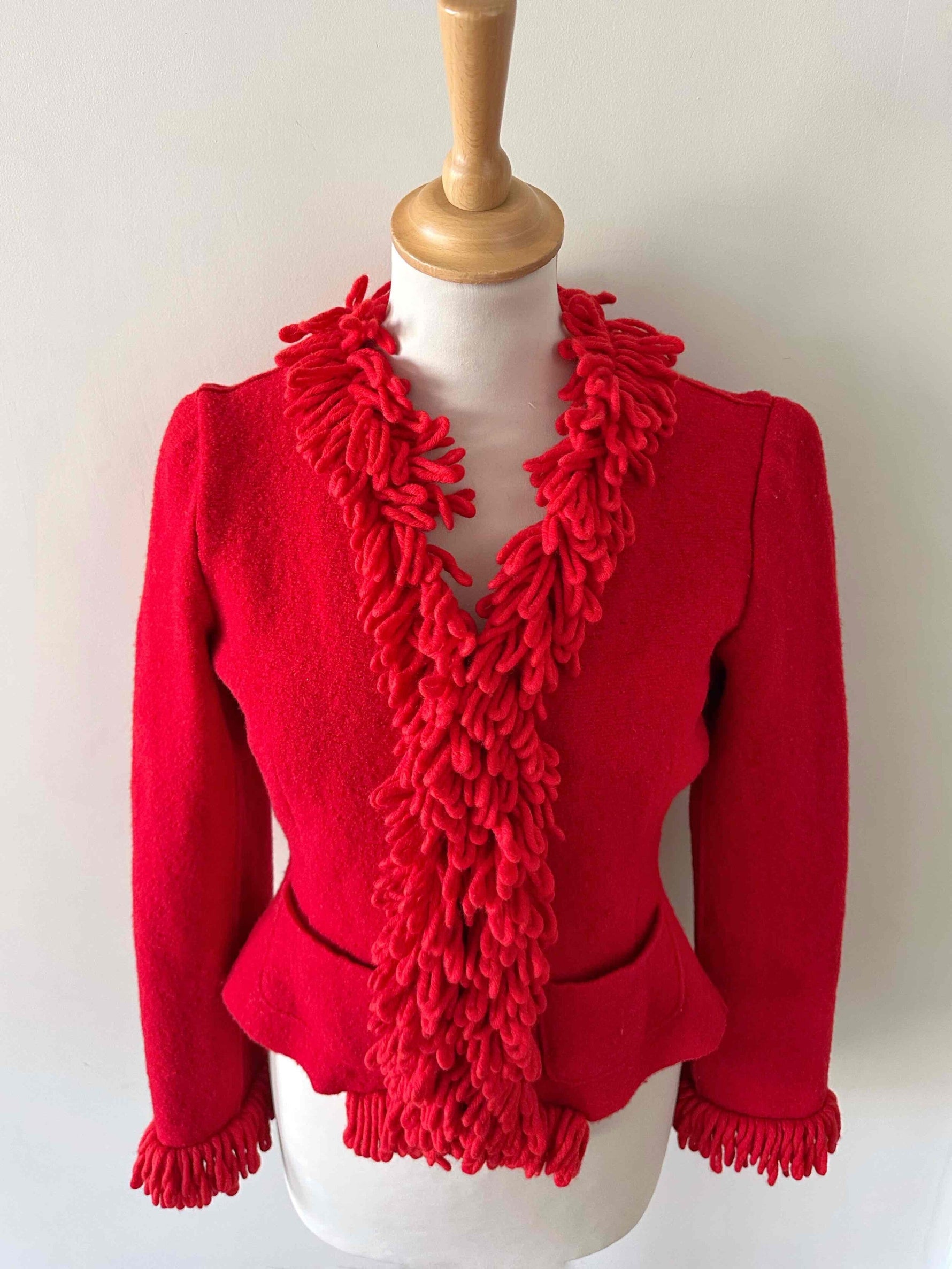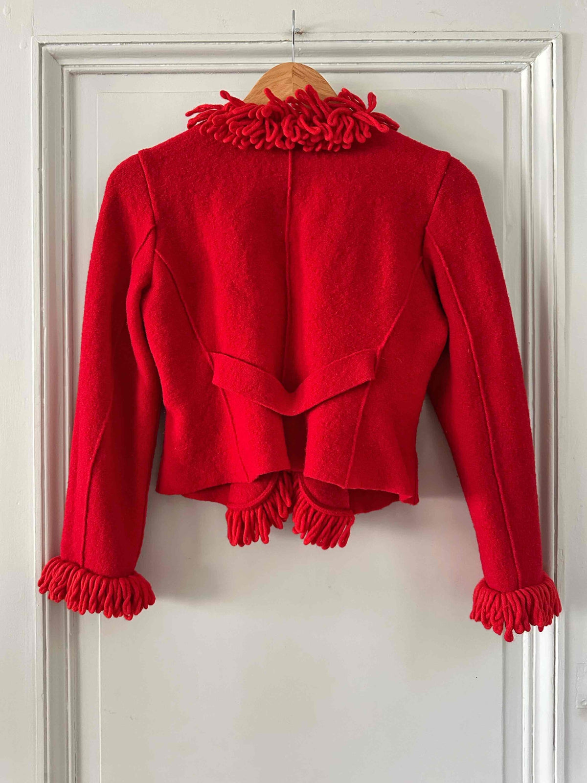 Prix unitaire parBlazer en laine, rouge vif, en laine bouillie, col et poignets en froufrous franges de laine, fermoirs petits crochets, convient aux tailles 34 et 36 portée ici sur un mannequin T36.