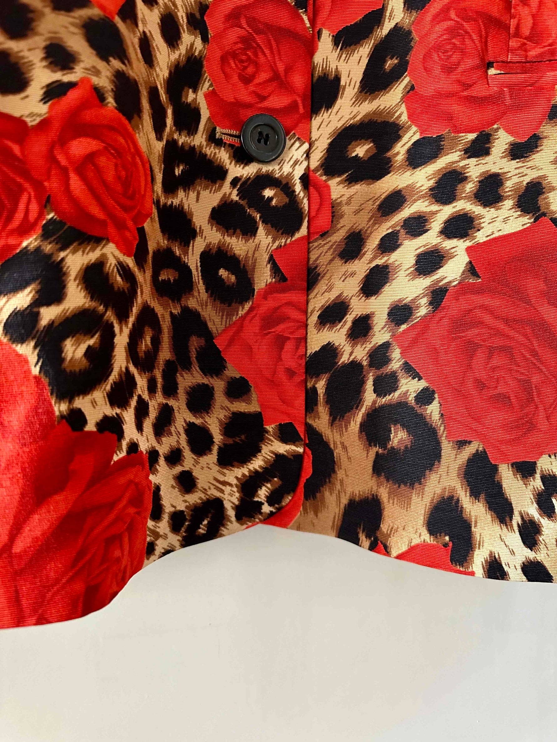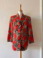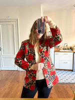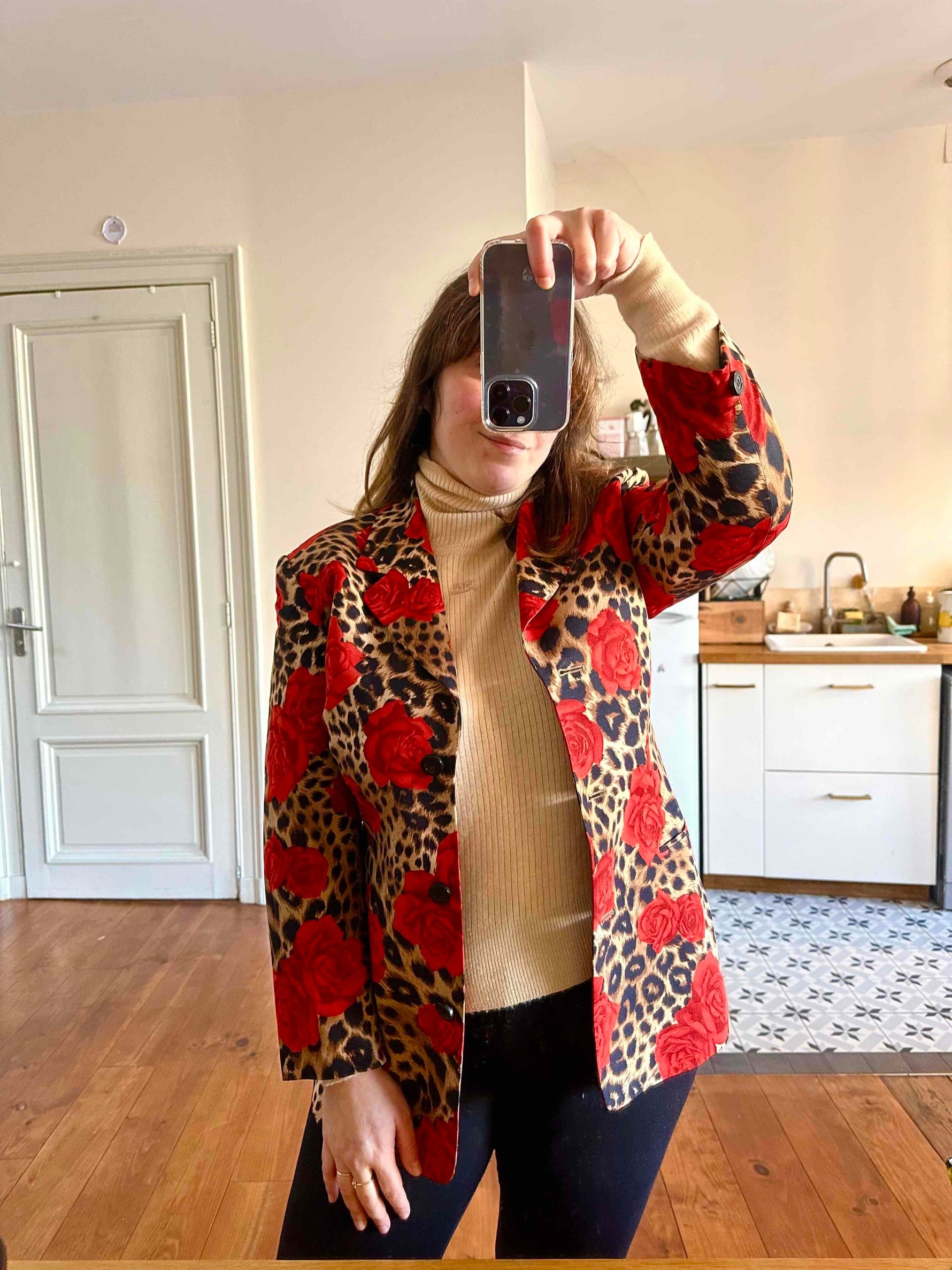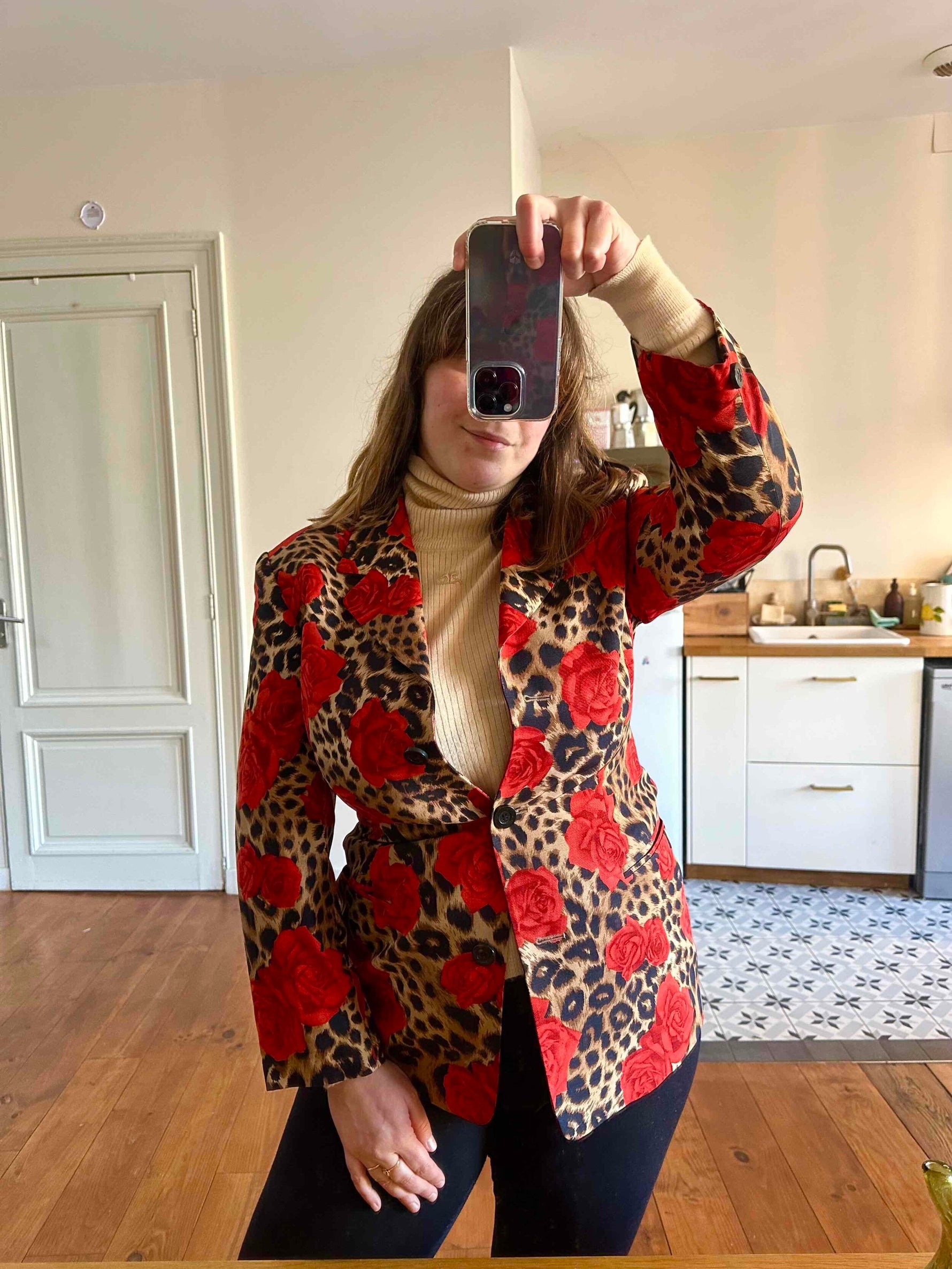 Prix unitaire parBlazer leoaprd fleuri en laine et soie Laurel, drap de laine vierge et soie imprimée léopard et roses rouges, fermeture par trois boutons, taille 38 actuelle portée ici ouverte sur une personne T40 et sur un mannequin T36.