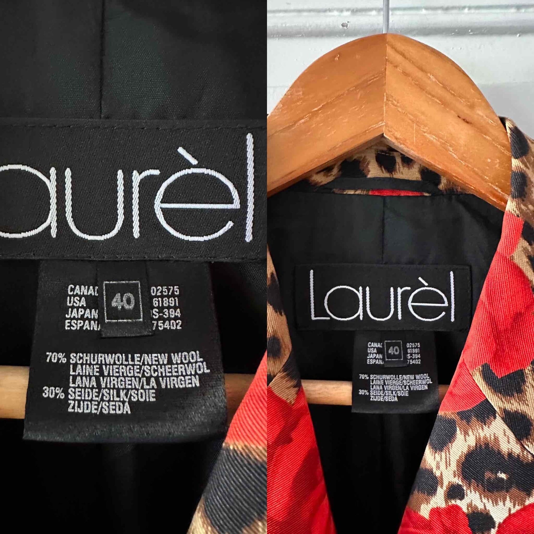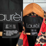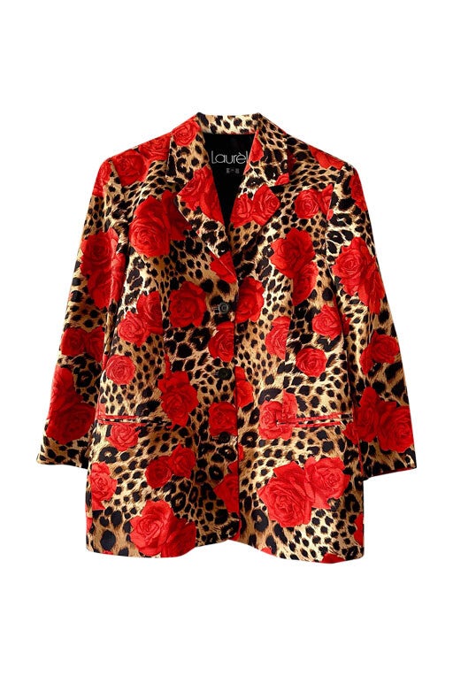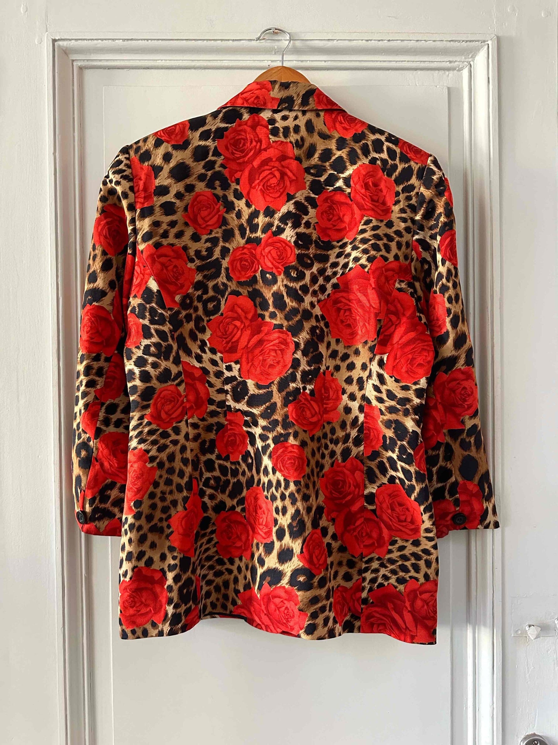 Prix unitaire parBlazer leoaprd fleuri en laine et soie Laurel, drap de laine vierge et soie imprimée léopard et roses rouges, fermeture par trois boutons, taille 38 actuelle portée ici ouverte sur une personne T40 et sur un mannequin T36.