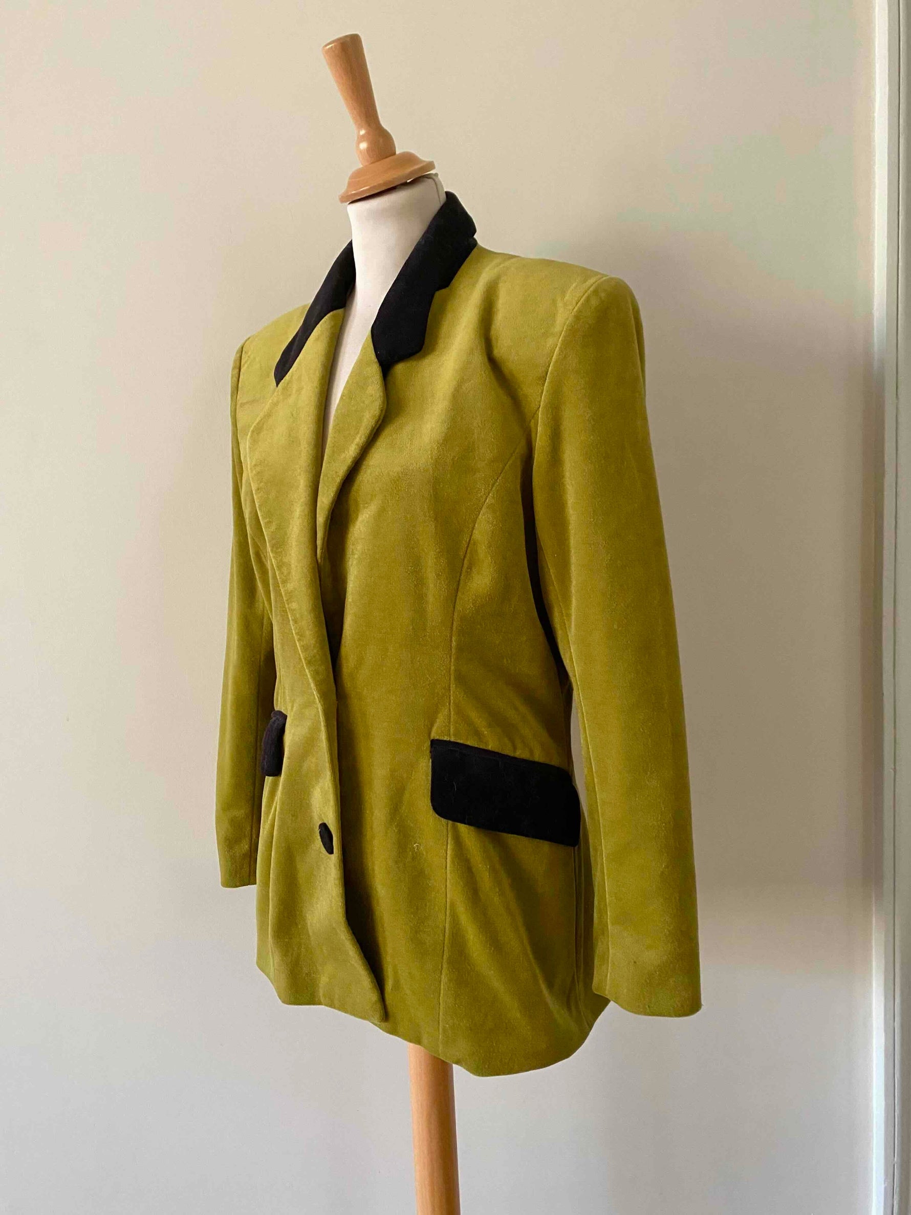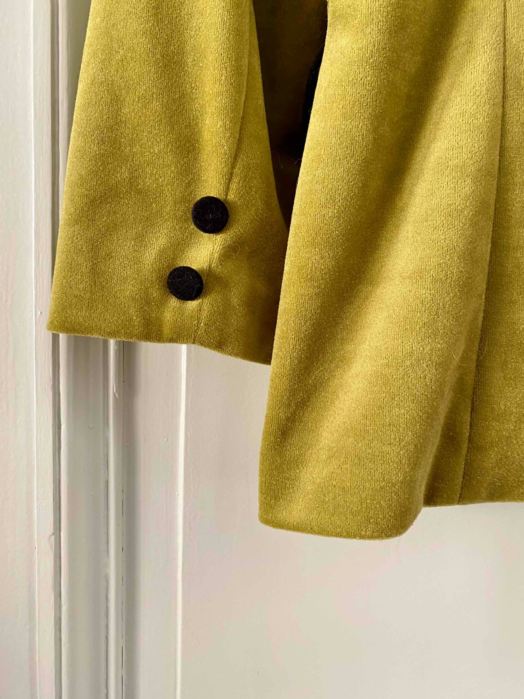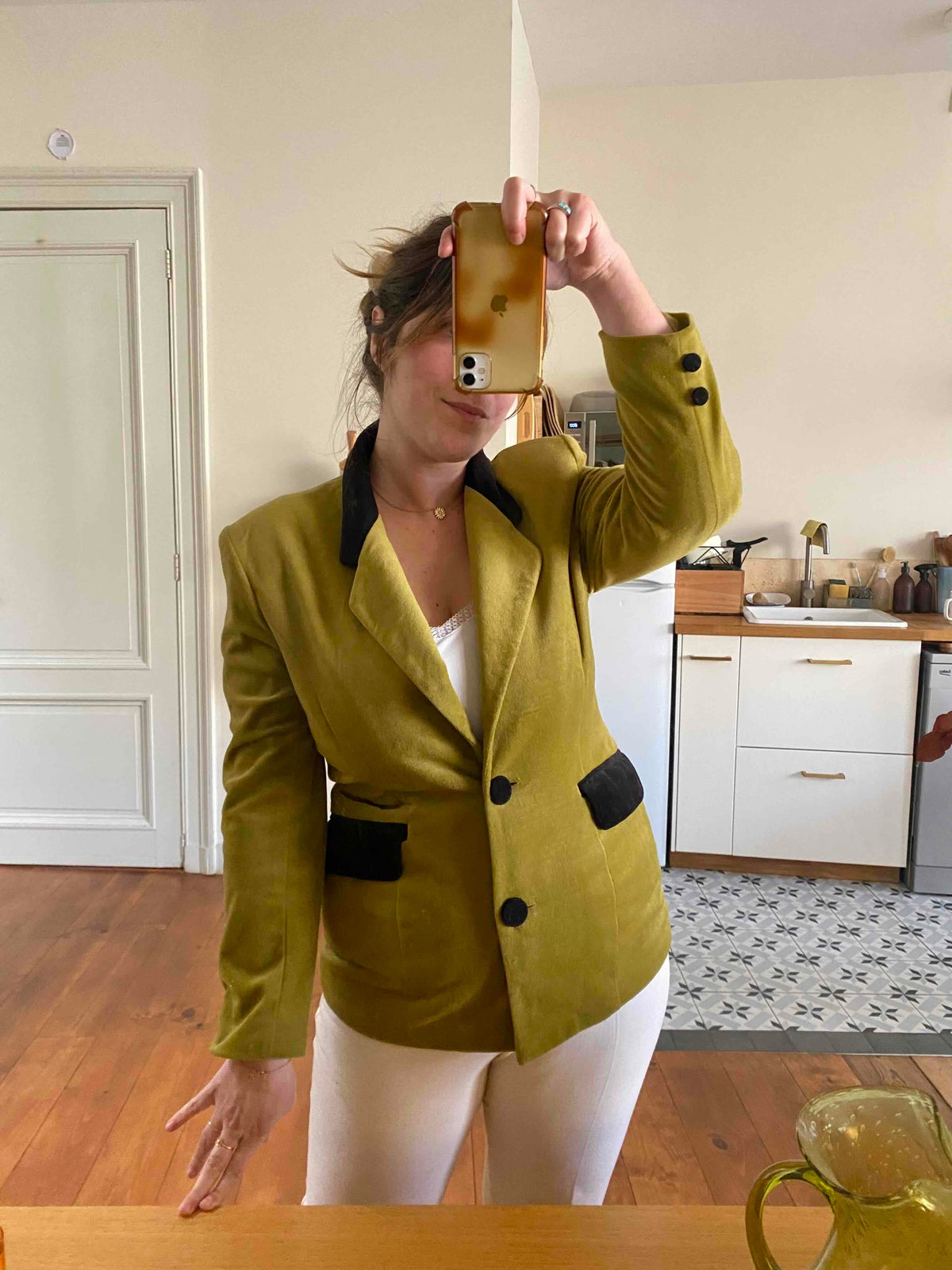 Blazer en velours ras vert olive anis, col, poches et boutons en velours noir, col V échancré, épaulettes fines, fabriqué au Japon, taille 38 portée ici sur un mannequin T36 et serrée sur une personne T40.