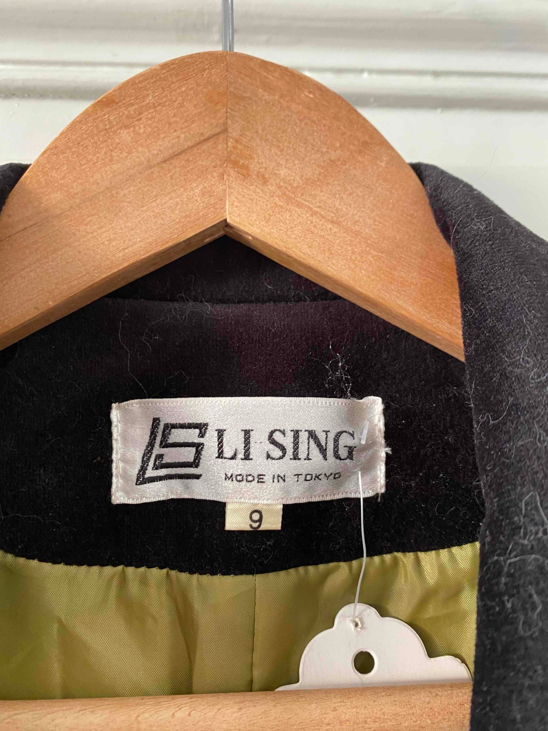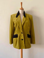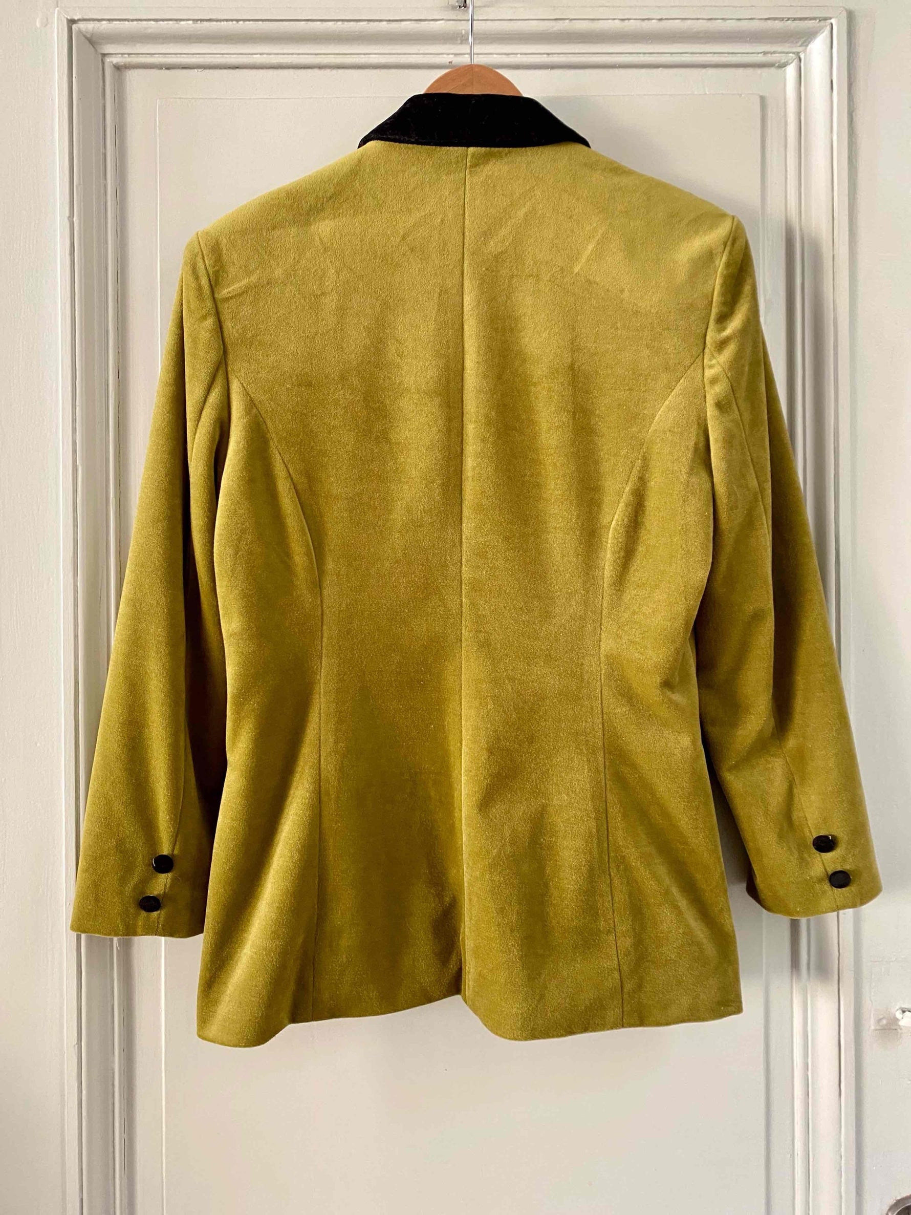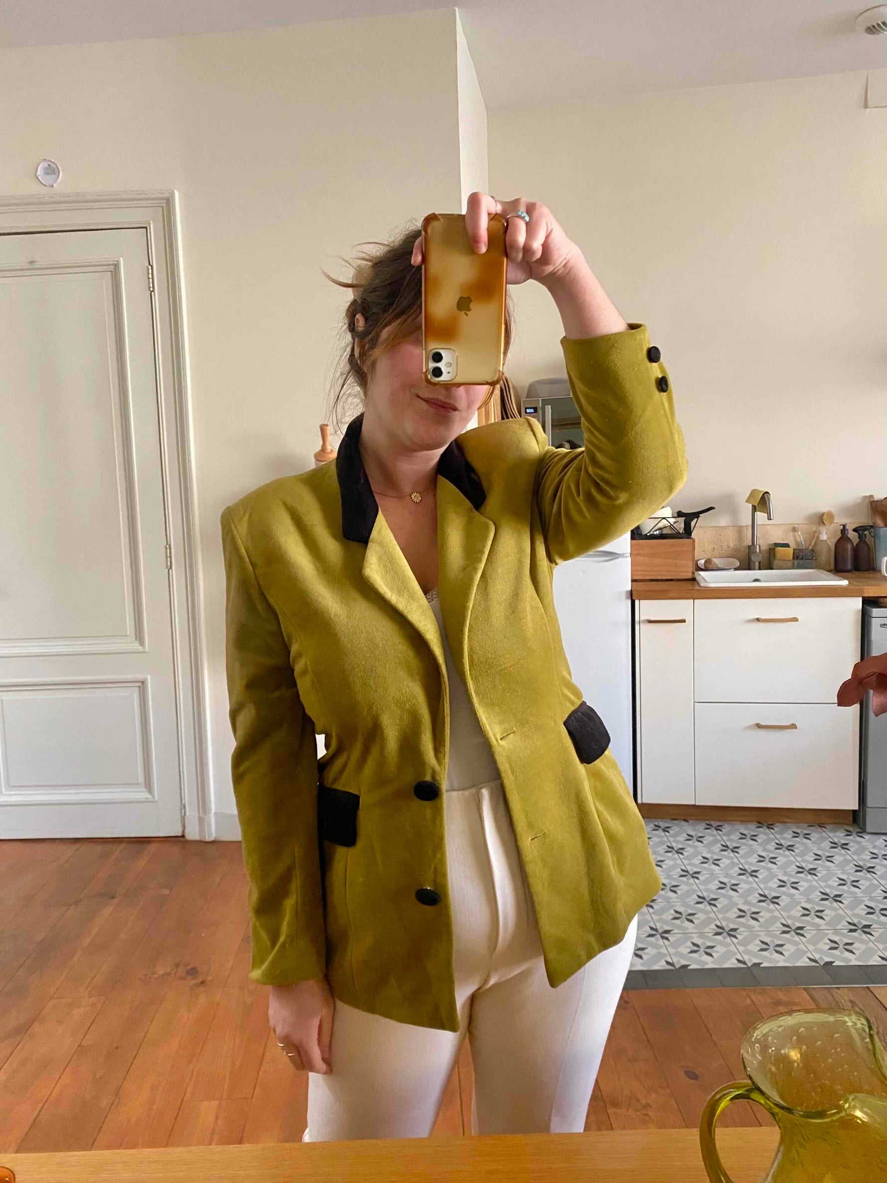 Blazer en velours ras vert olive anis, col, poches et boutons en velours noir, col V échancré, épaulettes fines, fabriqué au Japon, taille 38 portée ici sur un mannequin T36 et serrée sur une personne T40.