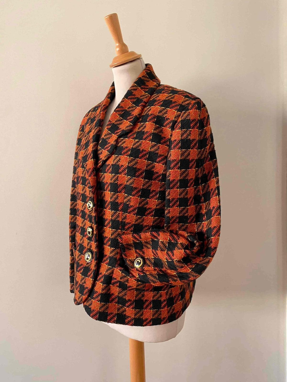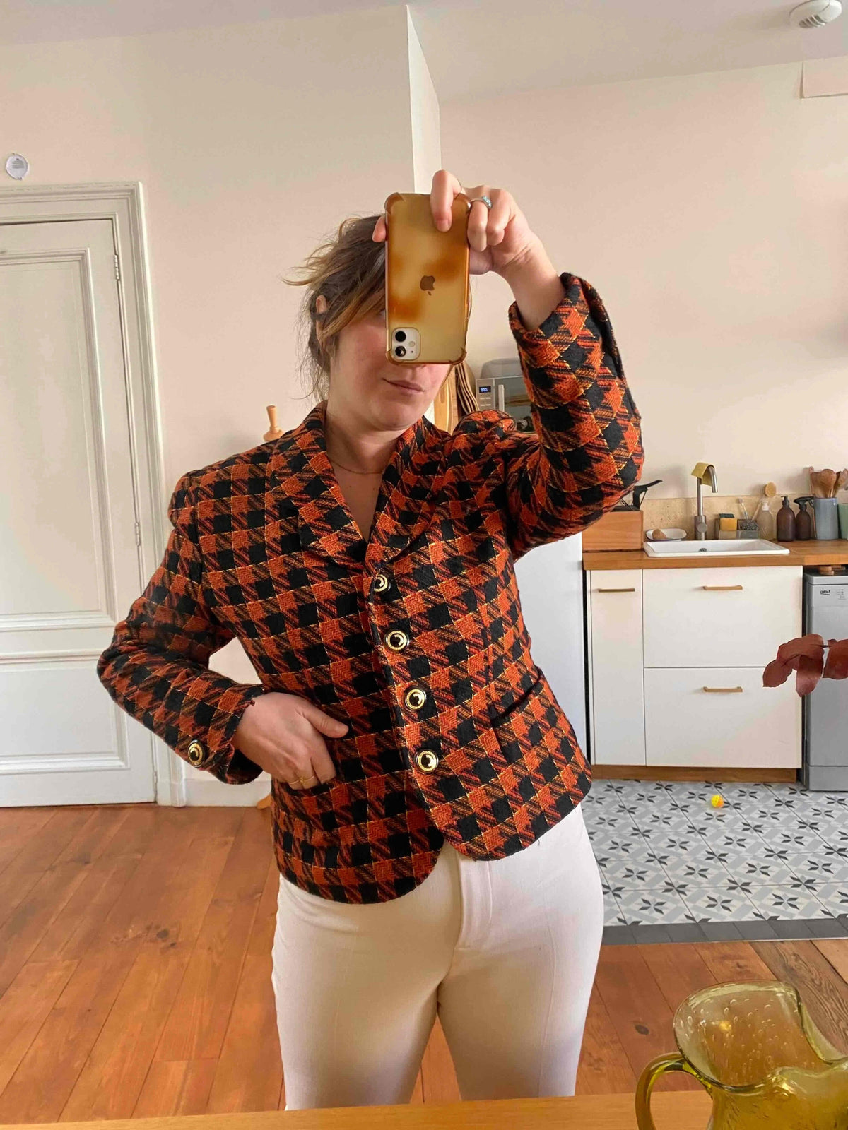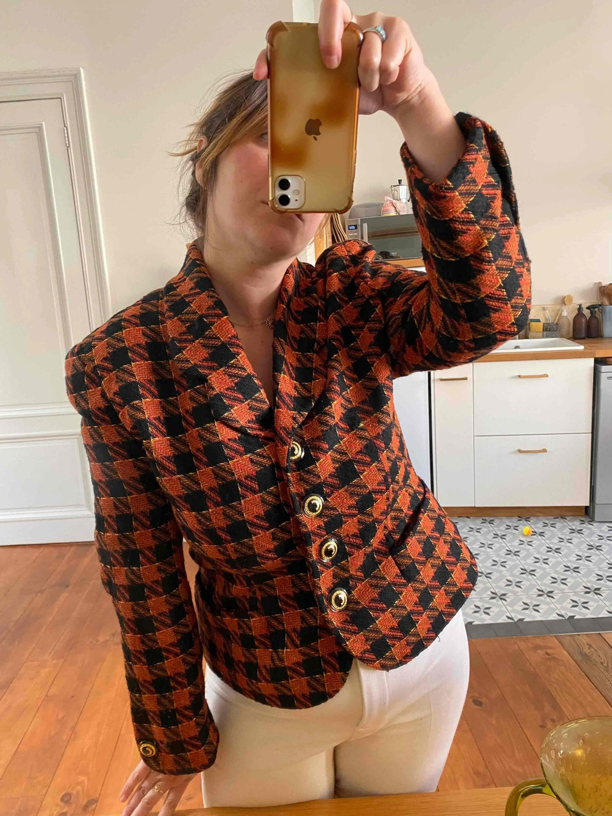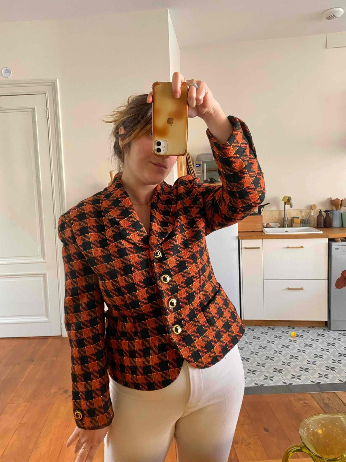 Prix unitaire parBlazer Guy Laroche, pied de poule en laine tweed orange, rouge, jaune, et noir, et doré , boutons bijoux dorés et noir avec initiales, forme courte, taille 38 porté ici sur un mannequin T36 et serré sur une personne T40.