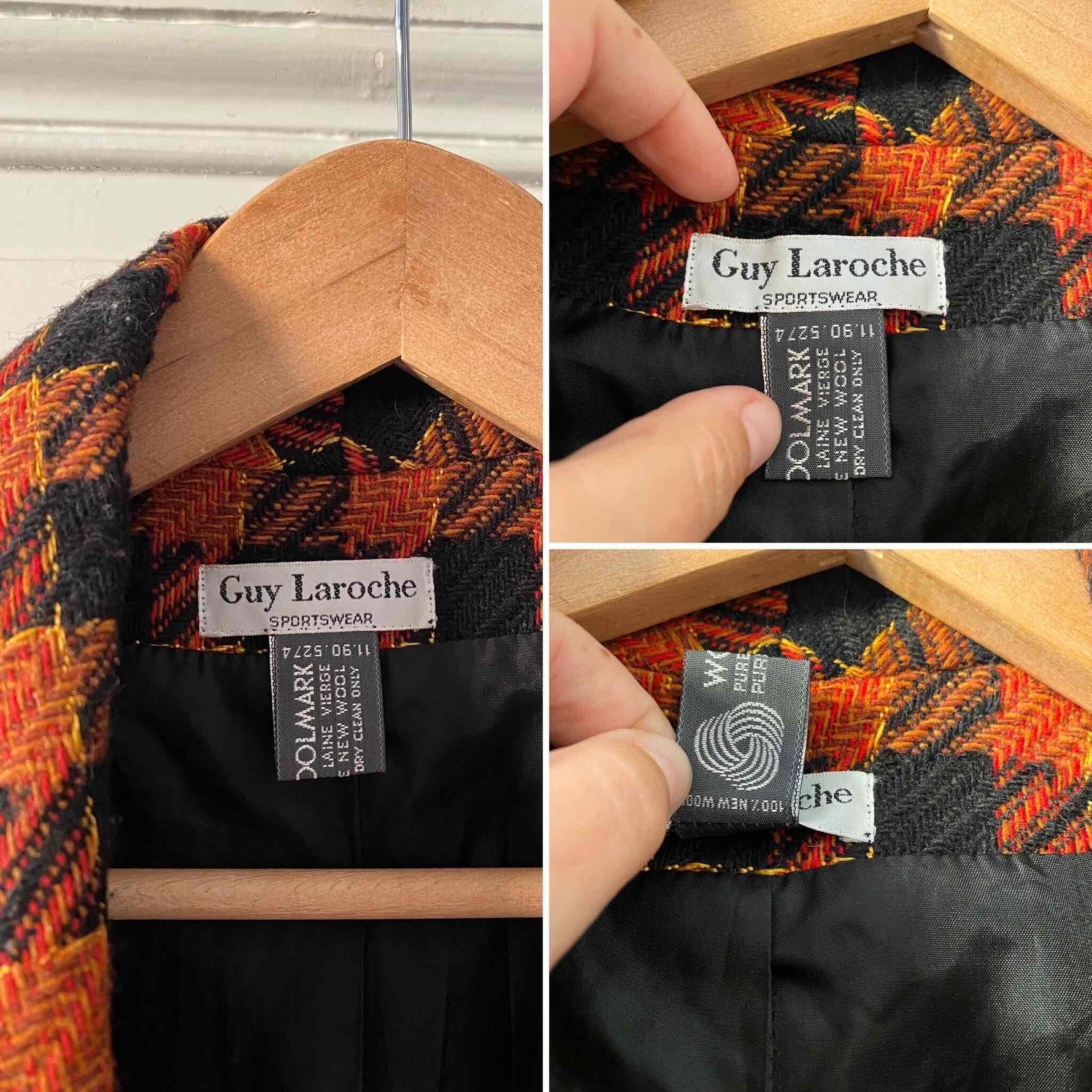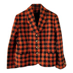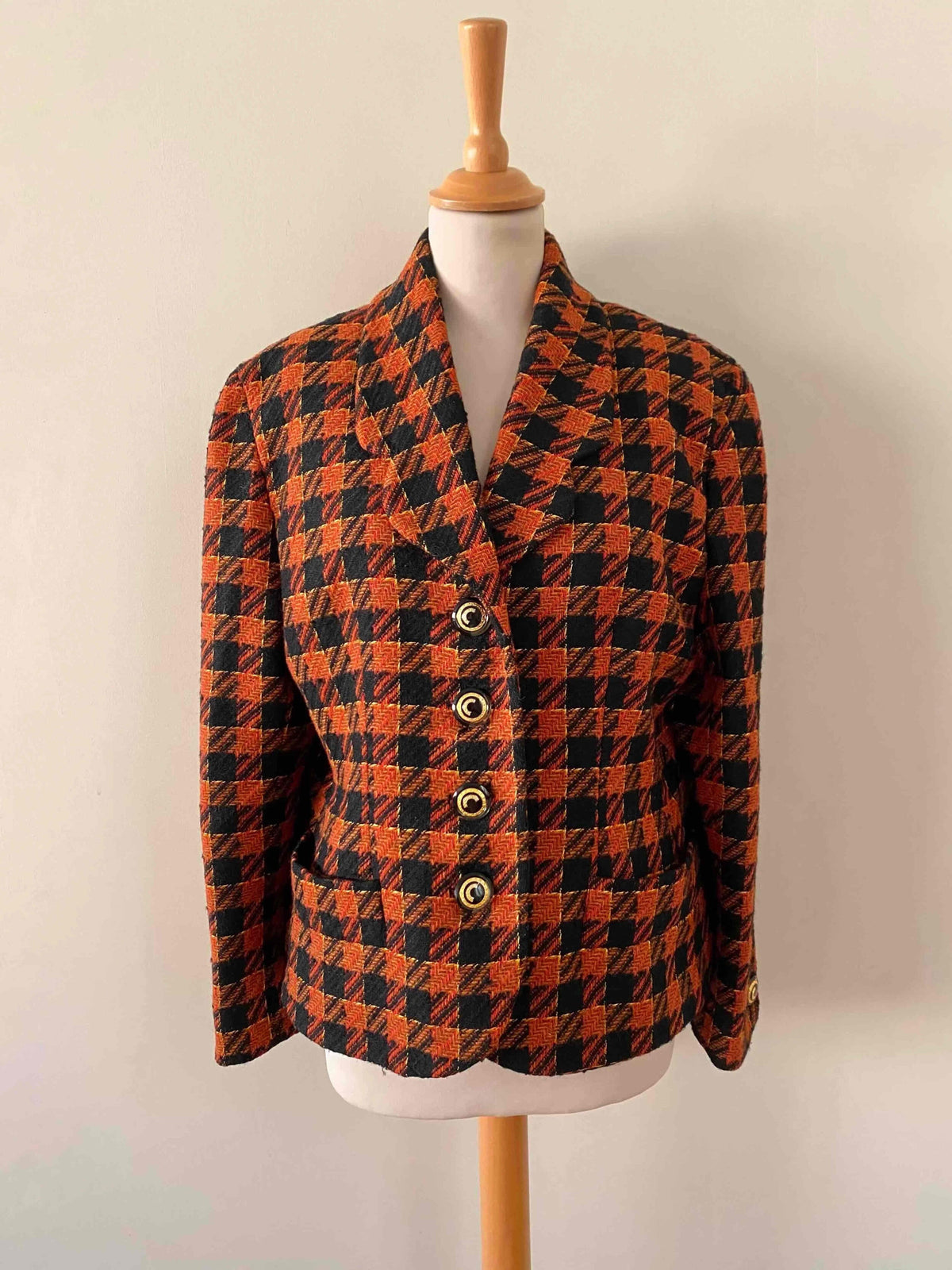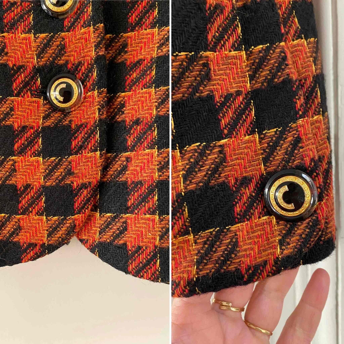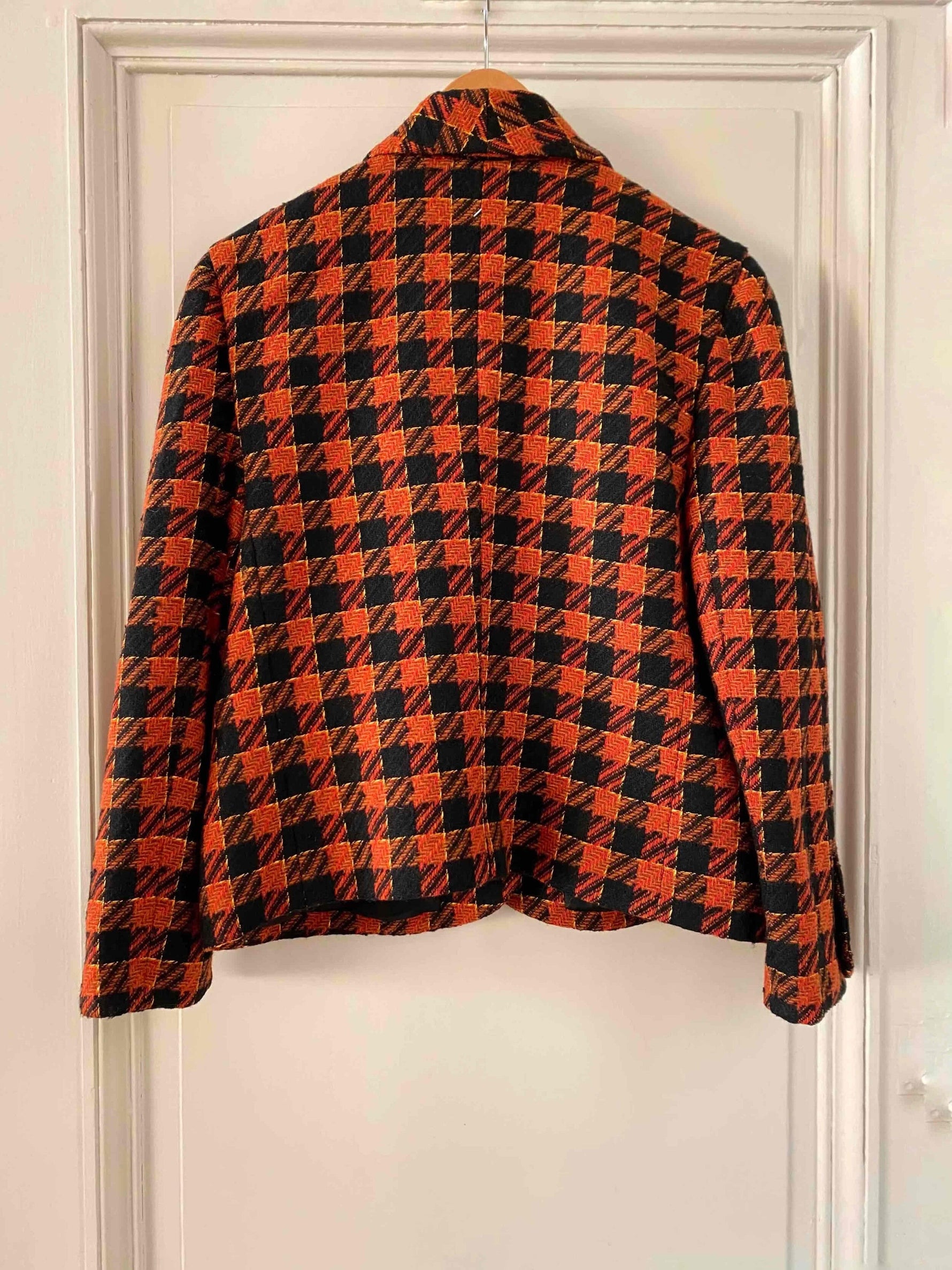 Prix unitaire parBlazer Guy Laroche, pied de poule en laine tweed orange, rouge, jaune, et noir, et doré , boutons bijoux dorés et noir avec initiales, forme courte, taille 38 porté ici sur un mannequin T36 et serré sur une personne T40.