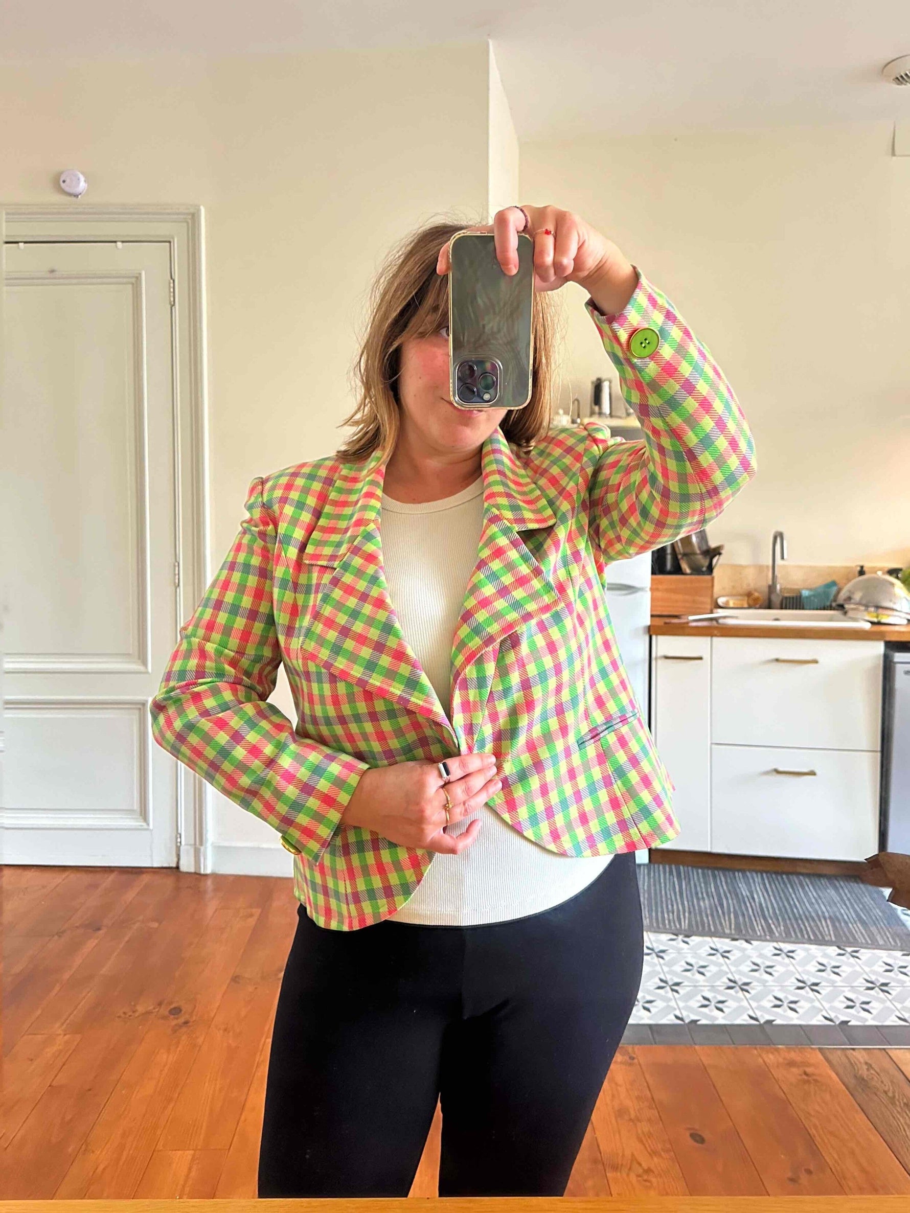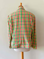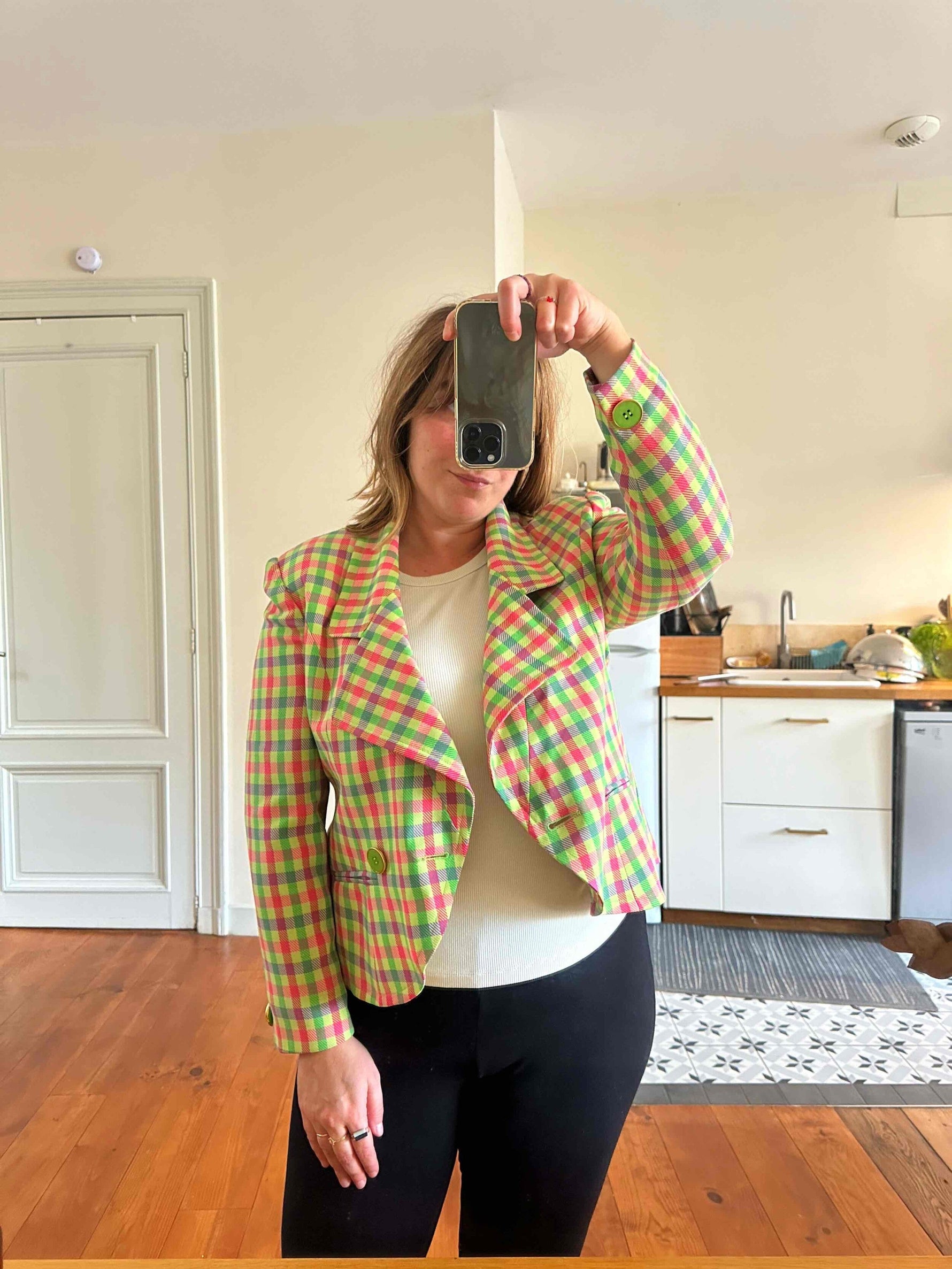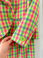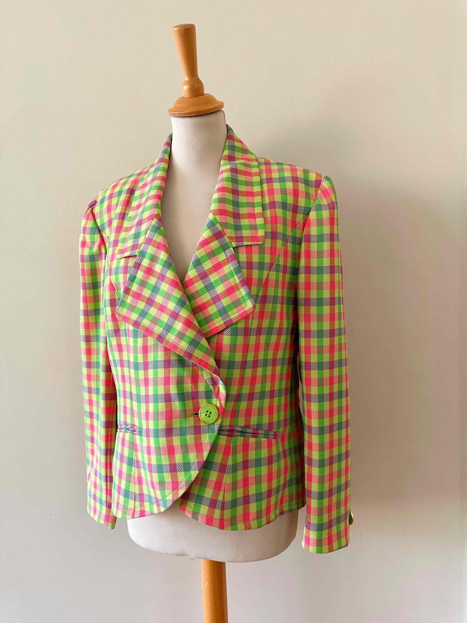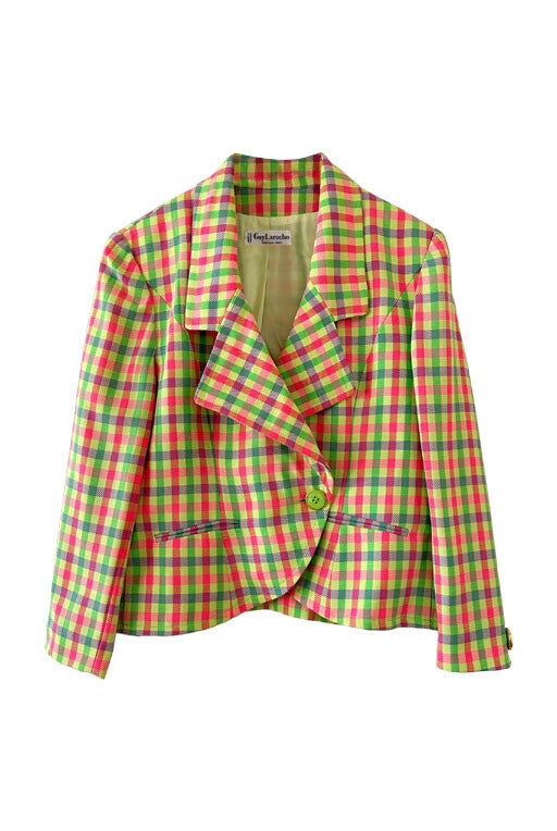 Prix unitaire parBlazer Guy Laroche blazer en laine, carreaux fluo roses, citron vert et violet lilas. Forme courte esprit spencer boutonnage croisé, fabriqué en France, taille 38 porté ici sur un mannequin T36 et ouvert sur une personne T40.