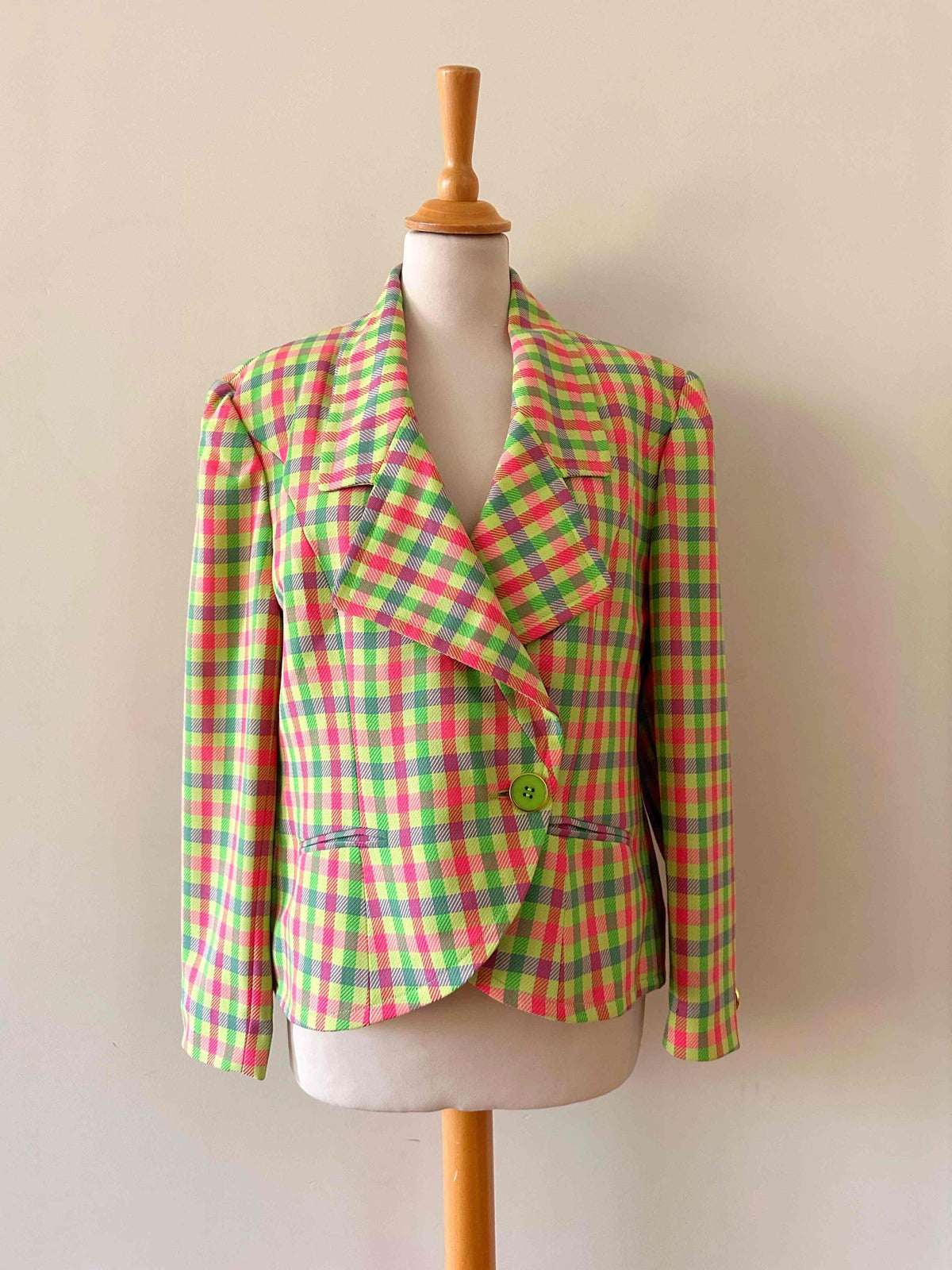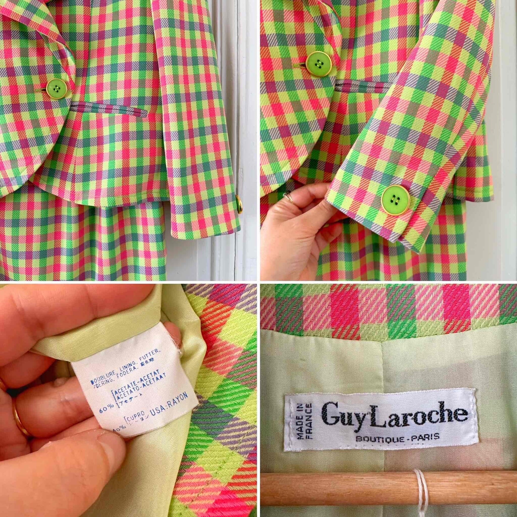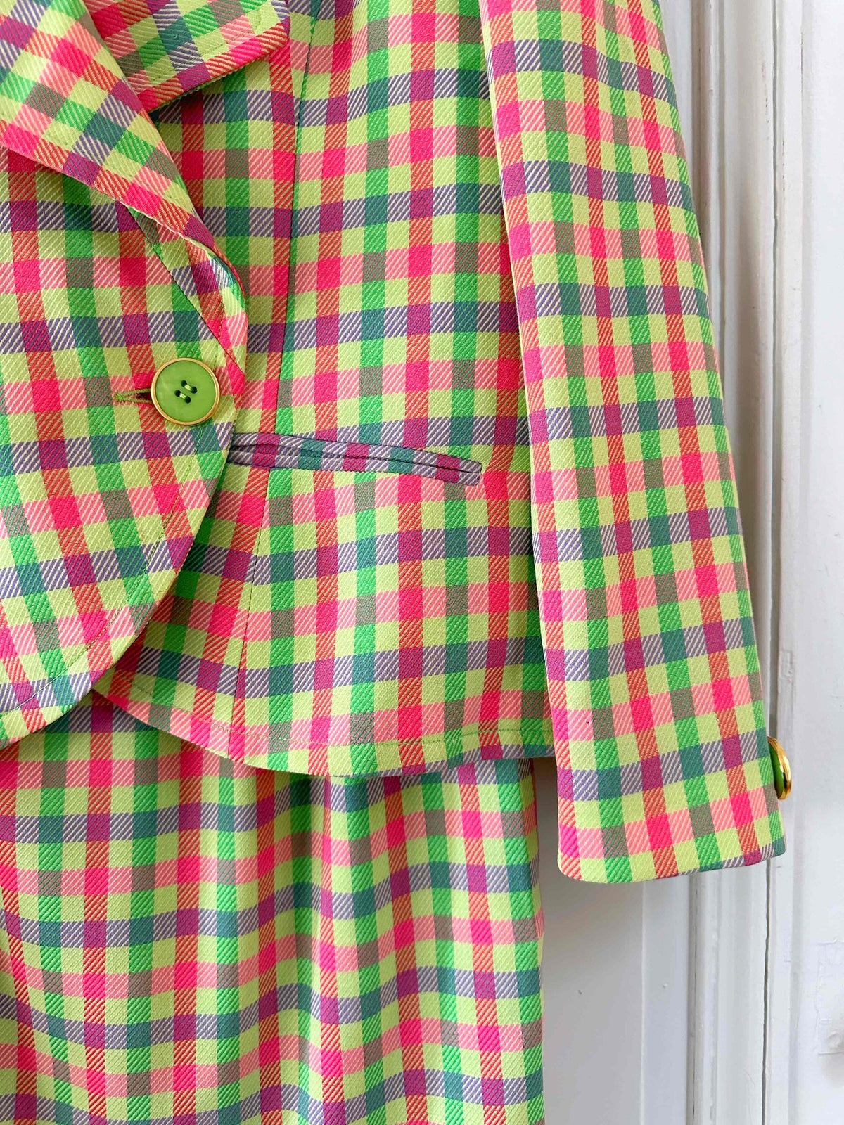 Prix unitaire parBlazer Guy Laroche blazer en laine, carreaux fluo roses, citron vert et violet lilas. Forme courte esprit spencer boutonnage croisé, fabriqué en France, taille 38 porté ici sur un mannequin T36 et ouvert sur une personne T40.