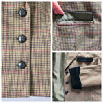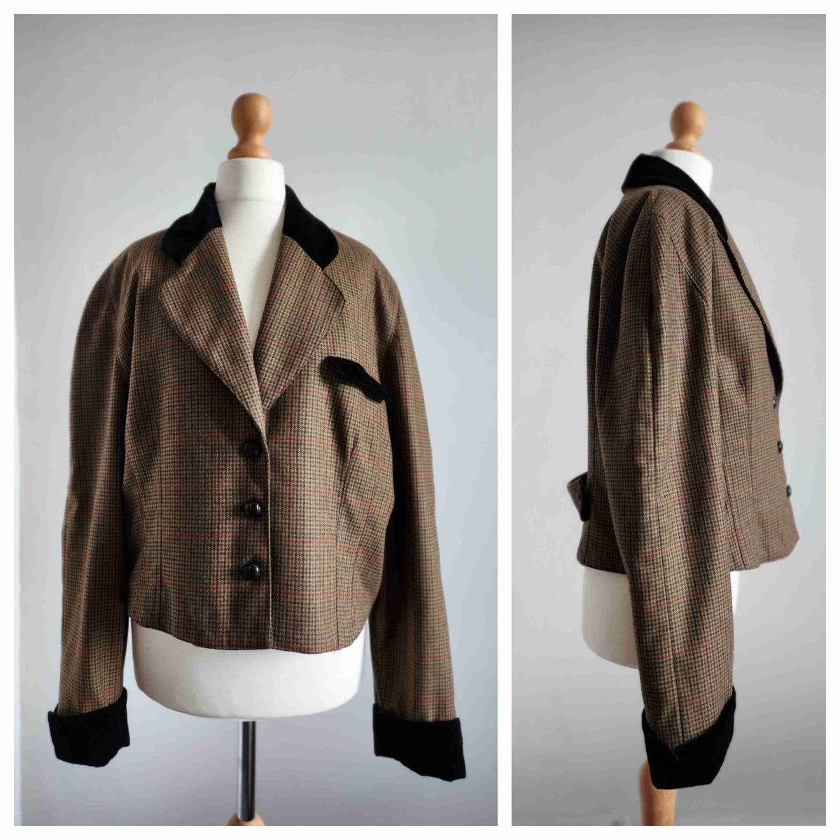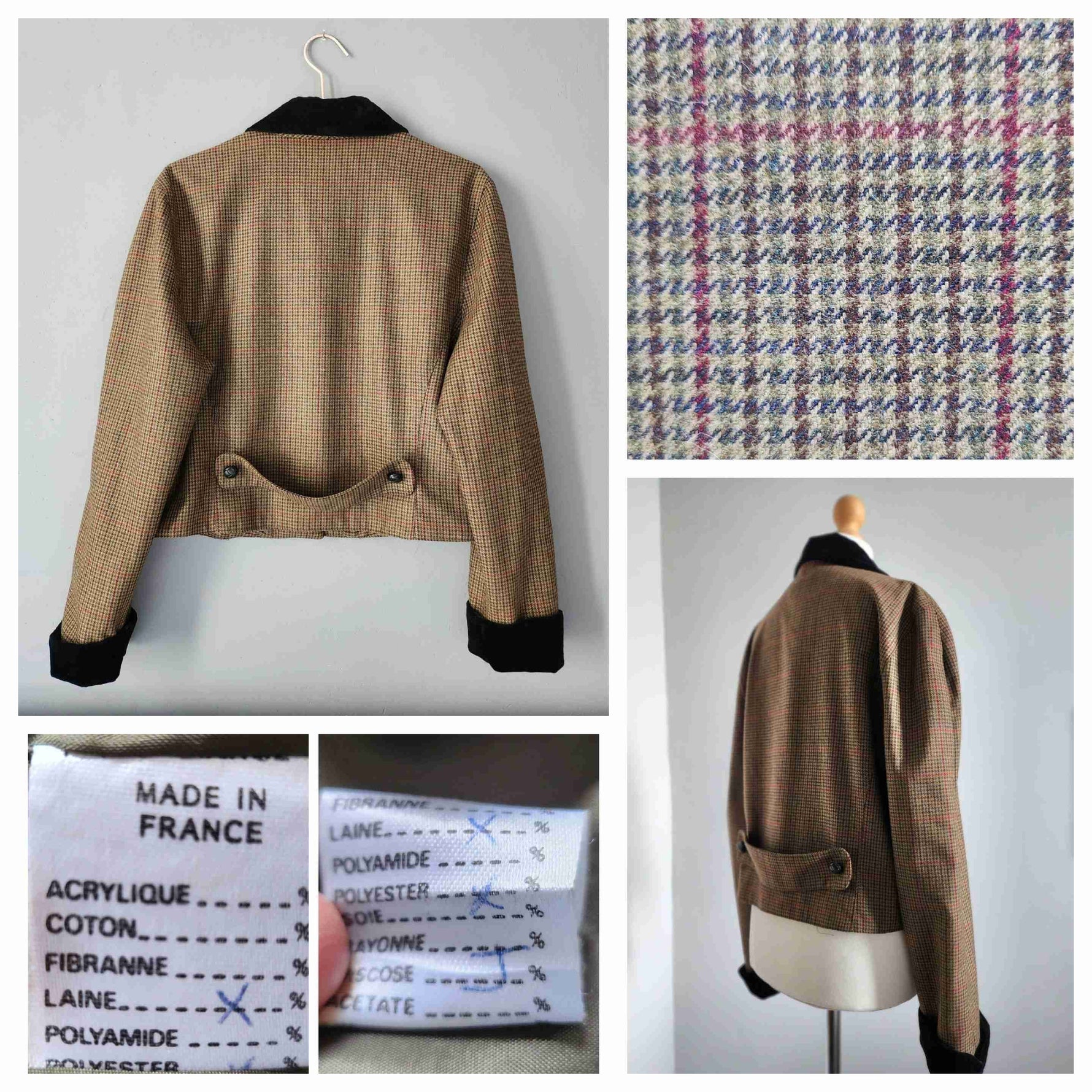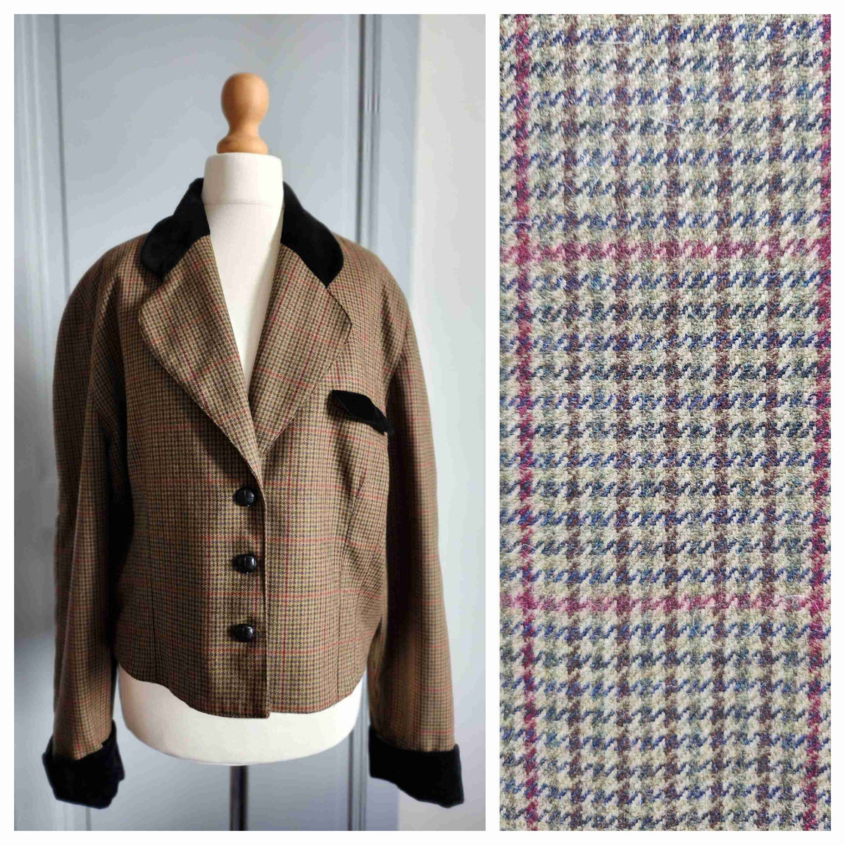 Prix unitaire parBlazer court cavalière en laine mélangée Prince de Galles brun/kaki/bordeaux, doublé viscose kaki, trois boutons esprit cuir, détails de velours noir au col et revers. Fabriqué en France.