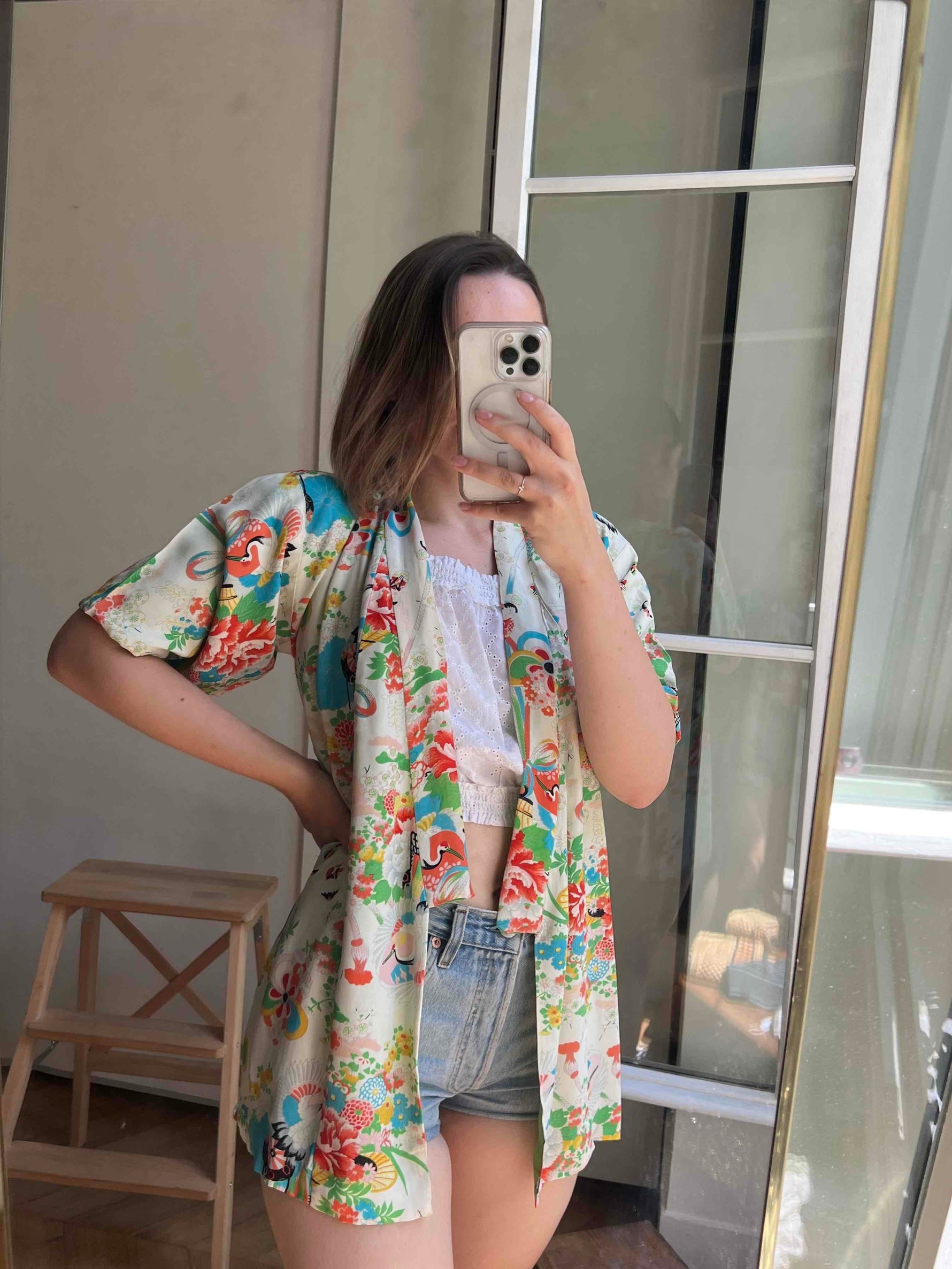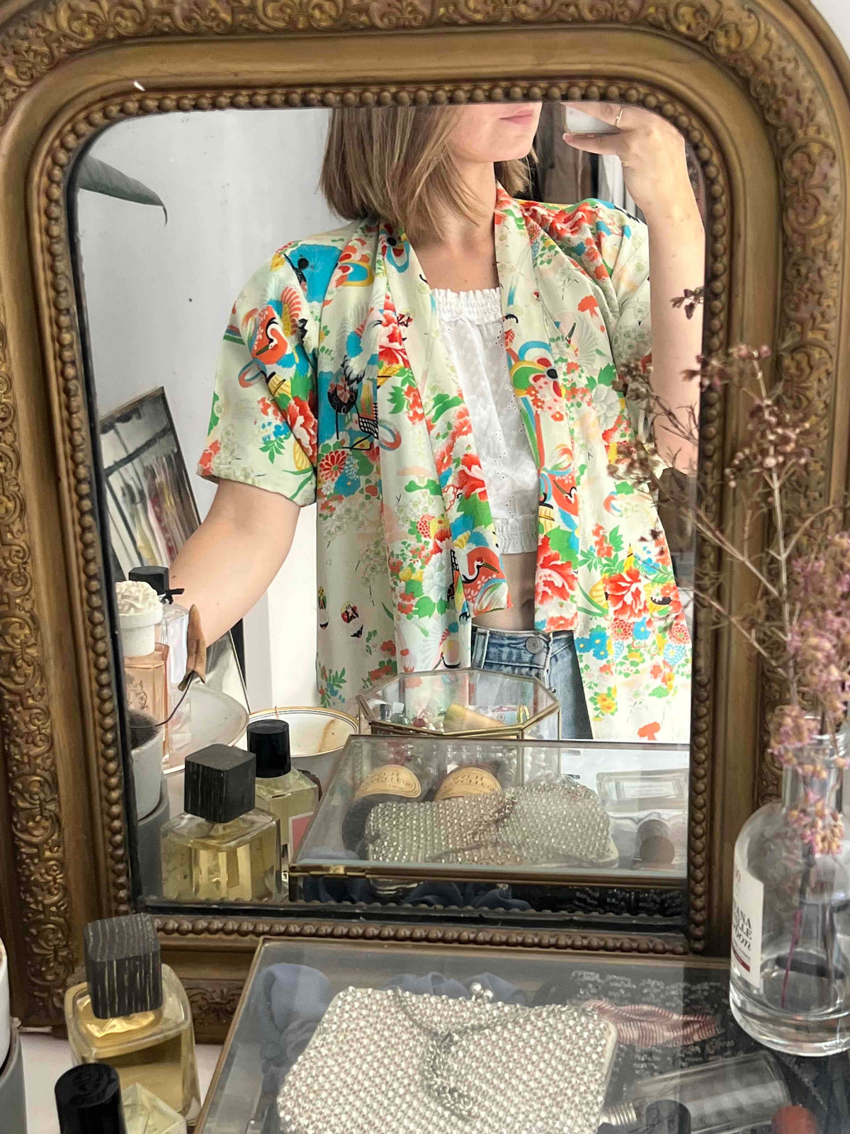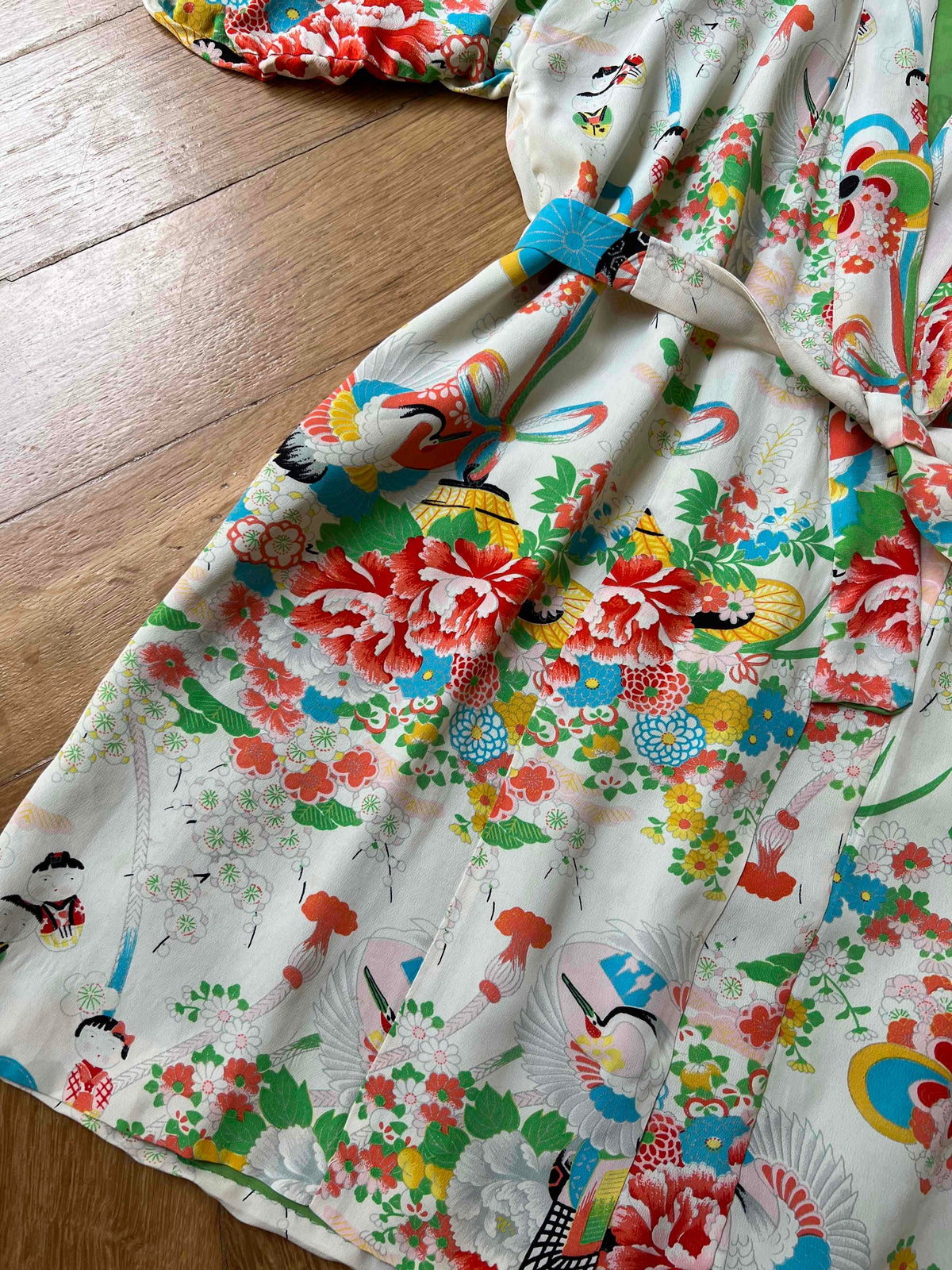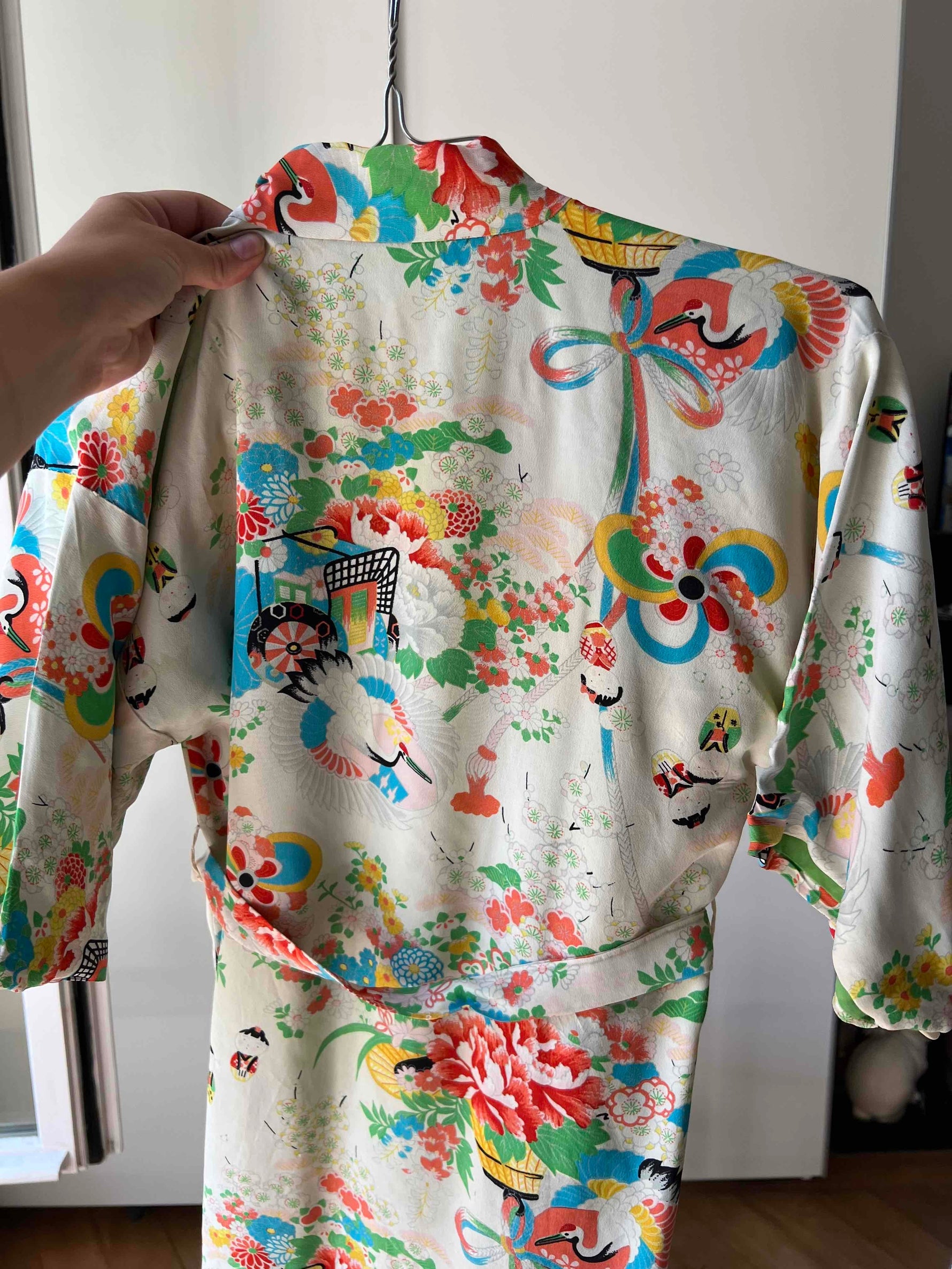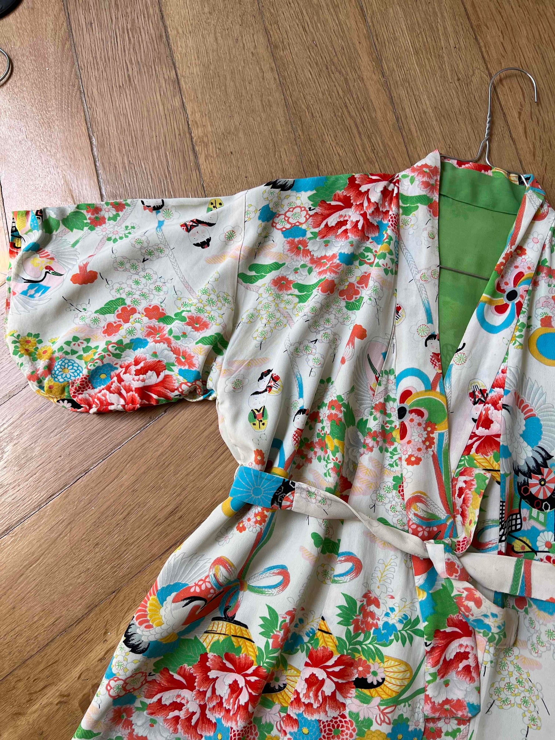 Prix unitaire parKimono japonais en soie écru avec un motif multicolore de personnages et fleurs. Excellent état. Détails fait main. Ceinture et manches traditionnelles. Taille 34/36/38. Foulure vert pomme.