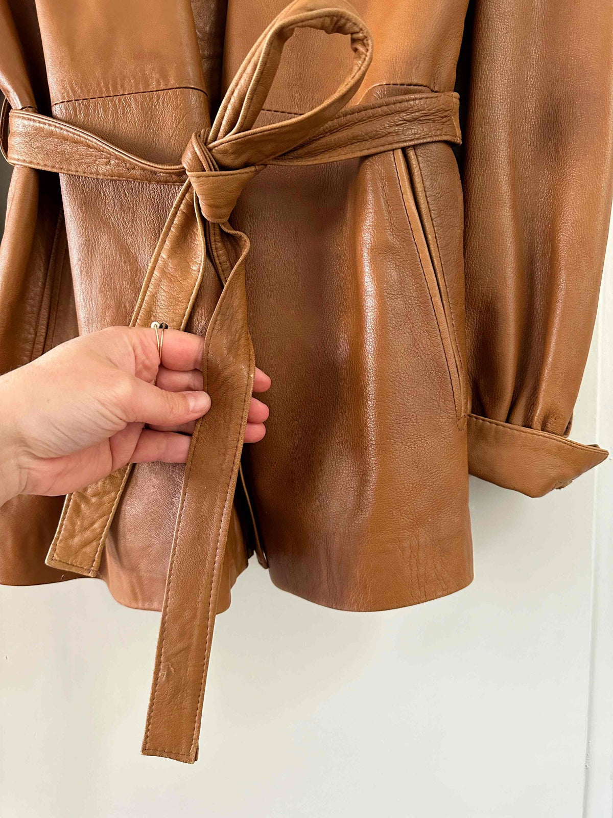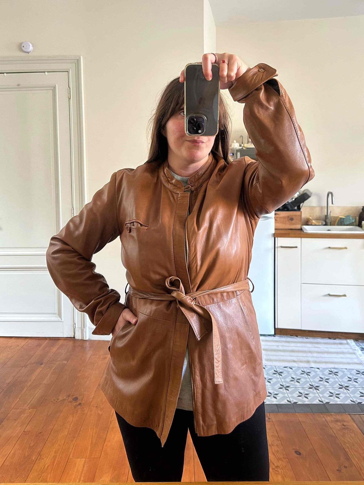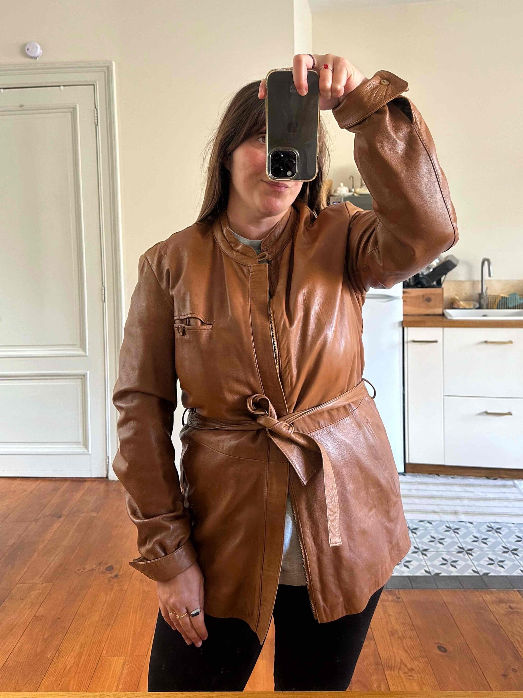 Prix unitaire parSaharienne en cuir, cuir d’agneau cognac fauve, fermeture éclair, ceinture taille à nouer, fabriquée en Italie, convient aux tailles 38 et 40 portée ici sur un mannequin T36 et une personne T40.