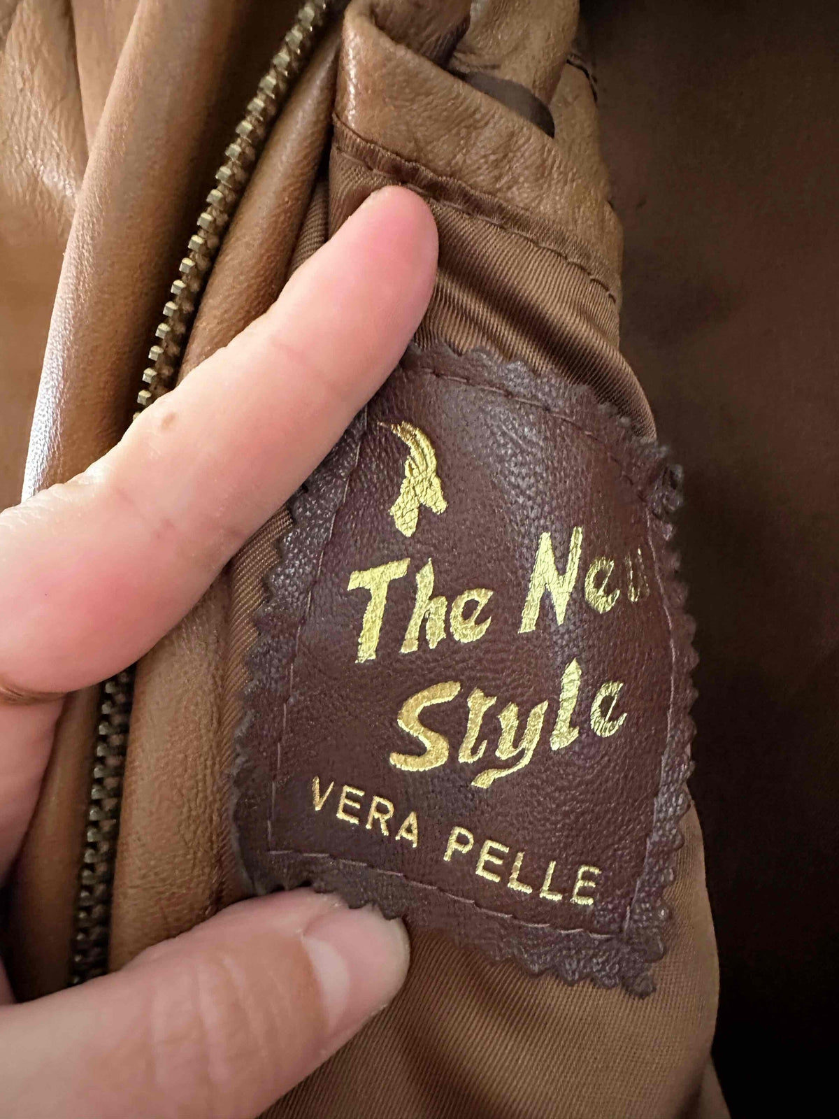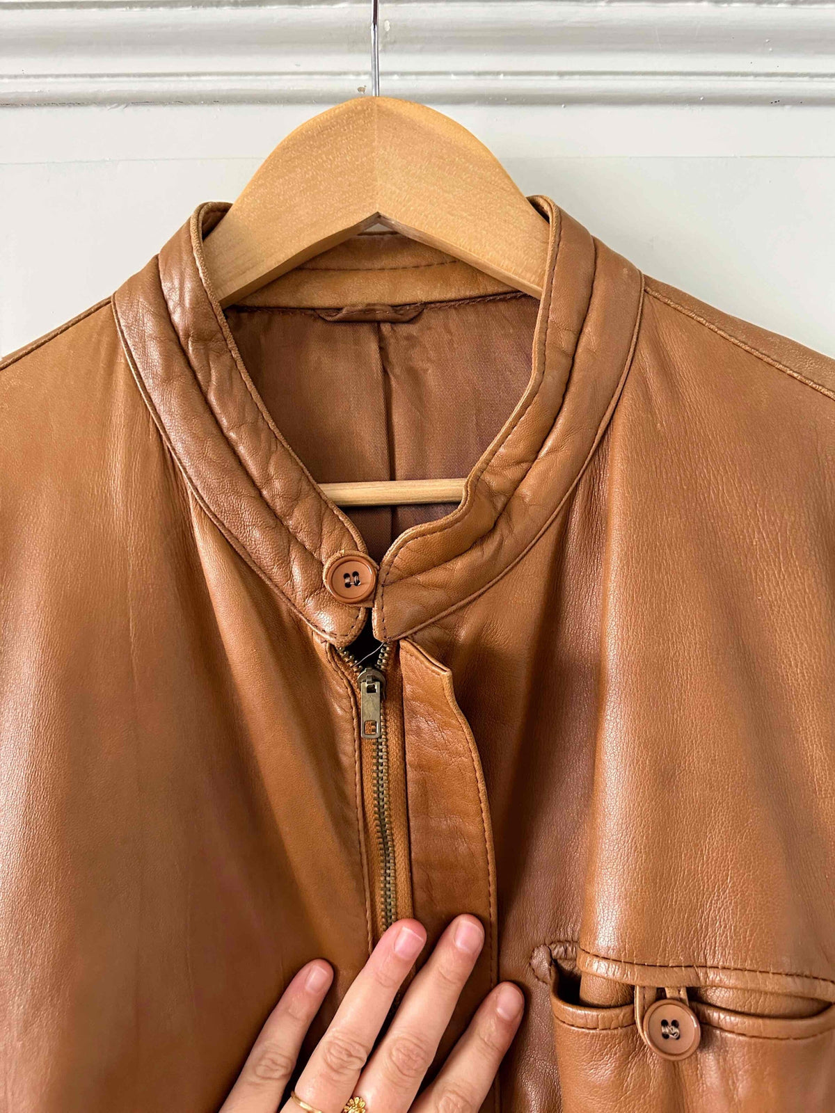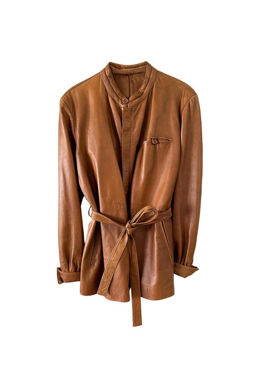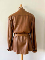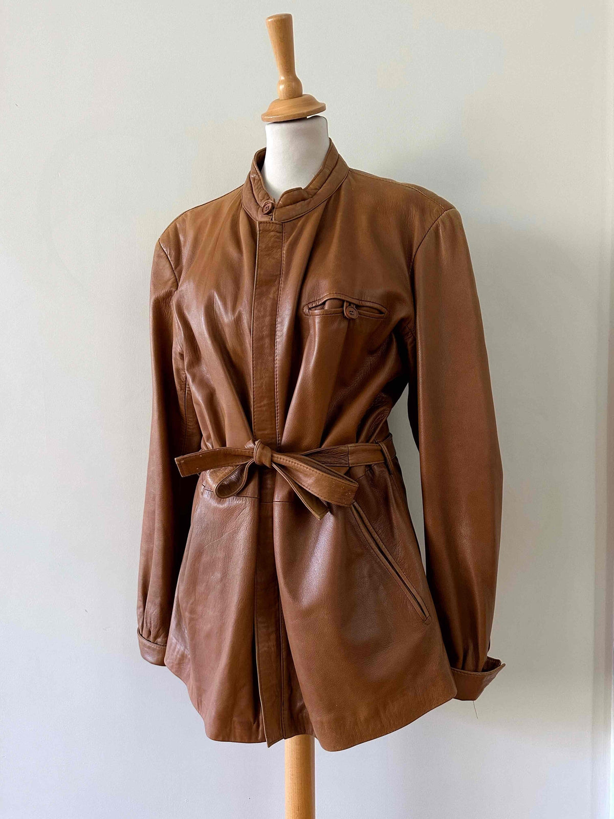 Prix unitaire parSaharienne en cuir, cuir d’agneau cognac fauve, fermeture éclair, ceinture taille à nouer, fabriquée en Italie, convient aux tailles 38 et 40 portée ici sur un mannequin T36 et une personne T40.