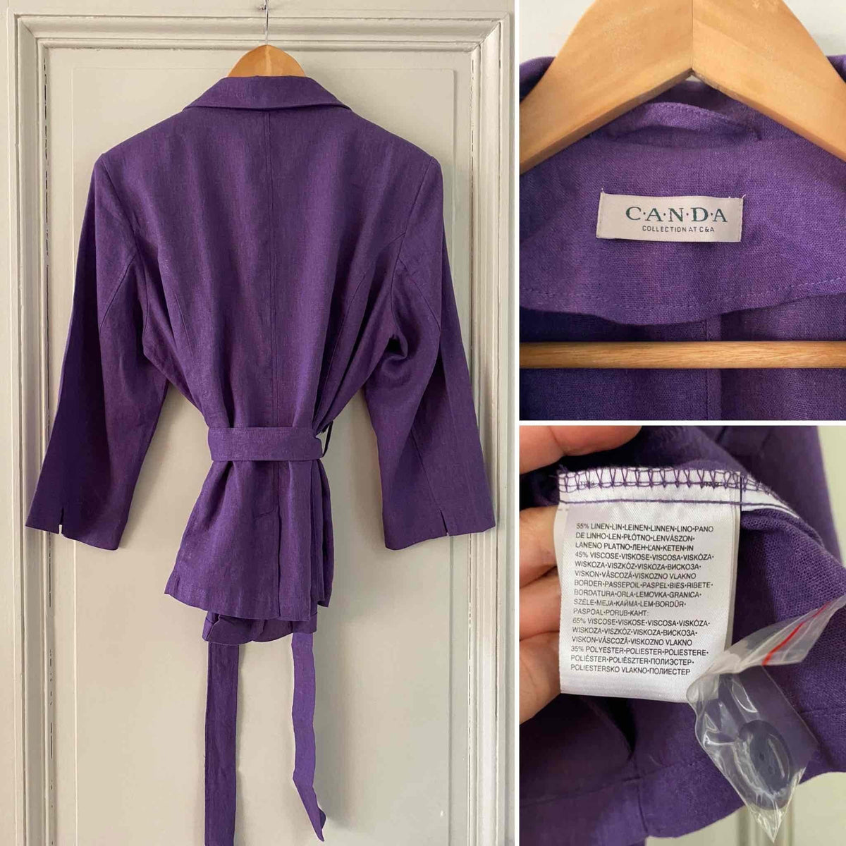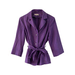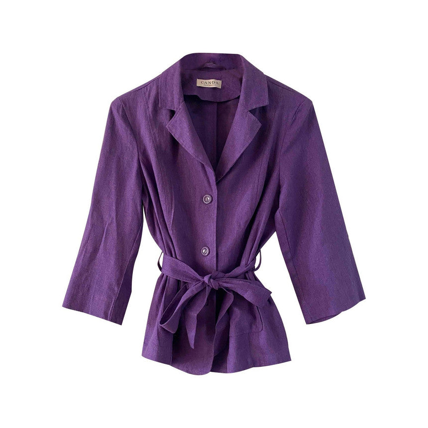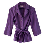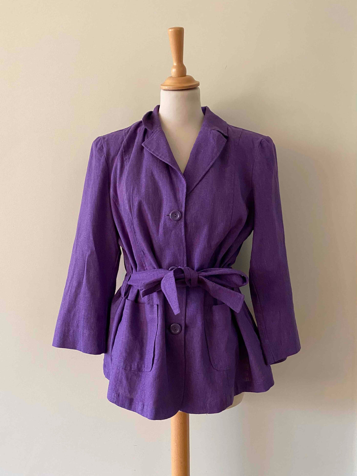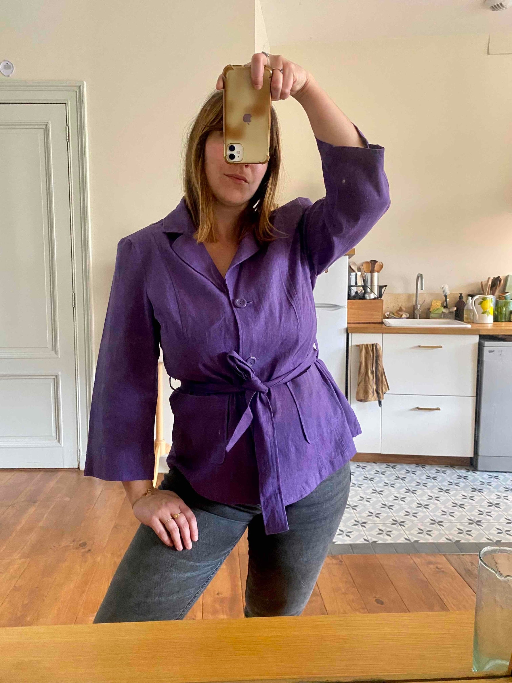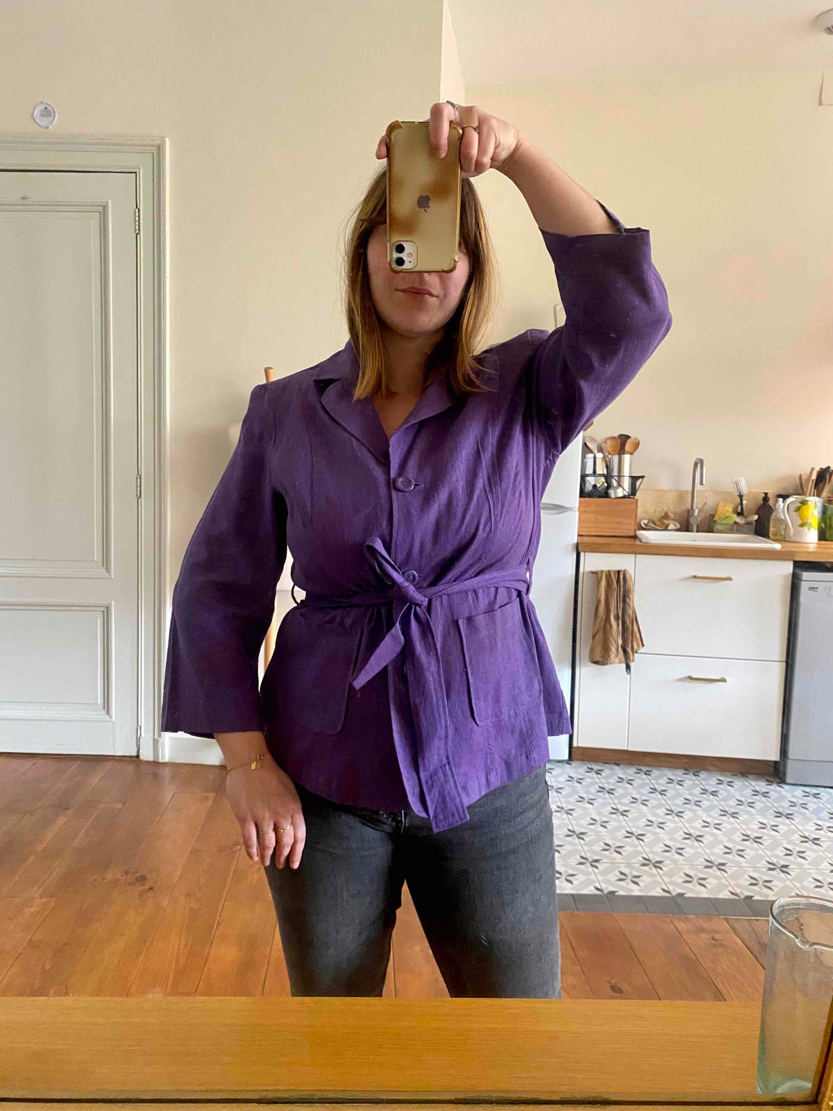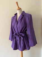 Prix unitaire parSaharienne en Lin violet, lin mélangé majoritaire, épaulettes fines, taille à nouer ceinturée, poches côtés, manches évasées à revers, taille 38/40 porté ici sur un mannequin T36 et une personne T40.