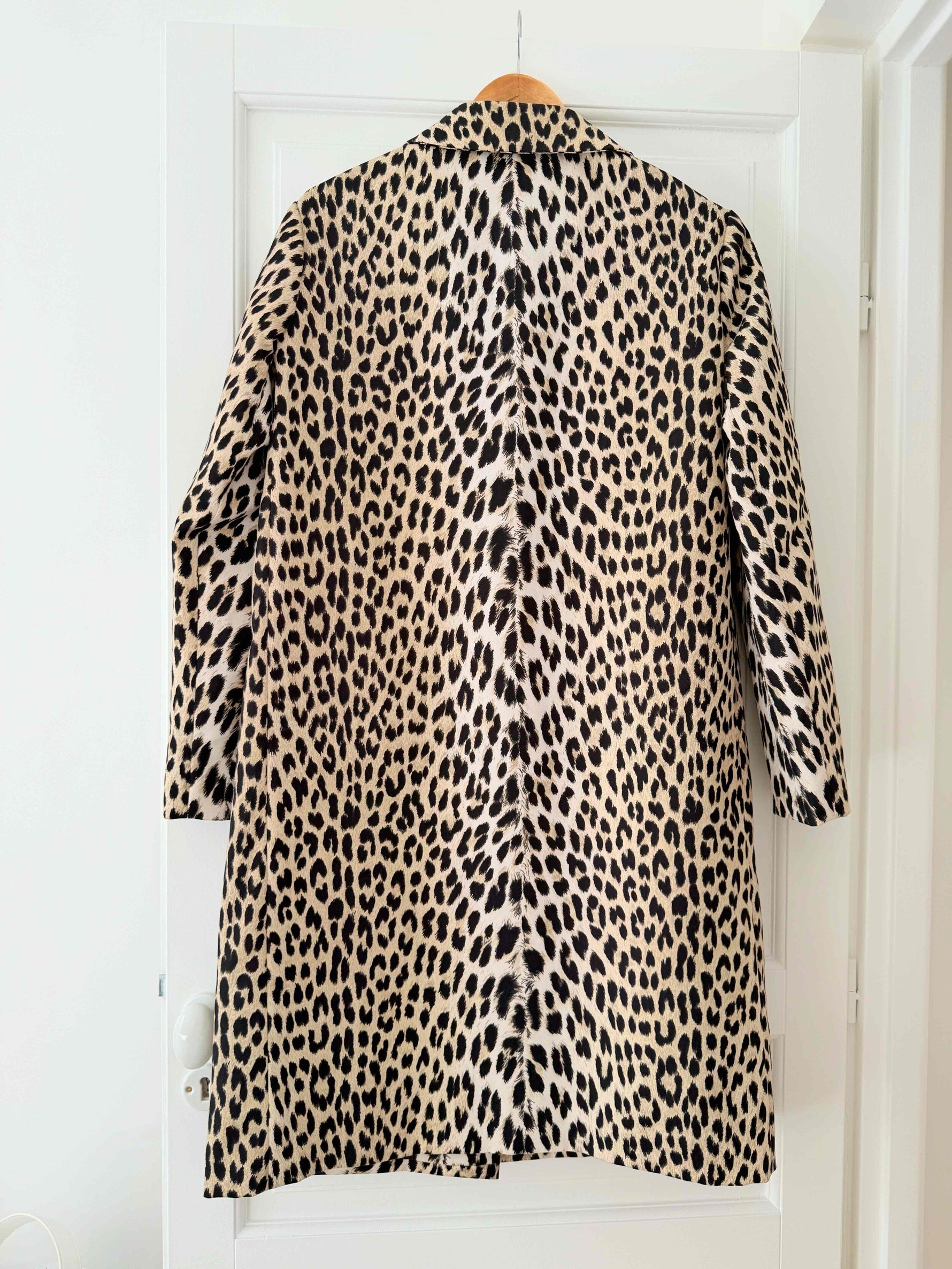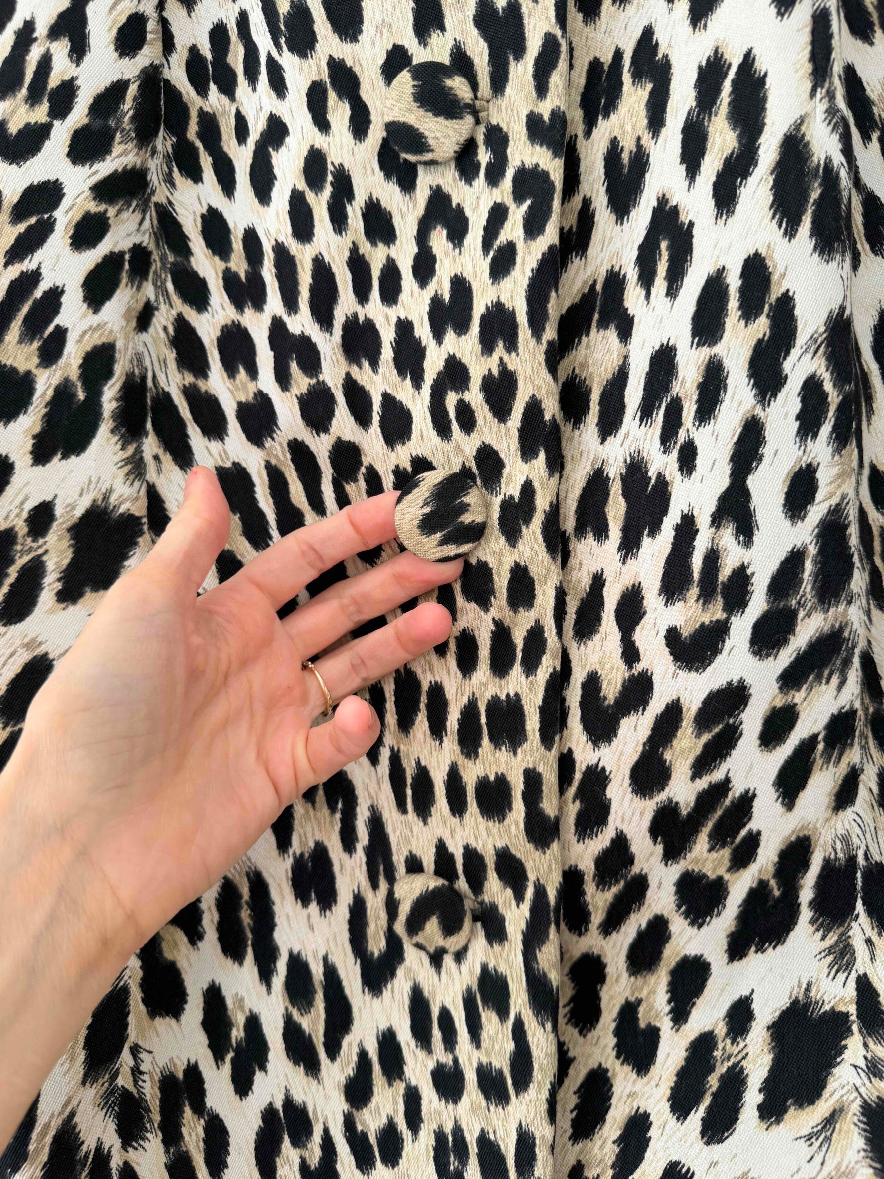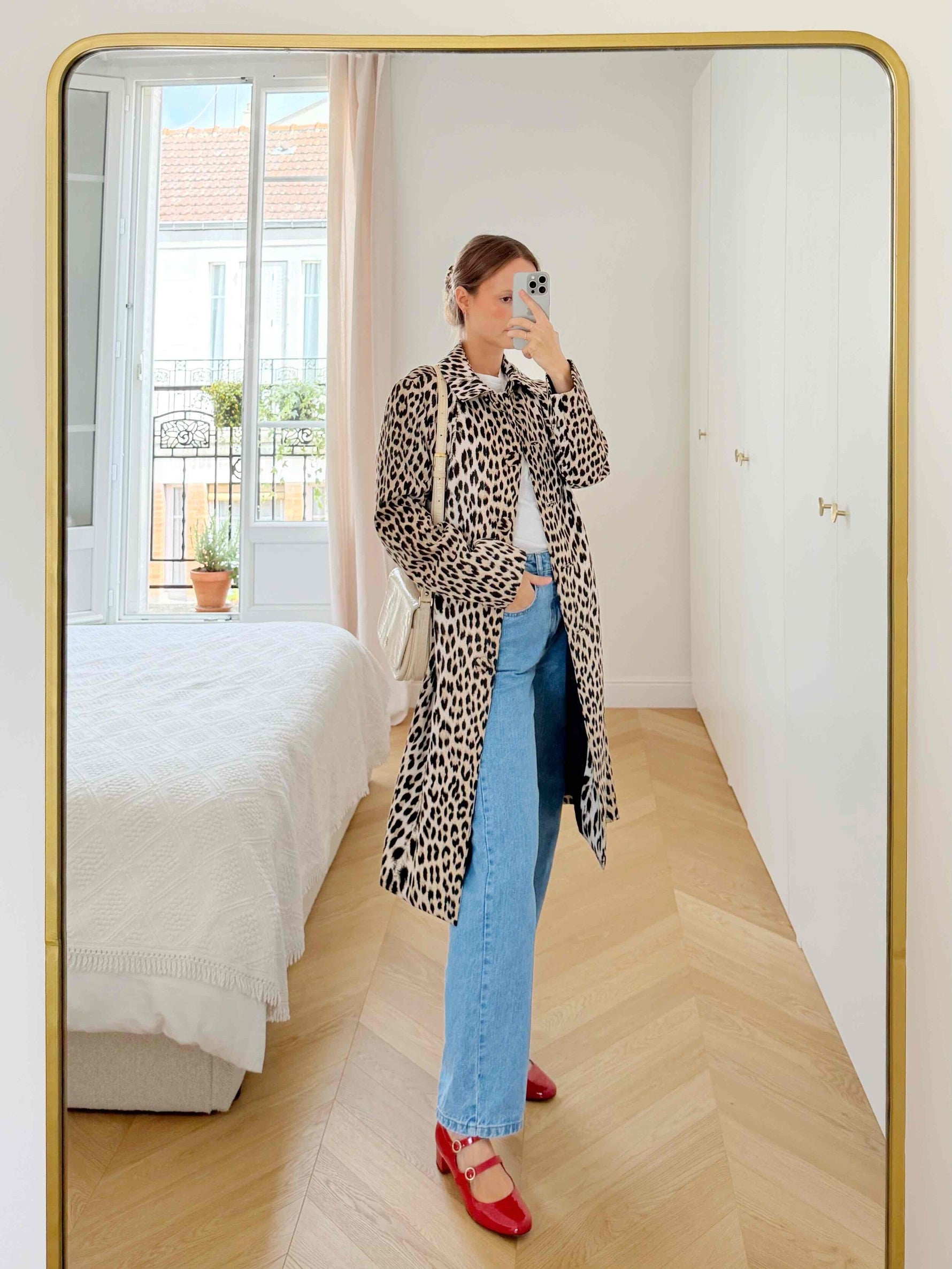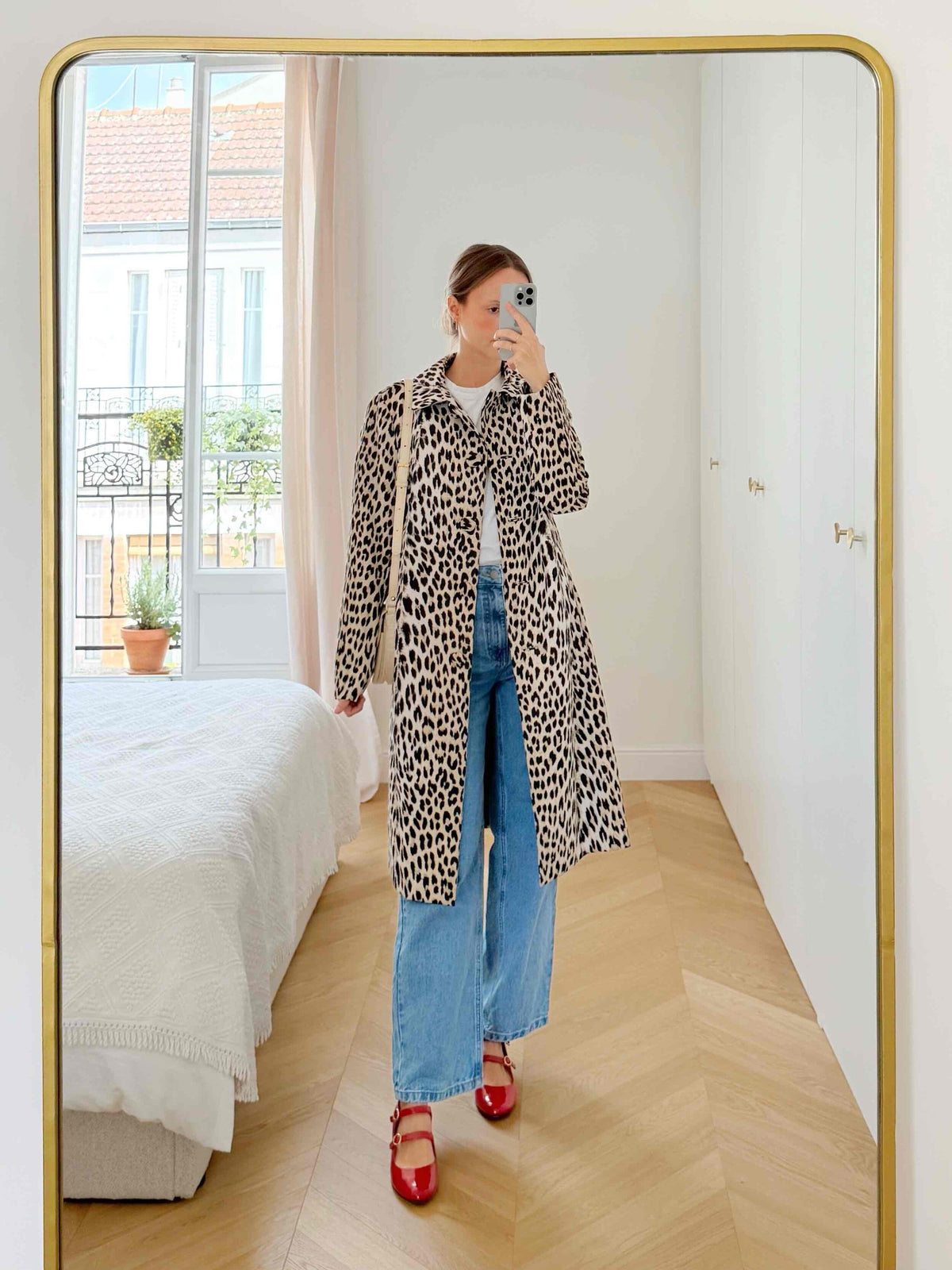 Prix unitaire parTrench léopard, boutonné sur le devant avec de gros boutons ronds. Deux poches latérales. Fabriqué en France. Porté ici sur une taille 36 (1m64).