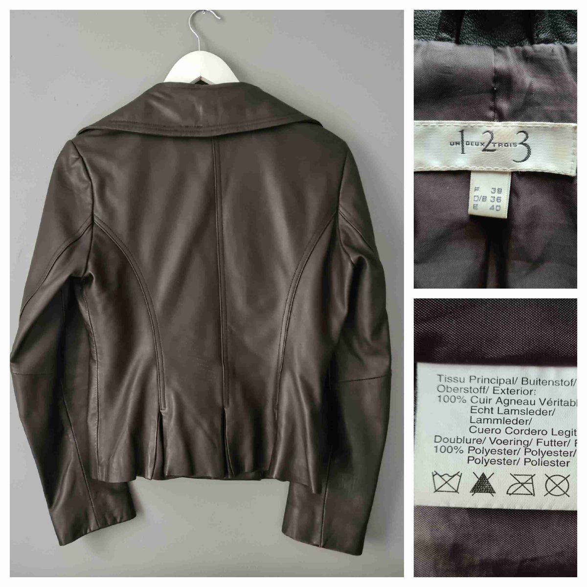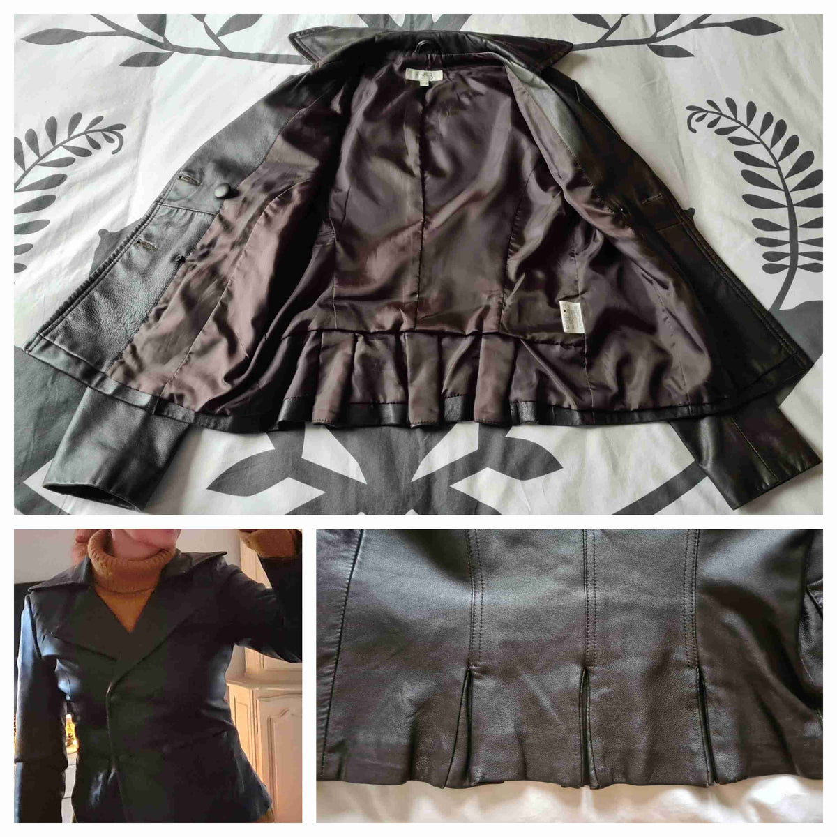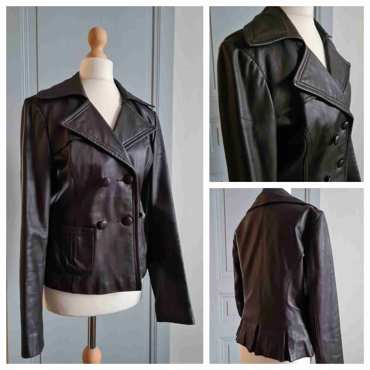 Prix unitaire parVeste courte en cuir, coloris chocolat, croisée deux boutons recouverts, doublée, coupe cintrée avec petits plis creux à l'arrière. 100% cuir d agneau.