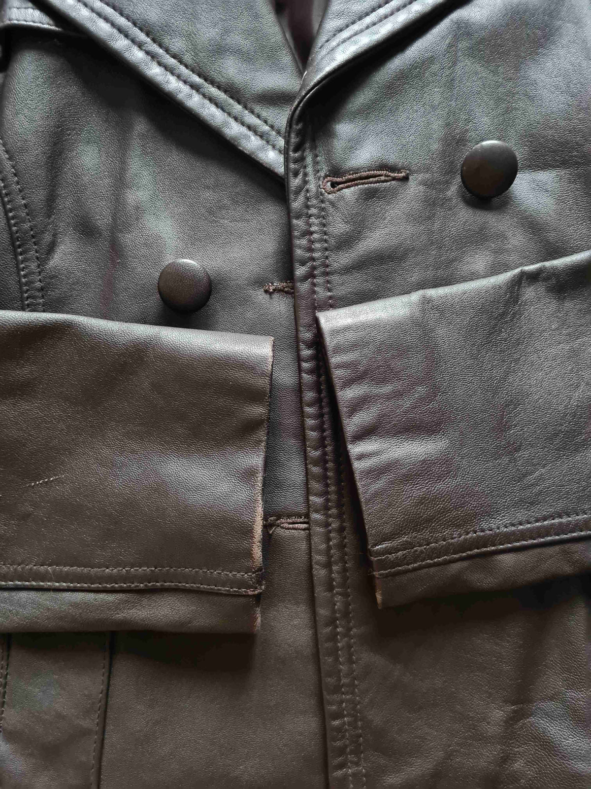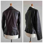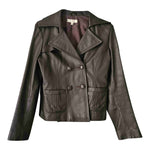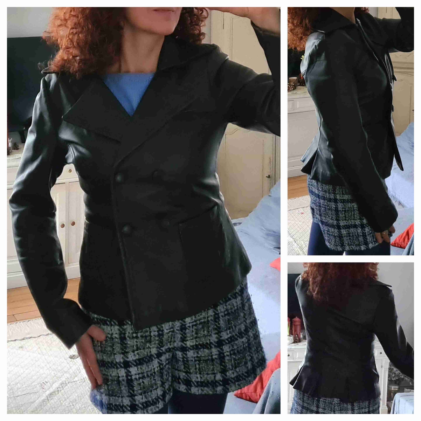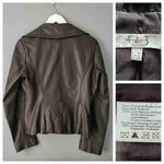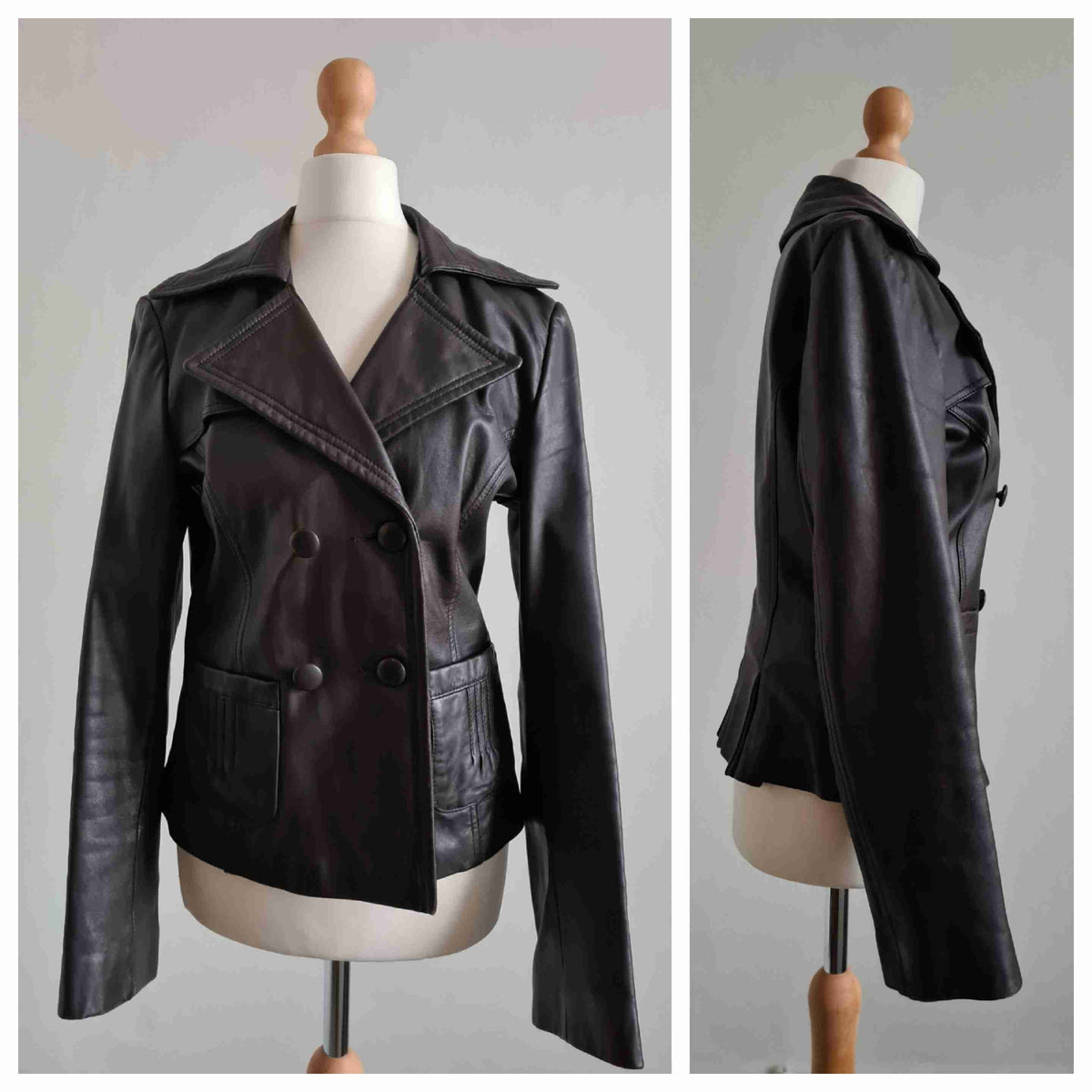 Prix unitaire parVeste courte en cuir, coloris chocolat, croisée deux boutons recouverts, doublée, coupe cintrée avec petits plis creux à l'arrière. 100% cuir d agneau.