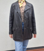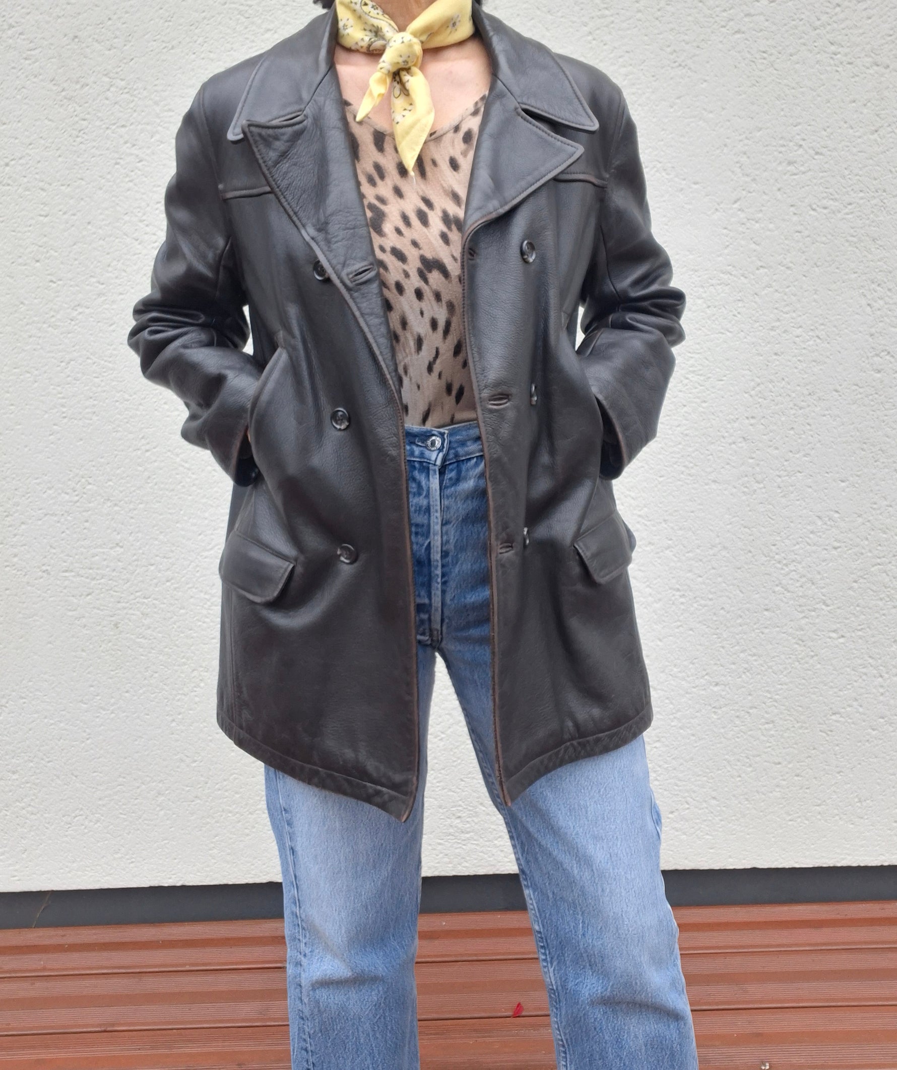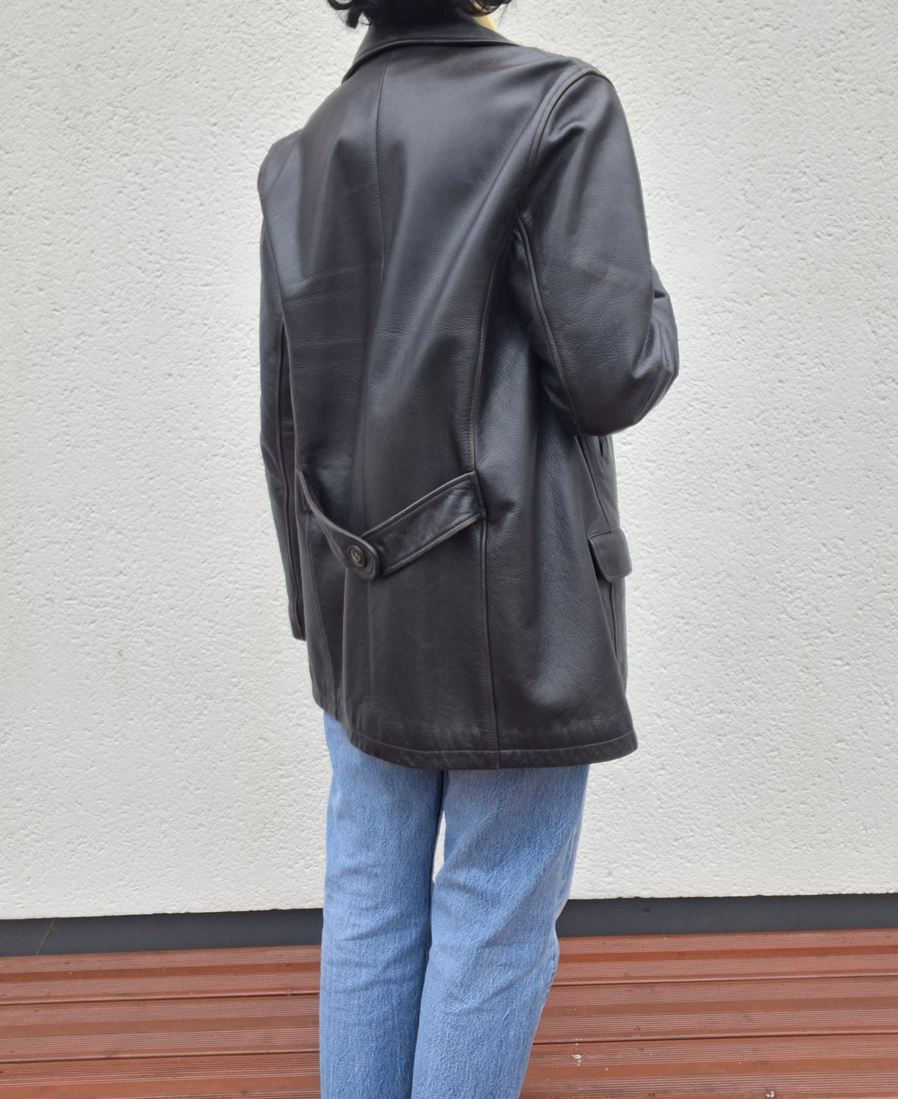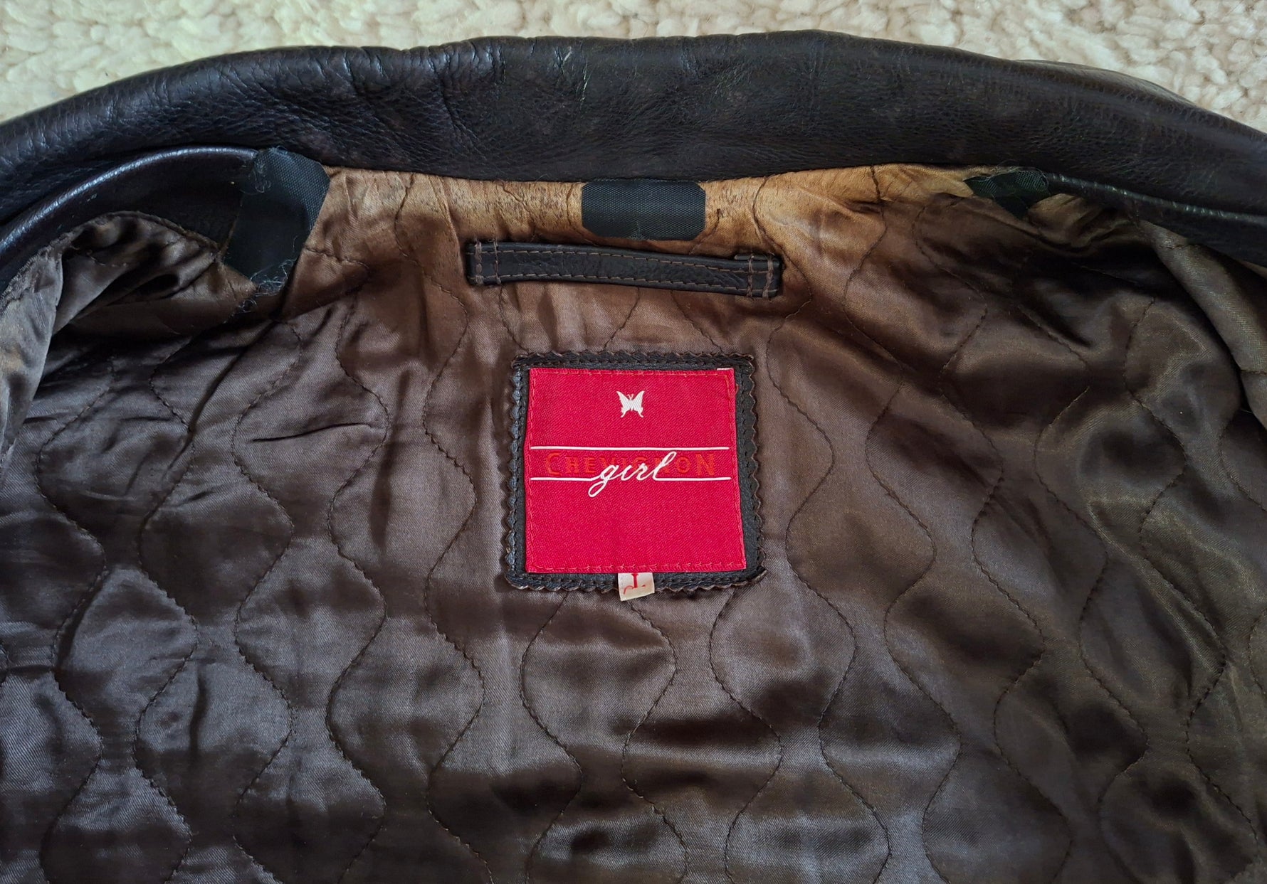 Veste en cuir marron marque Chevignon Girl. Doublure matelassée. Boutons croisés. 2 poches à rabats et 2 autres poches devant. Martingale dans le dos. Portée ajustée par Patricia qui fait une taille 40.Les mesures à plat Épaules 41cm Aisselles 52cm Longueur 73cm. Convient à une taille 36/38. Petite réparation de la doublure du col.