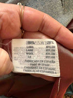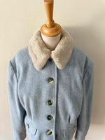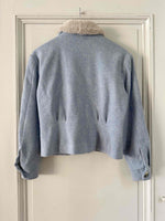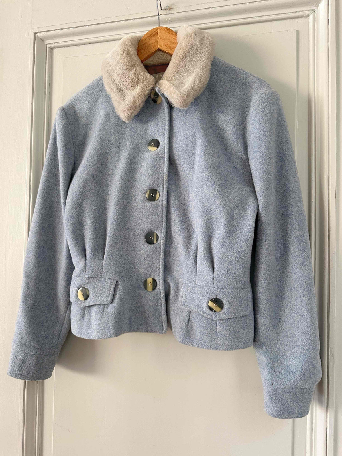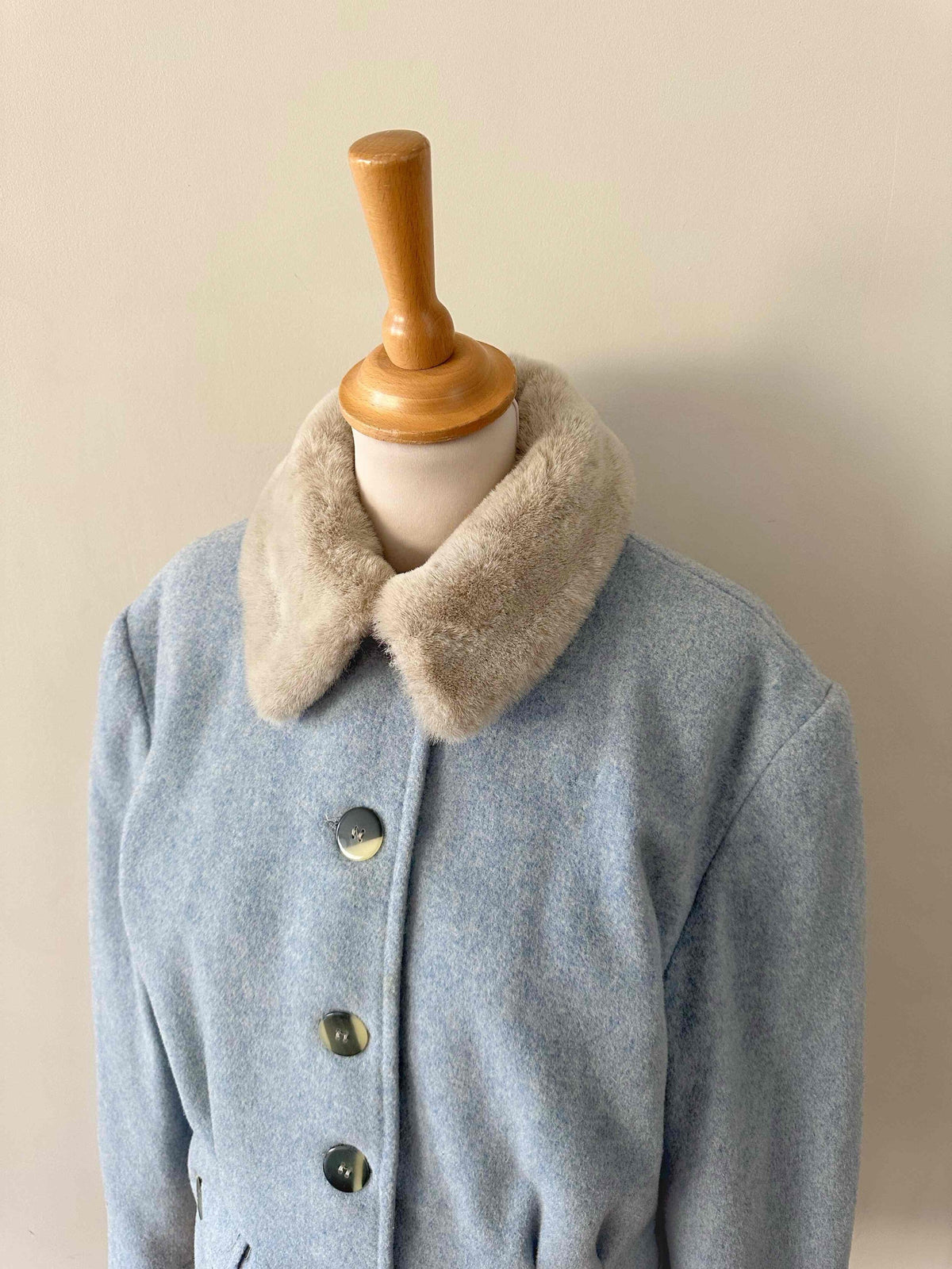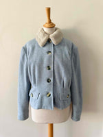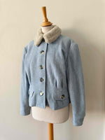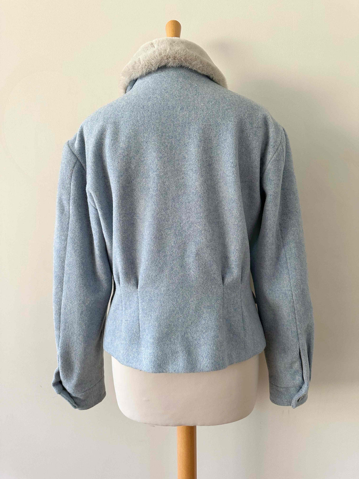 Blazer en laine col fausse fourrure, laine bleu ciel chinée, col en fausse fourrure écrue, manches gorme blouson, taille ceintrée, fabriqué en Espagne, taille 36 porté ici sur un mannequin T36.