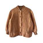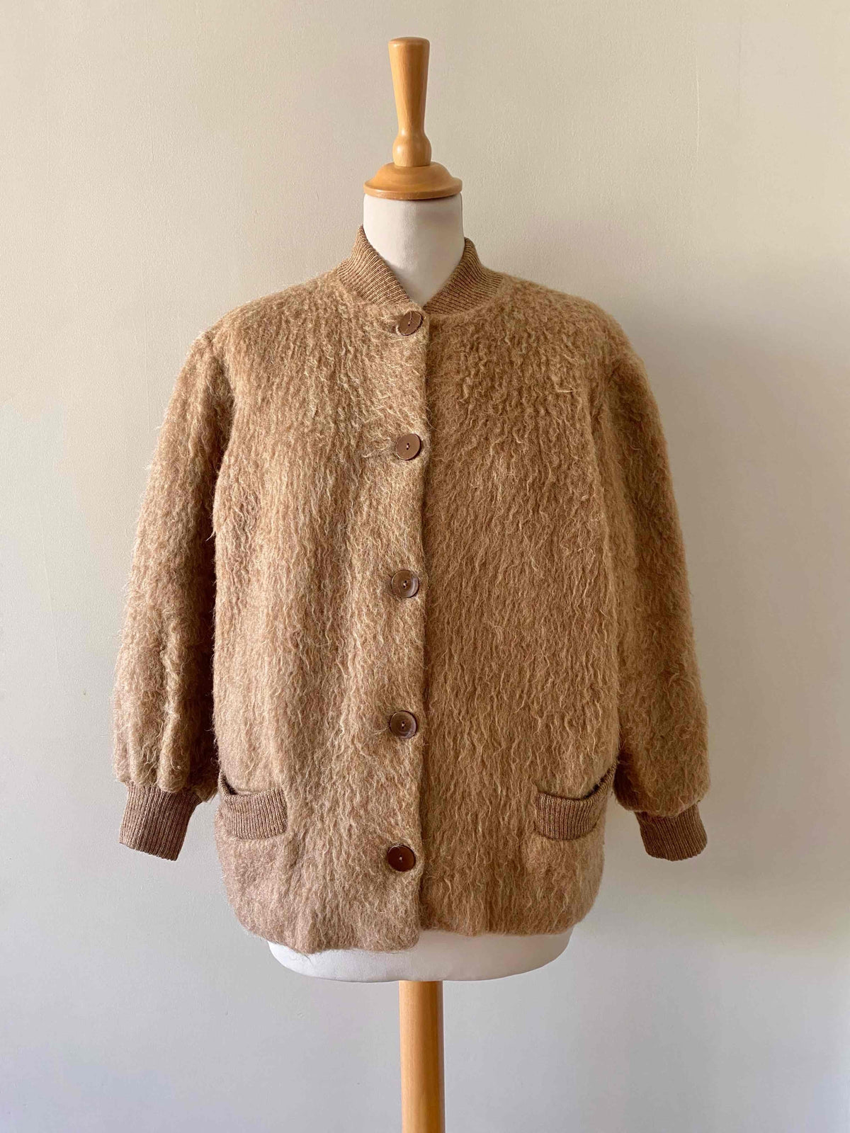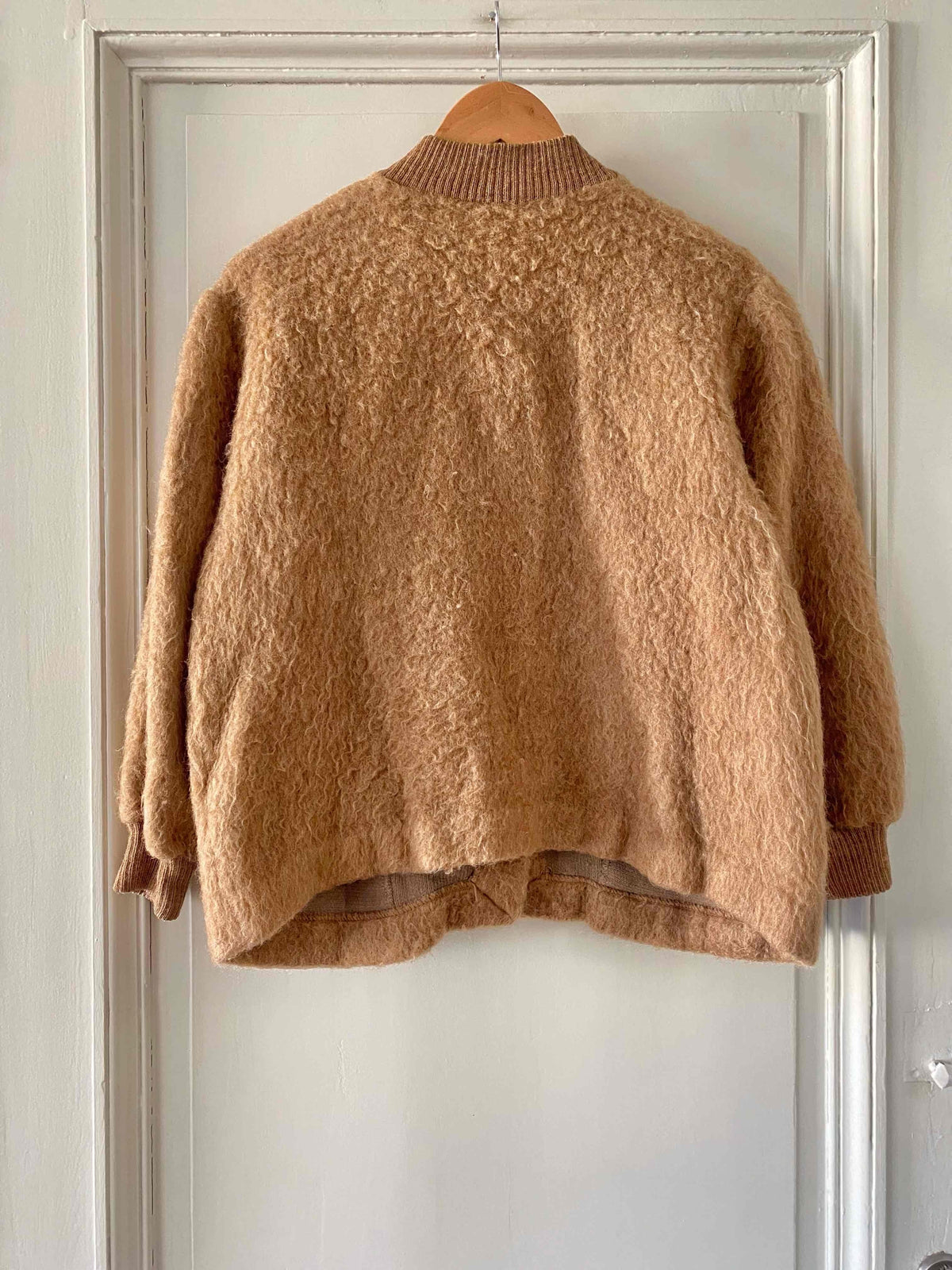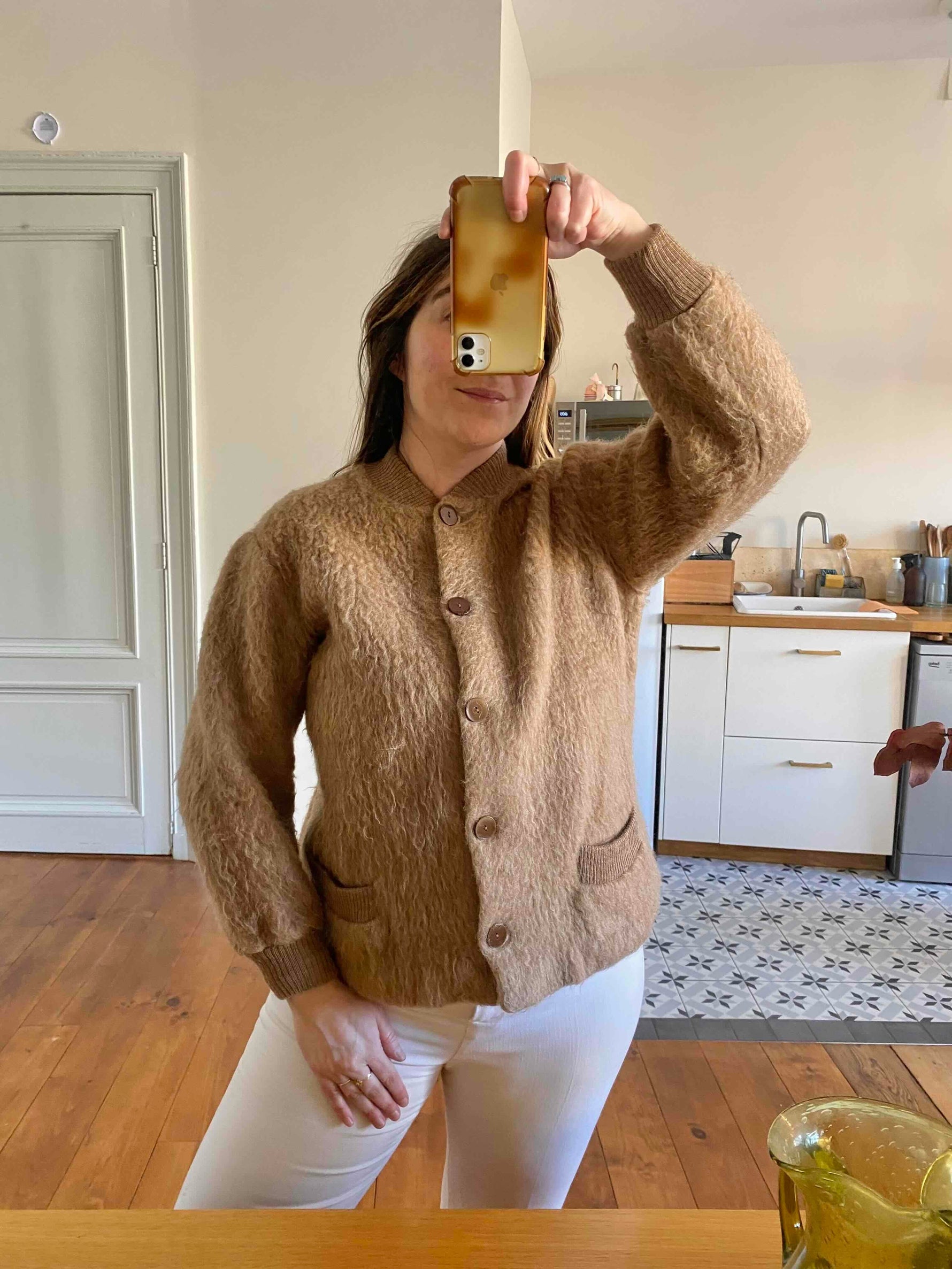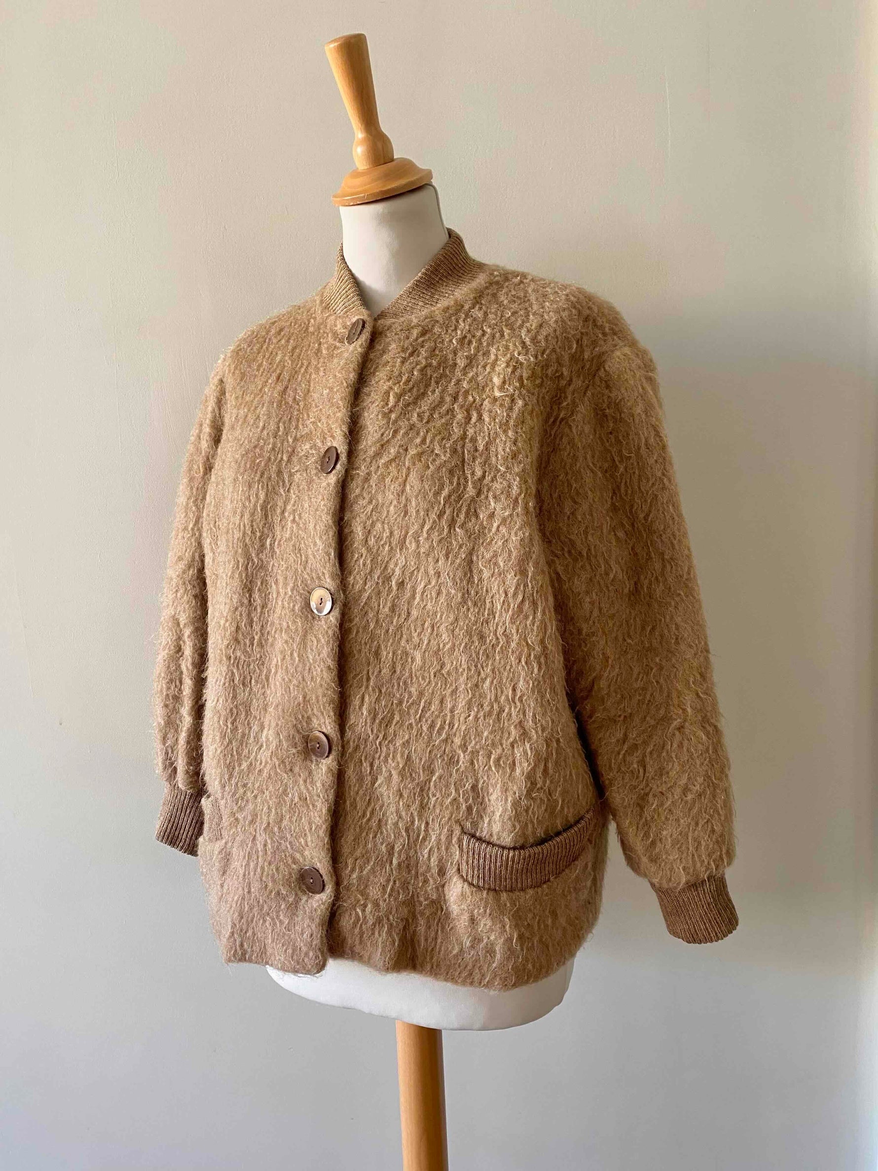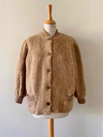 Prix unitaire parVeste en laine de mouton des Pyrénées camel, pure laine de mouton fluffy, bords côtes en coton, fabriqué en France, taille 36 et 38 porté ici sur un mannequin T36 et une personne T40.