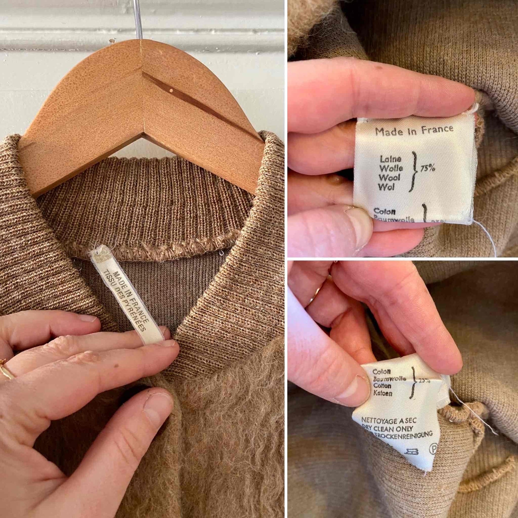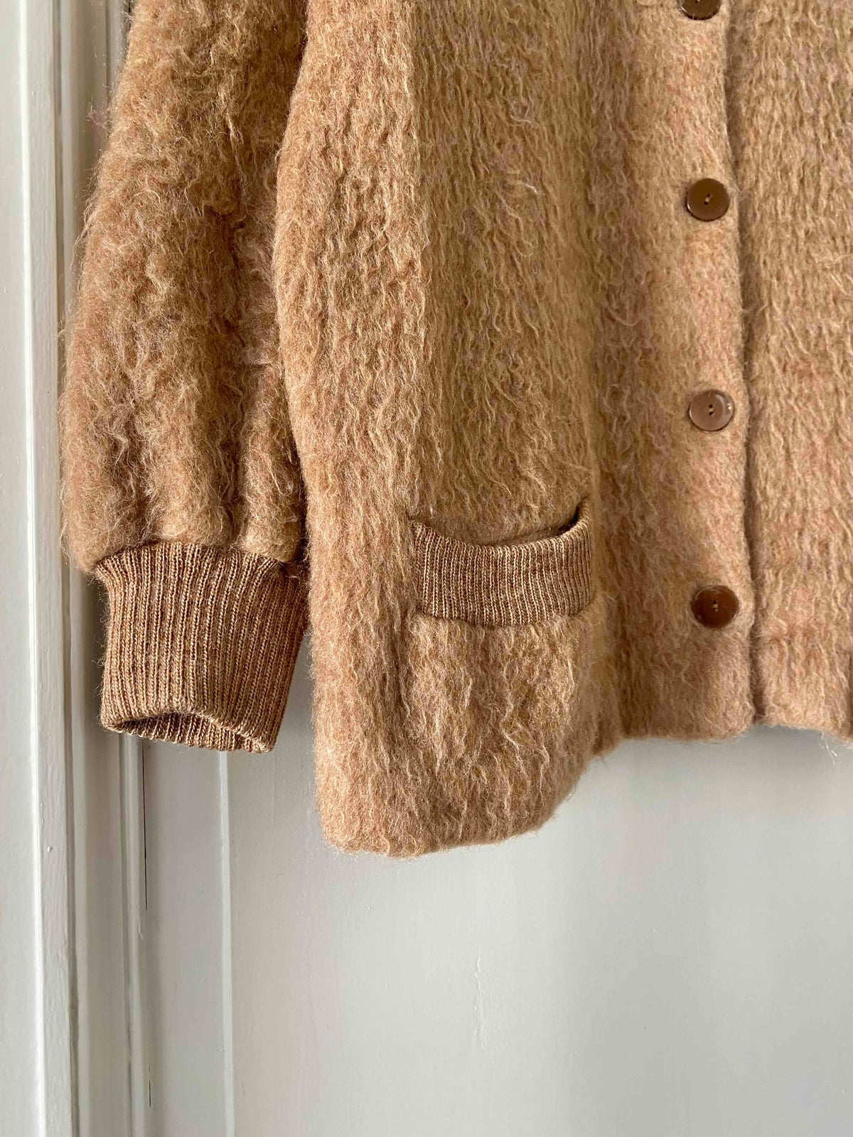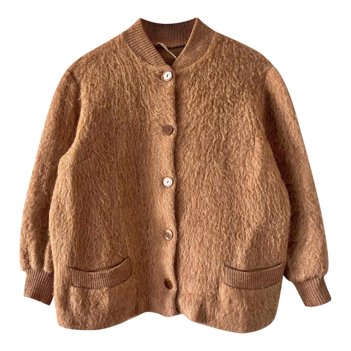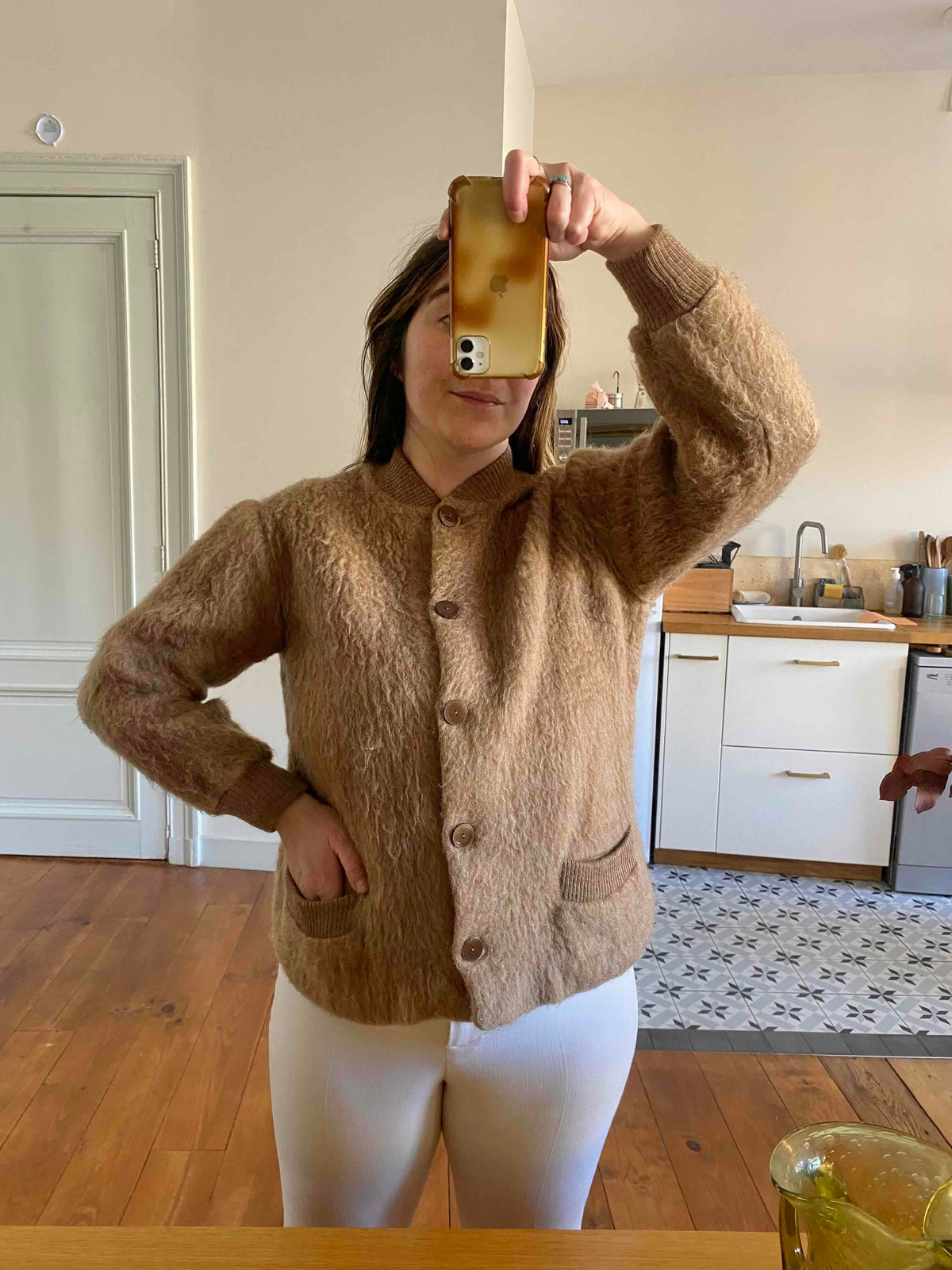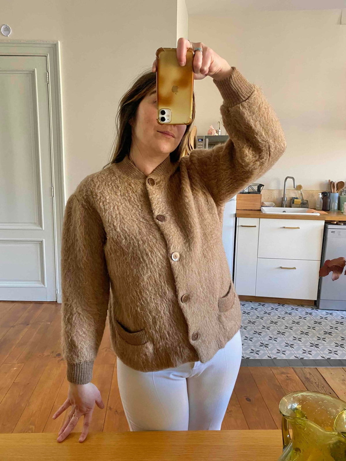 Prix unitaire parVeste en laine de mouton des Pyrénées camel, pure laine de mouton fluffy, bords côtes en coton, fabriqué en France, taille 36 et 38 porté ici sur un mannequin T36 et une personne T40.