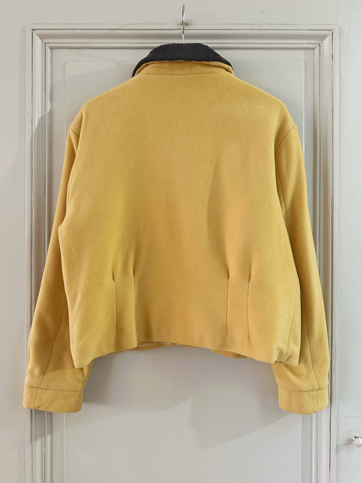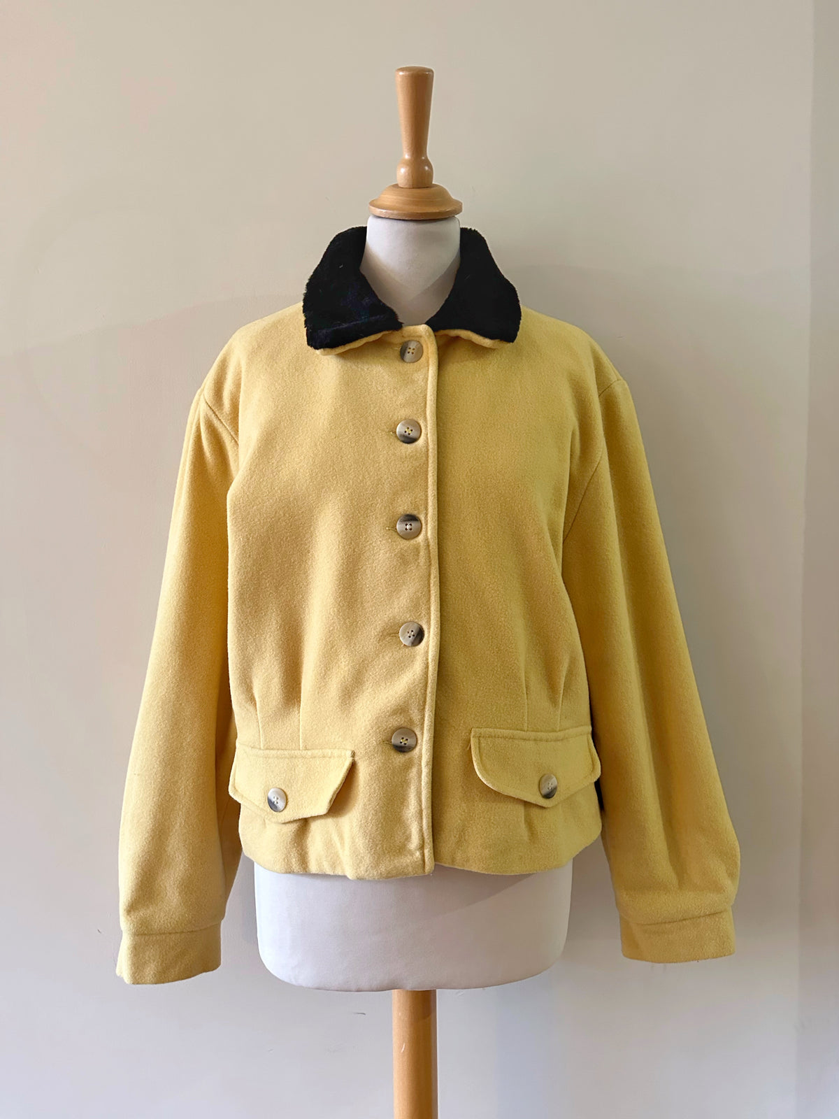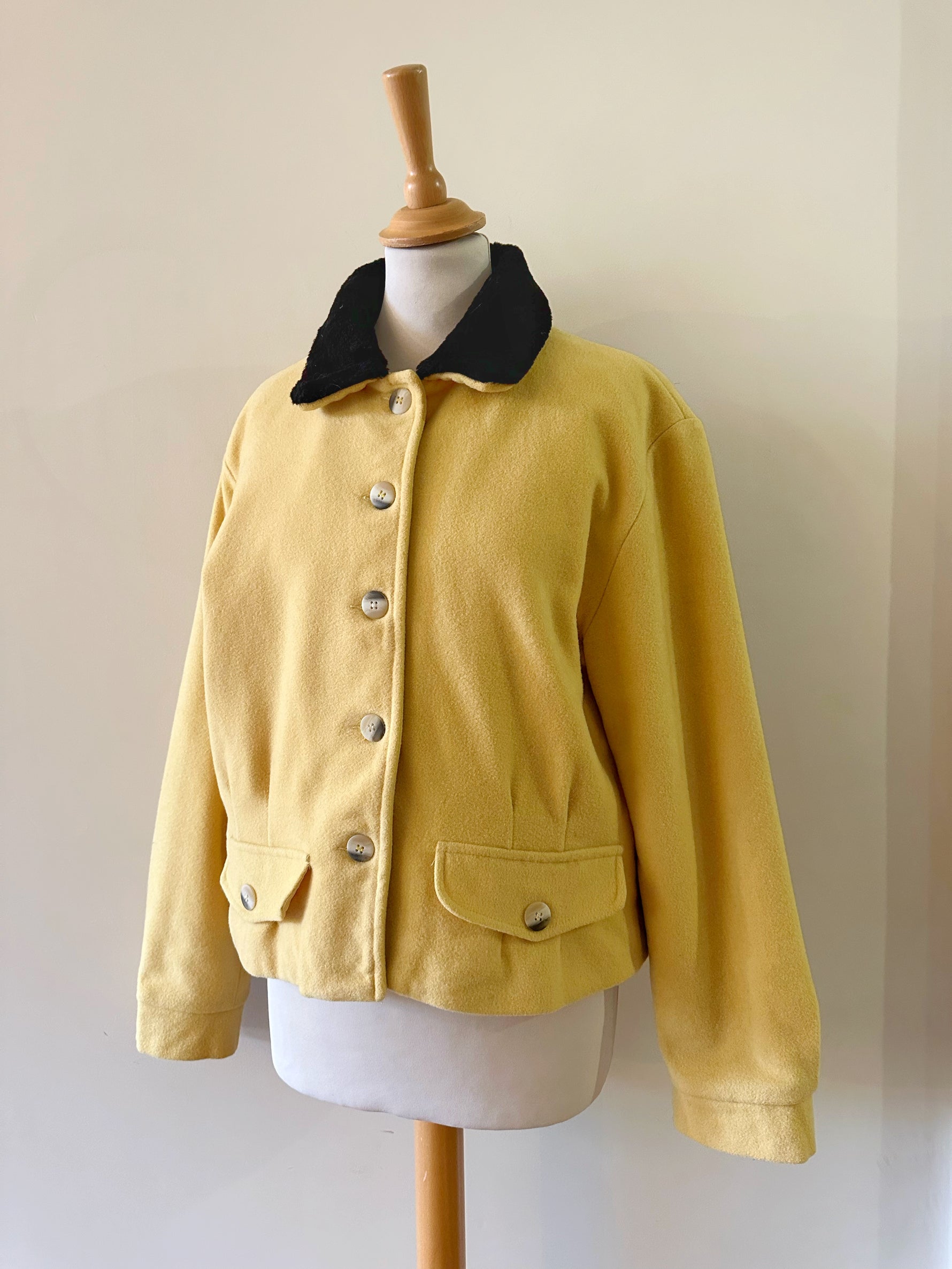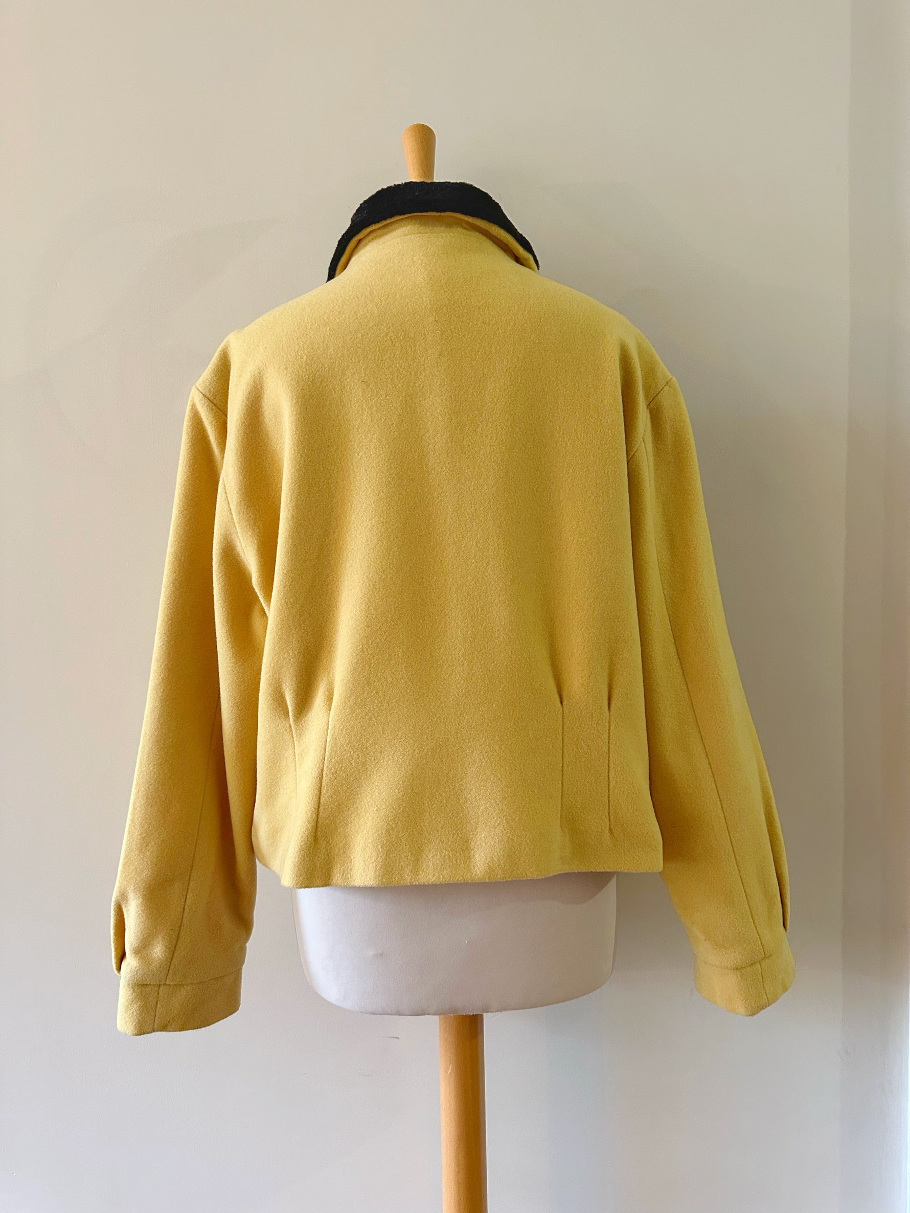 Veste en laine jaune poussin, col en fausse fourrure noire, manches forme blouson, taille cintrée, fabriquée en France. Convient aux tailles 38 et 40 portée ici sur une personne T40 et sur un mannequin T36. AIsselles 50cm Longueur 56cm.