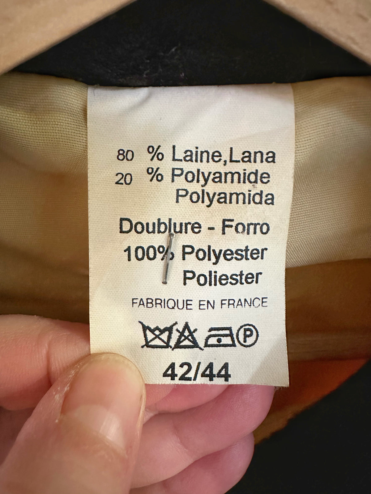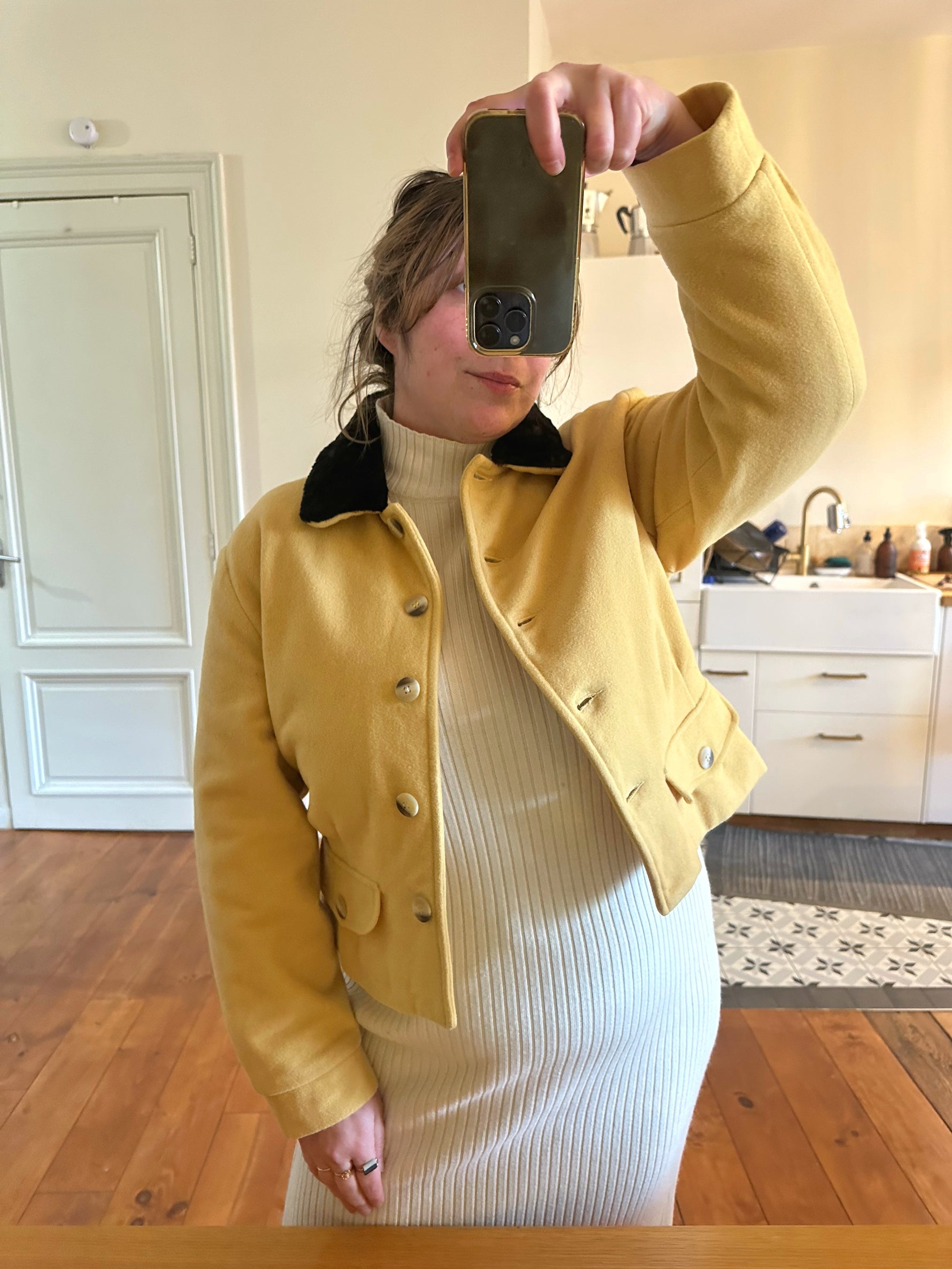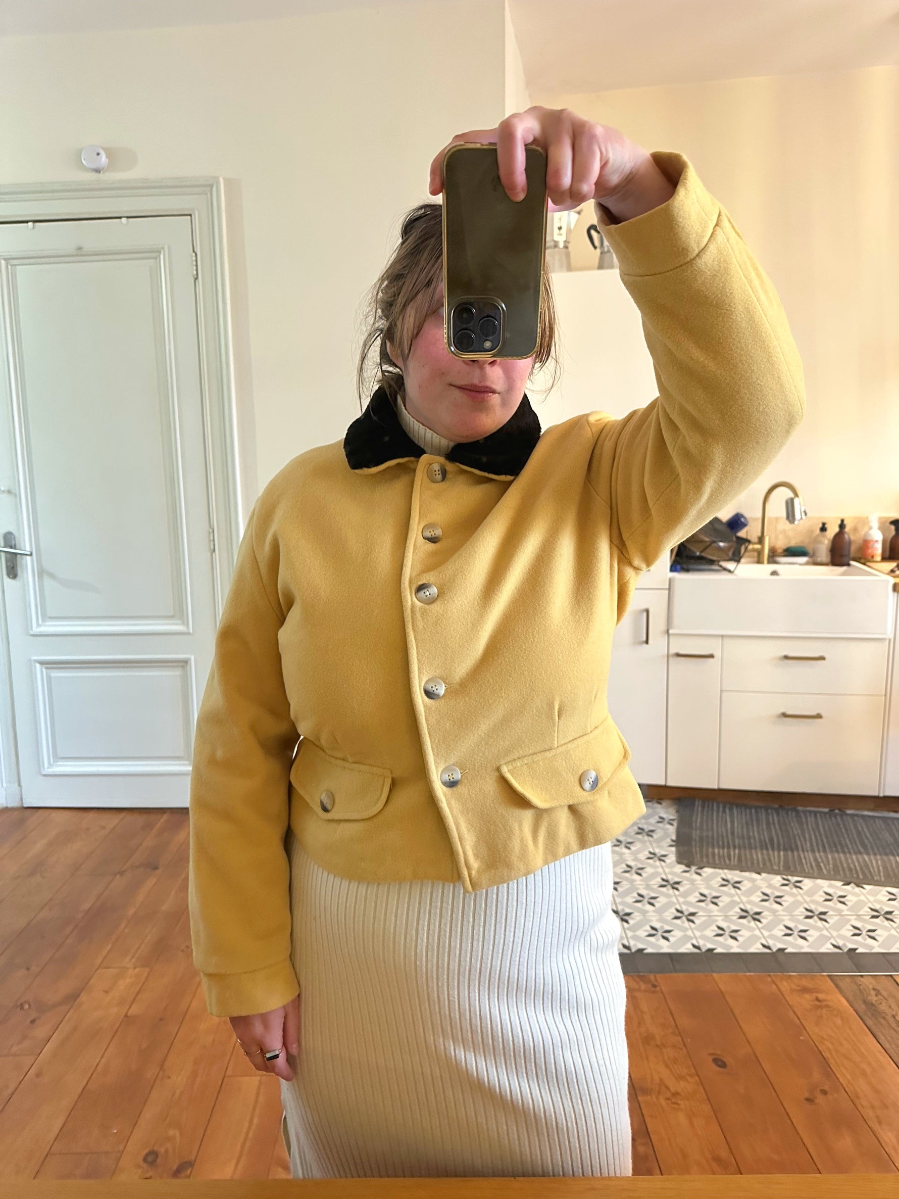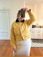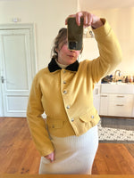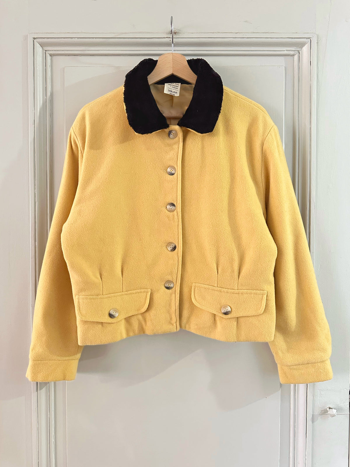 Veste en laine jaune poussin, col en fausse fourrure noire, manches forme blouson, taille cintrée, fabriquée en France. Convient aux tailles 38 et 40 portée ici sur une personne T40 et sur un mannequin T36. AIsselles 50cm Longueur 56cm.
